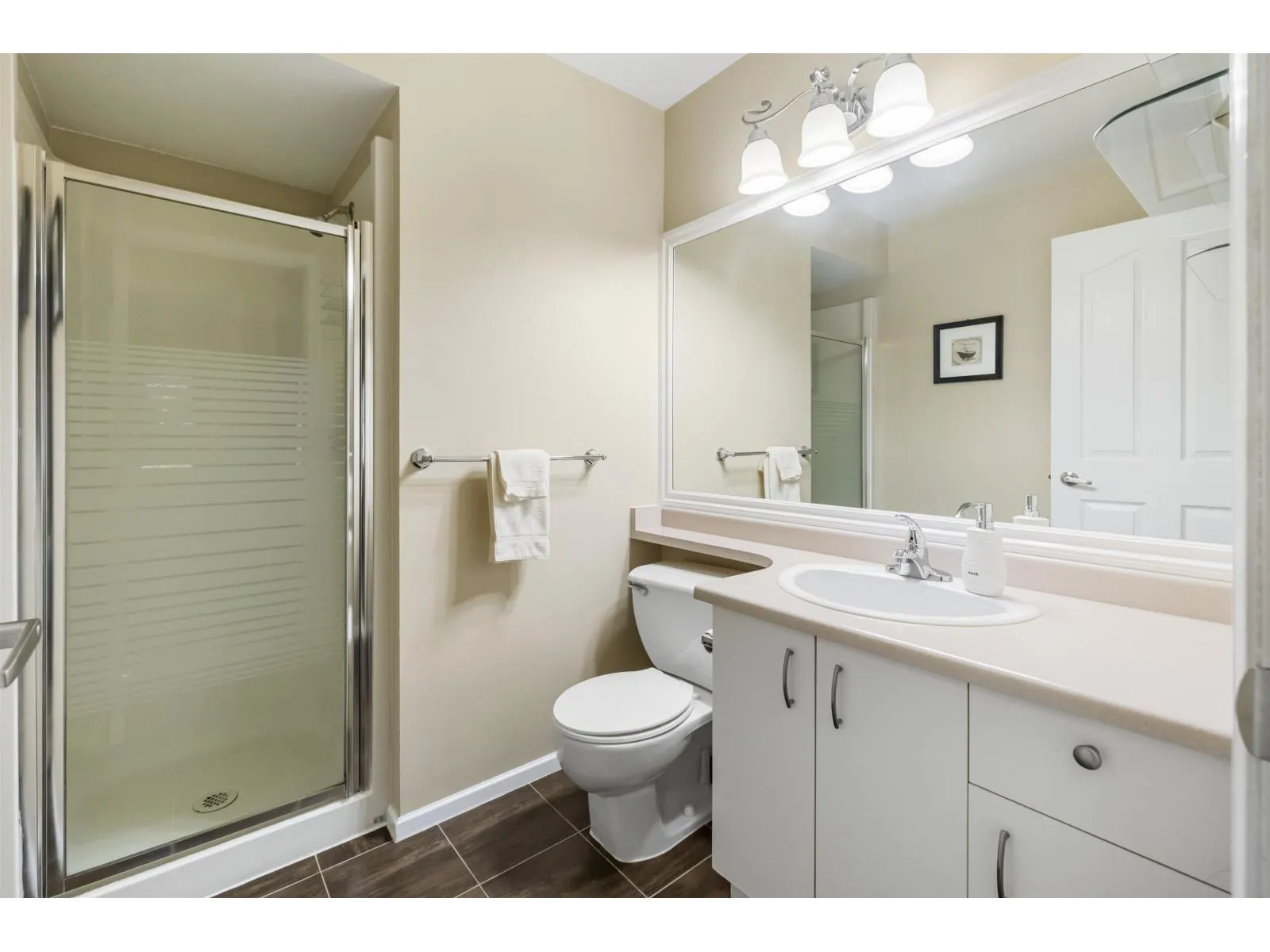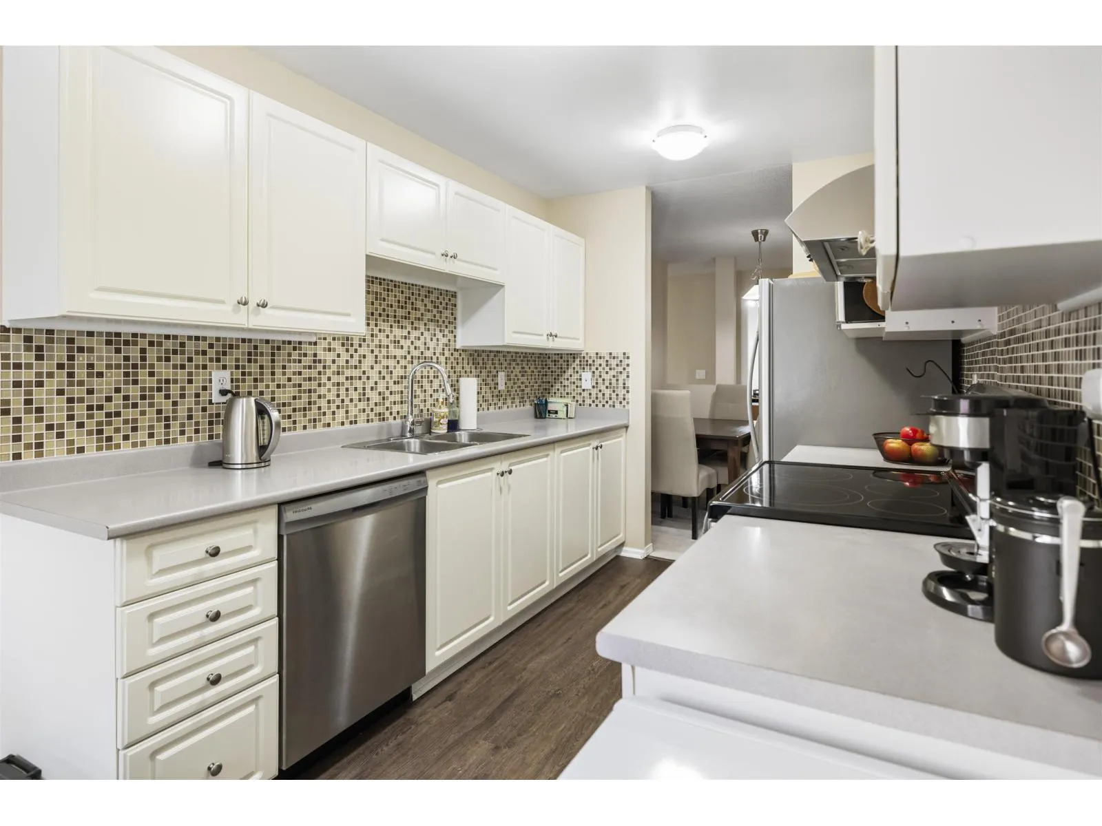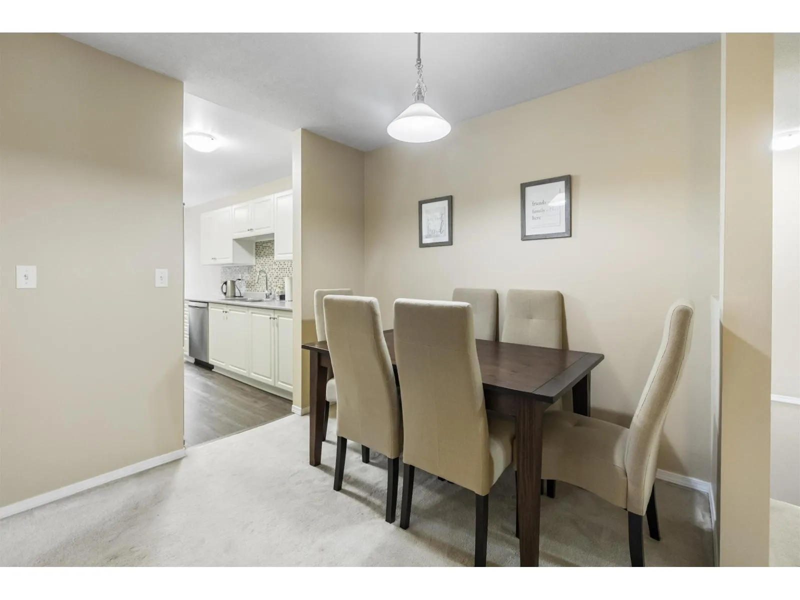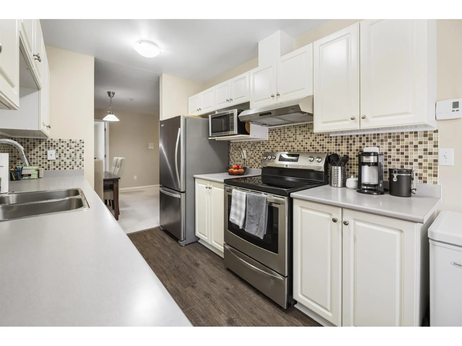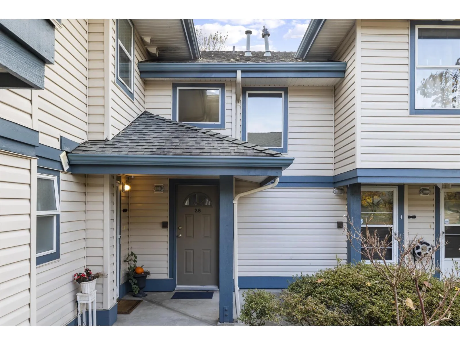 Welcome home to The Meadows. This large 3 bedroom 2 bathroom upper unit townhome offers over 1300 sq ft of well laid out space and no one above you. A corner unit with lots of natural light and extra windows. Enjoy additional privacy from the East facing deck with a view of the trees. All bedrooms are a good size, perfect for a growing family or for those who work from home. There's an eating area in the kitchen, plus a full size dining room. Cozy up in the living room next to the gas fireplace. Newer blinds, updated hot water tank, stainless steel appliances, and kitchen flooring. Large entrance foyer with plenty of storage. Parking for 2, one in the shared garage and one on the pad outside. Terrific central location within walking distance to shopping, parks, schools, and transit. (id:27476)