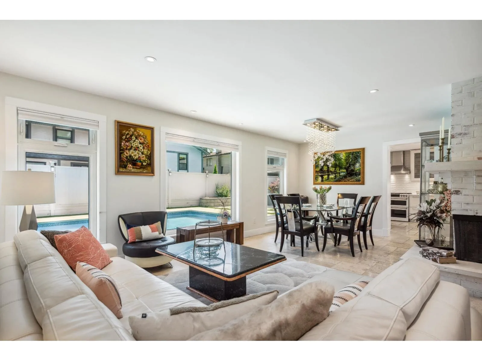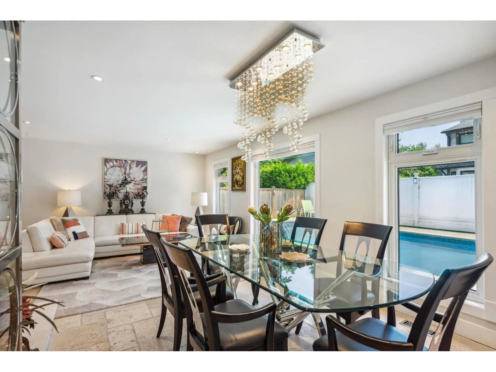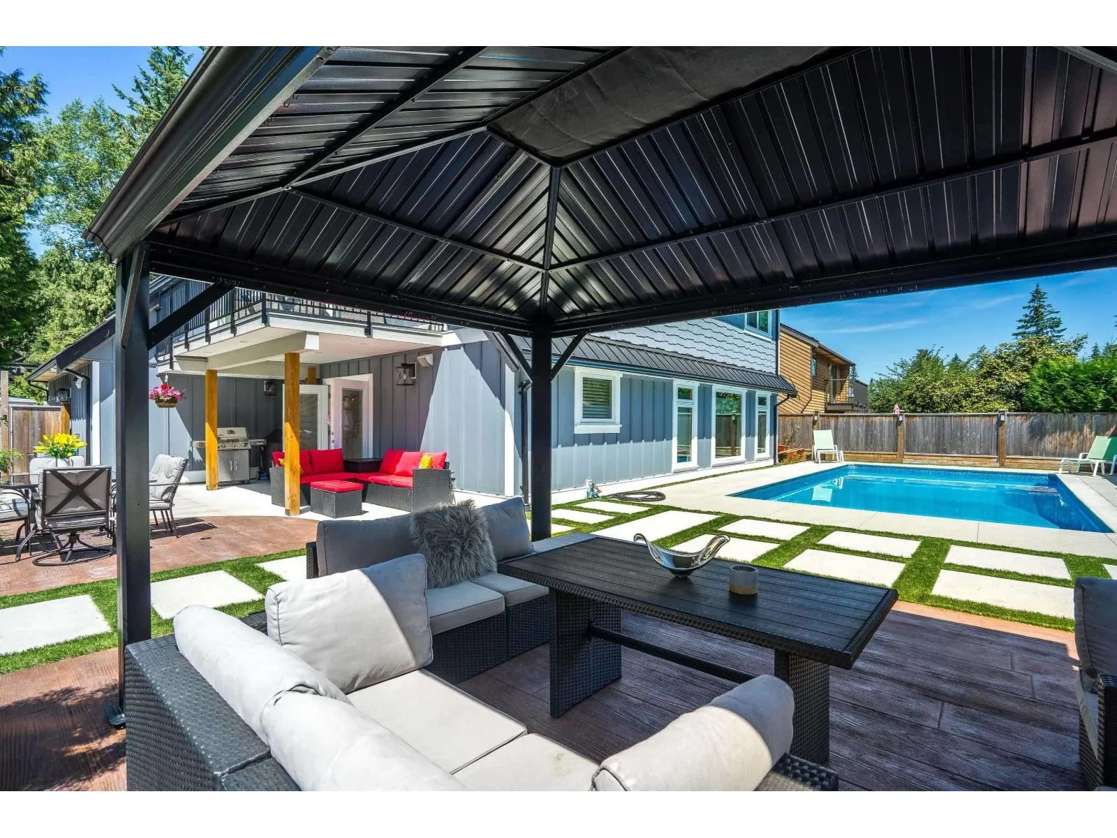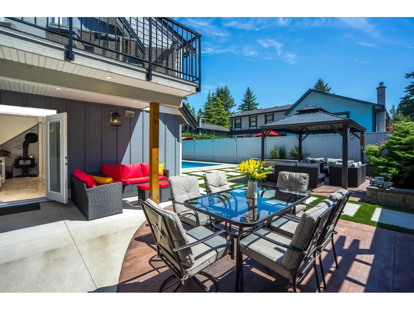 Stunning executive home on an award-winning street, perfectly blending luxury and function. Features a new roof, Hardie siding, updated garage doors, and a backyard oasis with saltwater pool, gazebo, gas BBQ hookup, and new concrete landscaping. Inside, enjoy a gourmet kitchen with Caesarstone counters, GE Café appliances, wine fridge, wet bar, and travertine floors. Main-level bedroom plus an expansive primary suite with deck access. Flex space upstairs ideal for a family room or suite. Perfect for entertaining, relaxing, and everyday living. (id:27476)