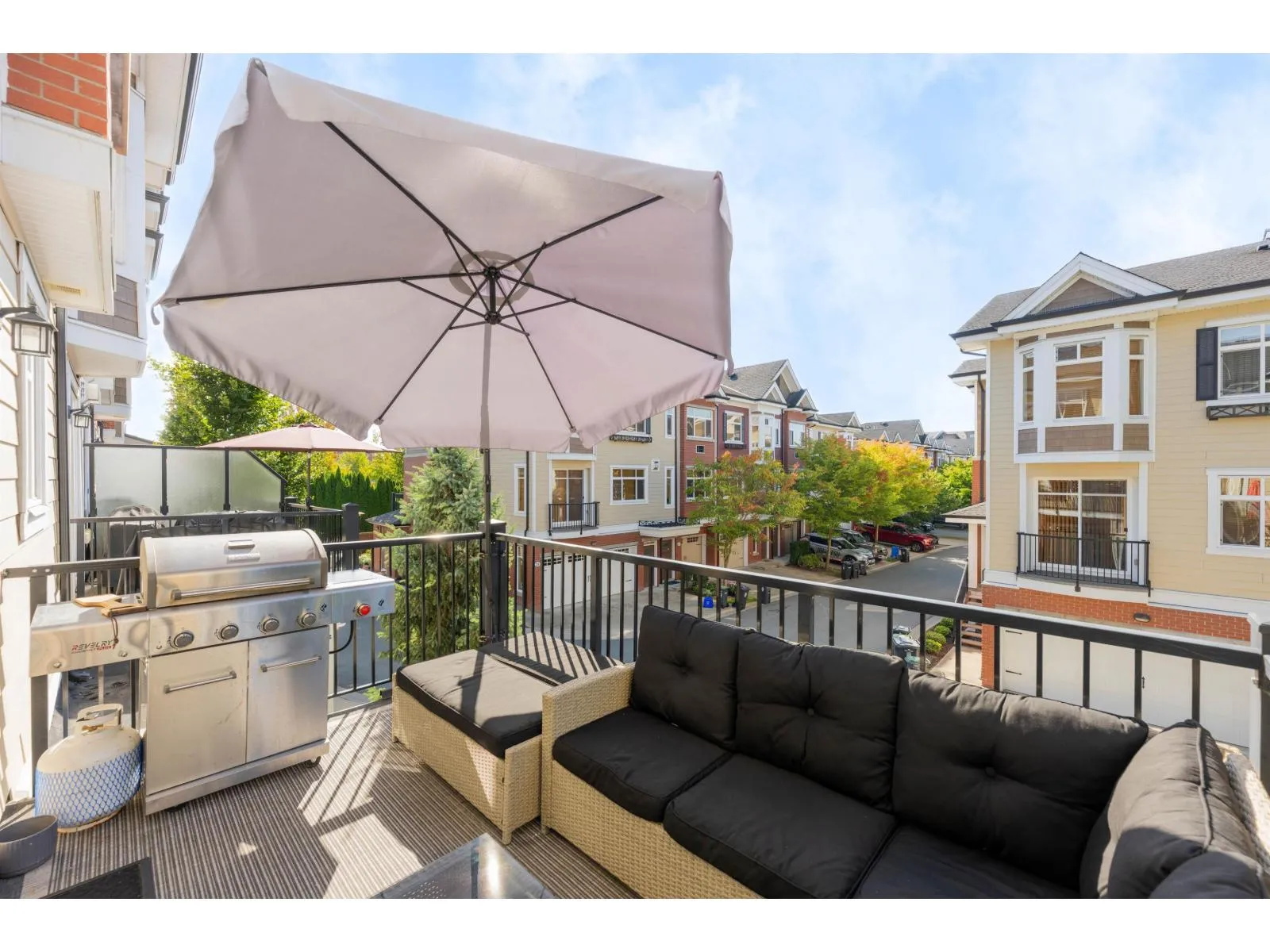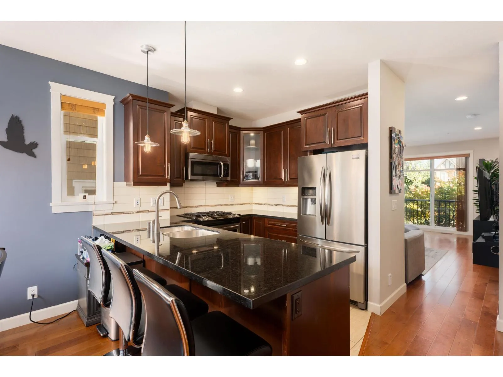 This large end-unit townhome checks all the boxes - space, style, and unbeatable value! Offering nearly 1,800 sqft of bright, open living space with 3 bedrooms, 3 bathrooms, and a den that could easily be used as a 4th bedroom or home office with its own separate entrance. Inside, you'll love the maple hardwood floors, granite counters, fresh paint, and solid wood doors throughout. The main floor features a powder room and a spacious kitchen with stainless steel appliances. Stay comfortable year-round with a new heat pump for efficient forced-air heating & A/C and tankless hot water on demand. The primary suite impresses with vaulted ceilings, heated floors, double sinks, and a fog-free mirror. Outside, enjoy a large deck with gas BBQ hookup, and park your truck in the extended covered driveway. (id:27476)