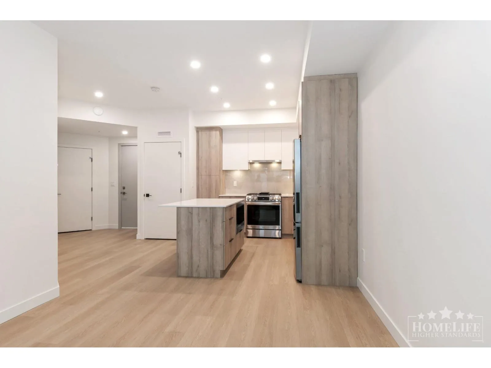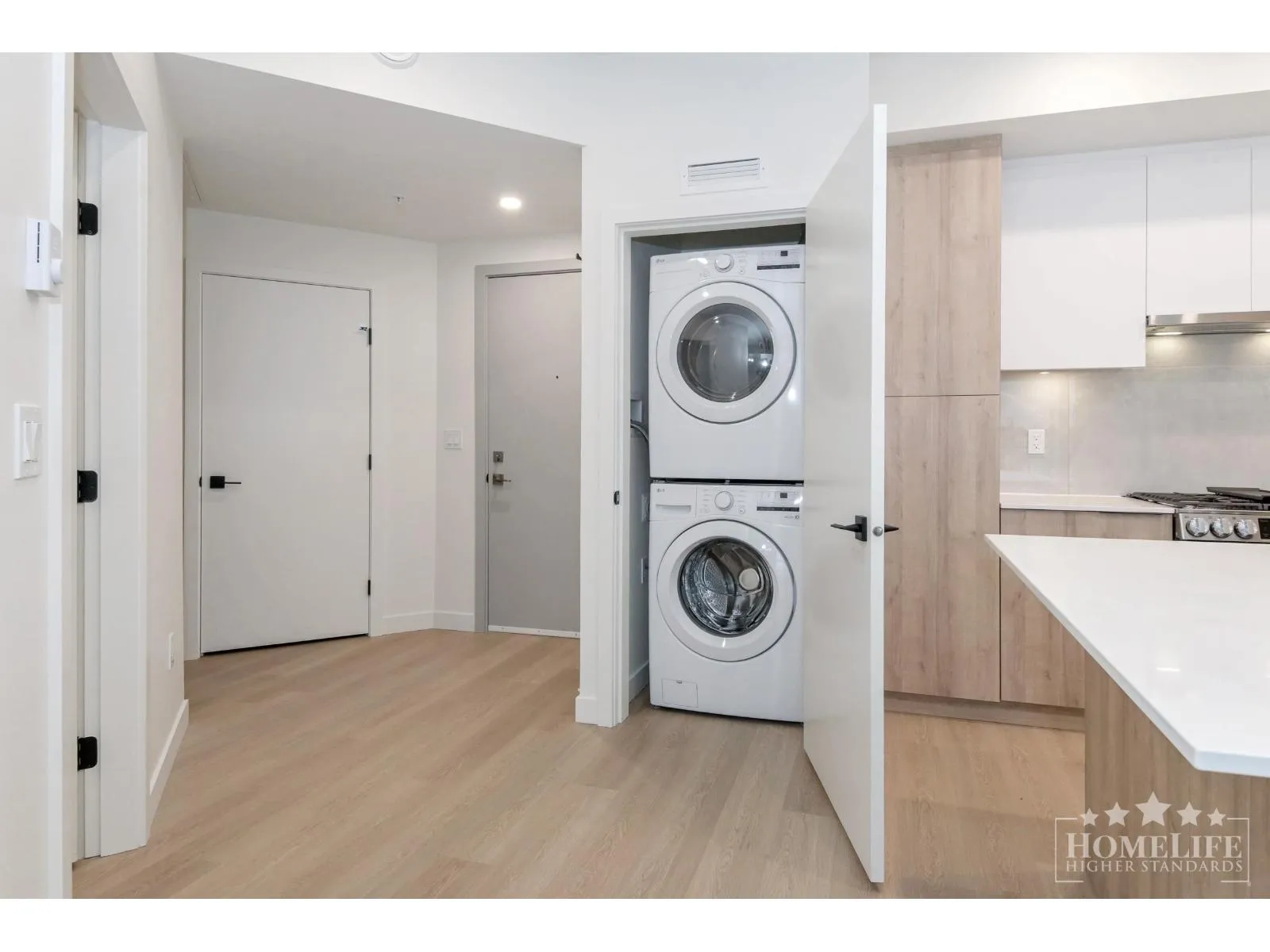 Experience contemporary comfort at The District at Willoughby, Langley's vibrant new community. This bright 1-bedroom + den home offers about 600 sq. ft. of open, modern living with sleek finishes, stainless steel appliances, in-suite laundry, and a private balcony with city and mountain views. Enjoy two rare parking stalls and a storage locker. Building amenities include a rooftop deck with gardens, seating, and play area. Steps to shops, dining, parks, and transit, with easy access to Hwy 1 and 200 St. 1-year lease. No pets/smoking. Tenant insurance, credit, and income verification required. (id:27476)