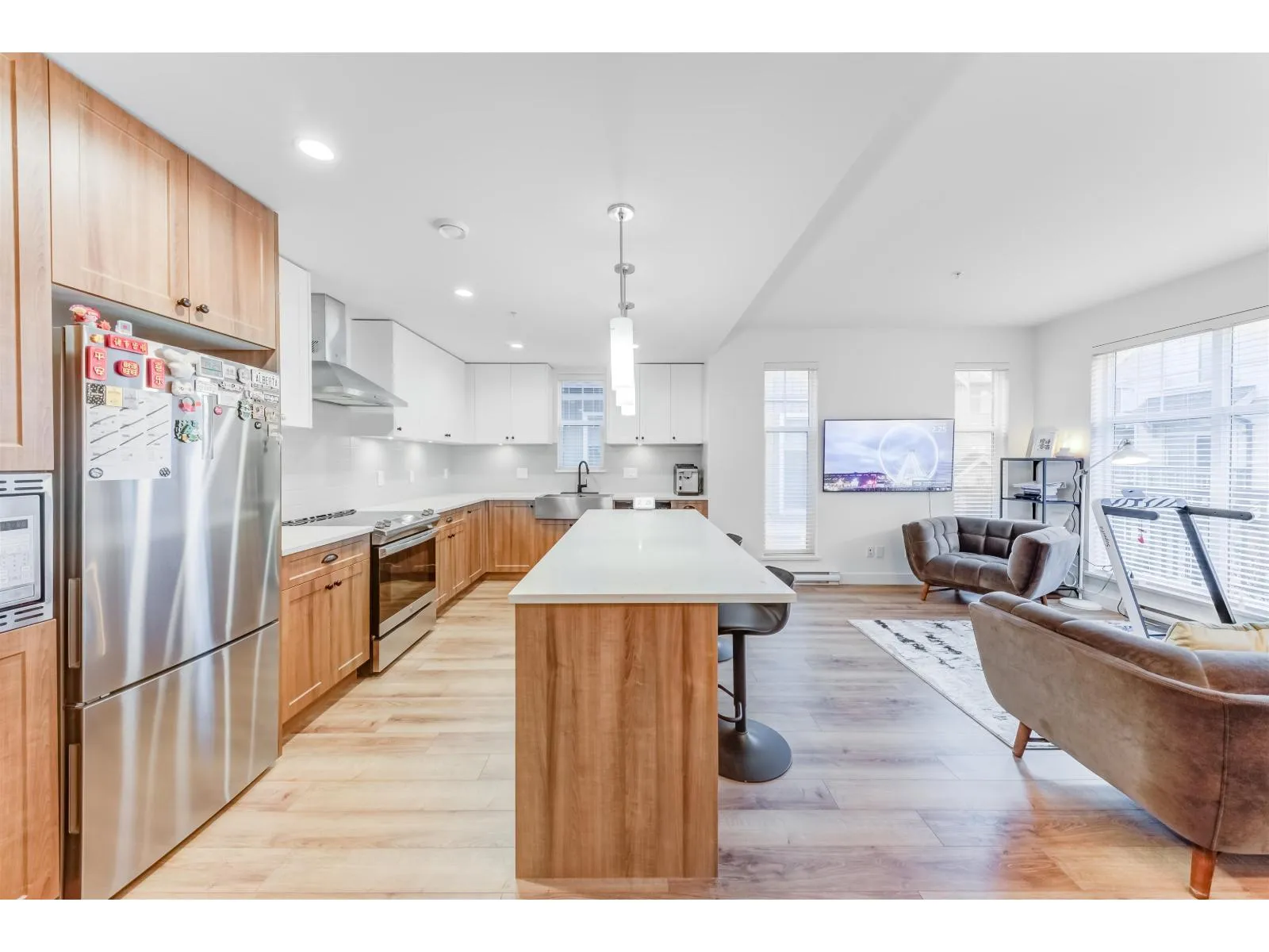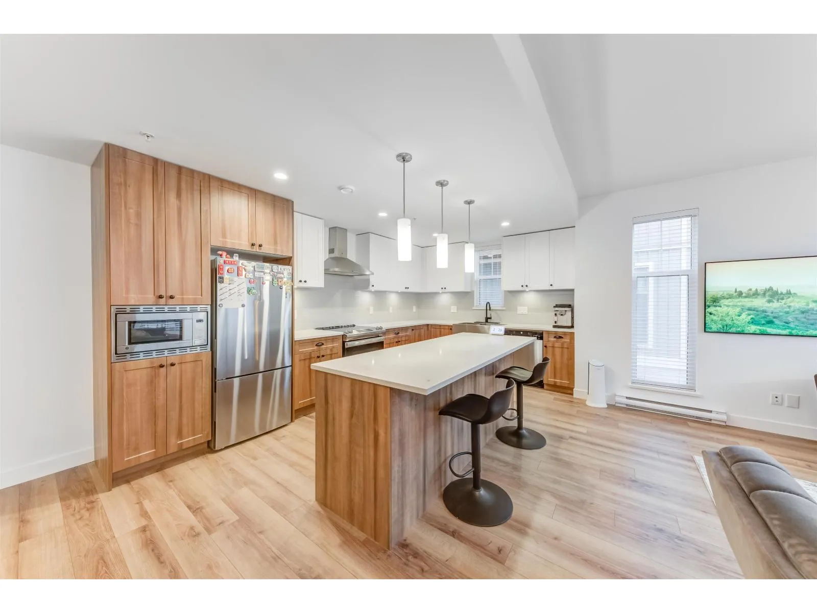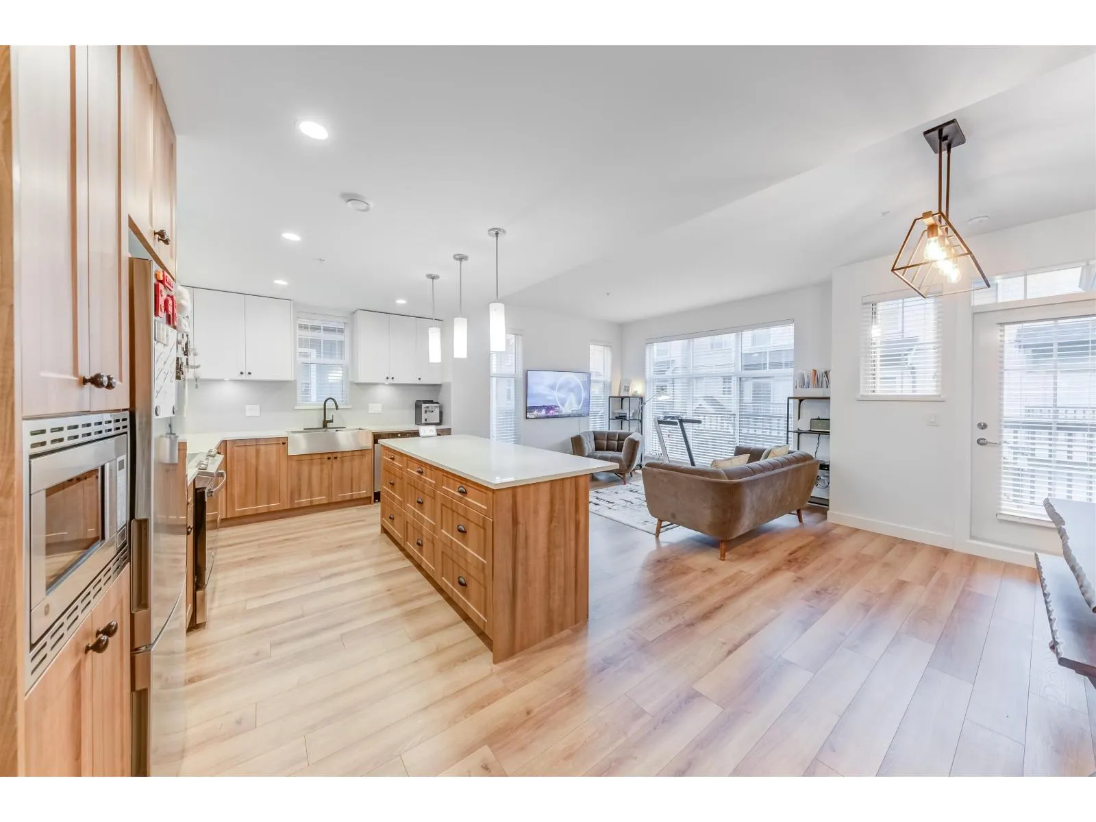 Spacious and Bright Corner townhouse at vibrant Township Commons! Meticulously maintained and shows like new but no GST! Nearly 1200sf in living space, quiet, Super functional and open layout features open concept chef-inspired kitchen with quality finishing glossy cabinets, quartz counters and deep sink plus S/S appliances! Still under New Home Warranty Brand new upgraded Washer and Dryer, Modern ceiling Lights. Across the street from Costco & steps away from Walmart, Save-on-Food, and future Langley skytrain!! Amenities inch clubhouse, gym, party room etc. Catchment: Peter Ewart Middle School & R.E. Mountain Secondary. (id:27476)