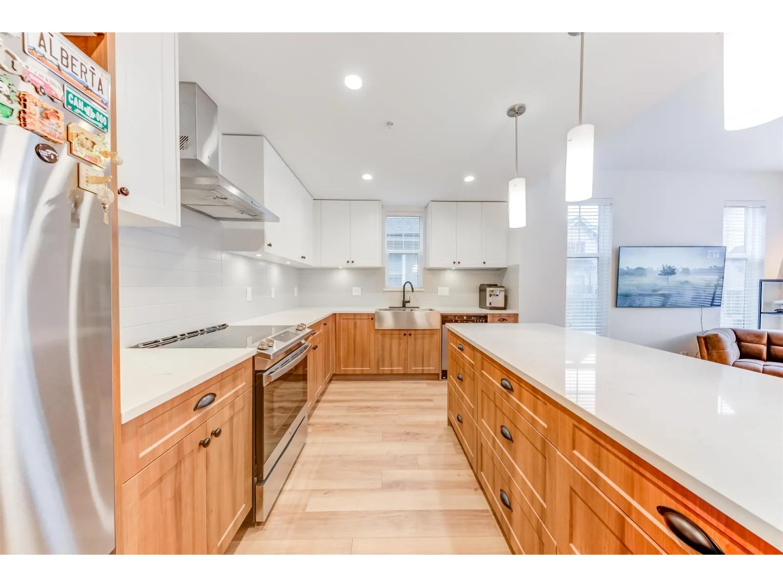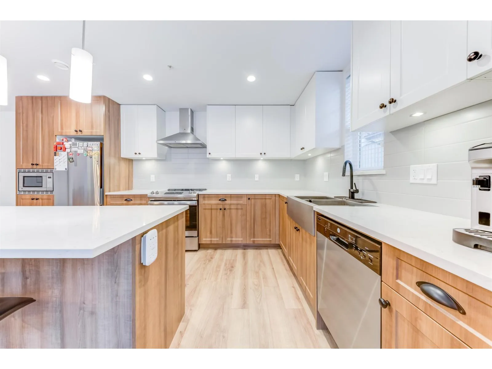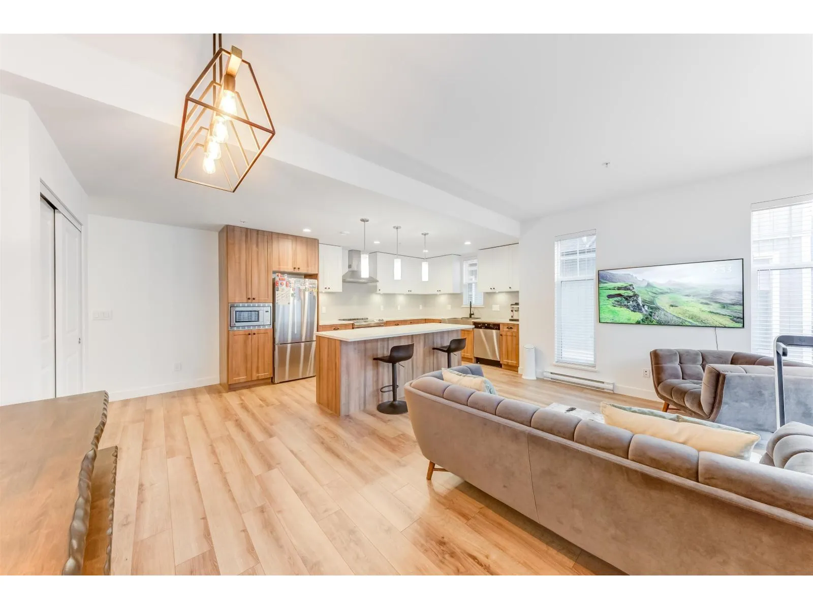 Spacious and Bright Corner townhouse at vibrant Township Commons! Meticulously maintained and shows like new but no GST! Nearly 1200sf in living space, quiet, Super functional and open layout features open concept chef-inspired kitchen with quality finishing glossy cabinets, quartz counters and deep sink plus S/S appliances! Still under New Home Warranty Brand new upgraded Washer and Dryer, Modern ceiling Lights. Across the street from Costco & steps away from Walmart, Save-on-Food, and future Langley skytrain!! Amenities inch clubhouse, gym, party room etc. Catchment: Peter Ewart Middle School & R.E. Mountain Secondary. (id:27476)