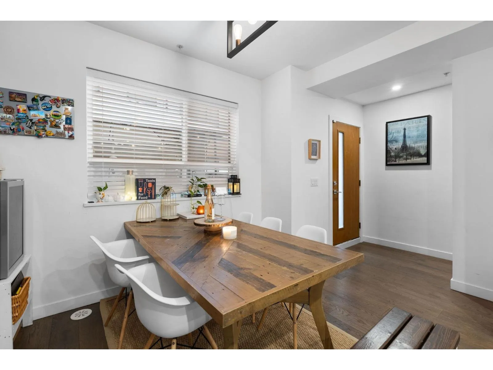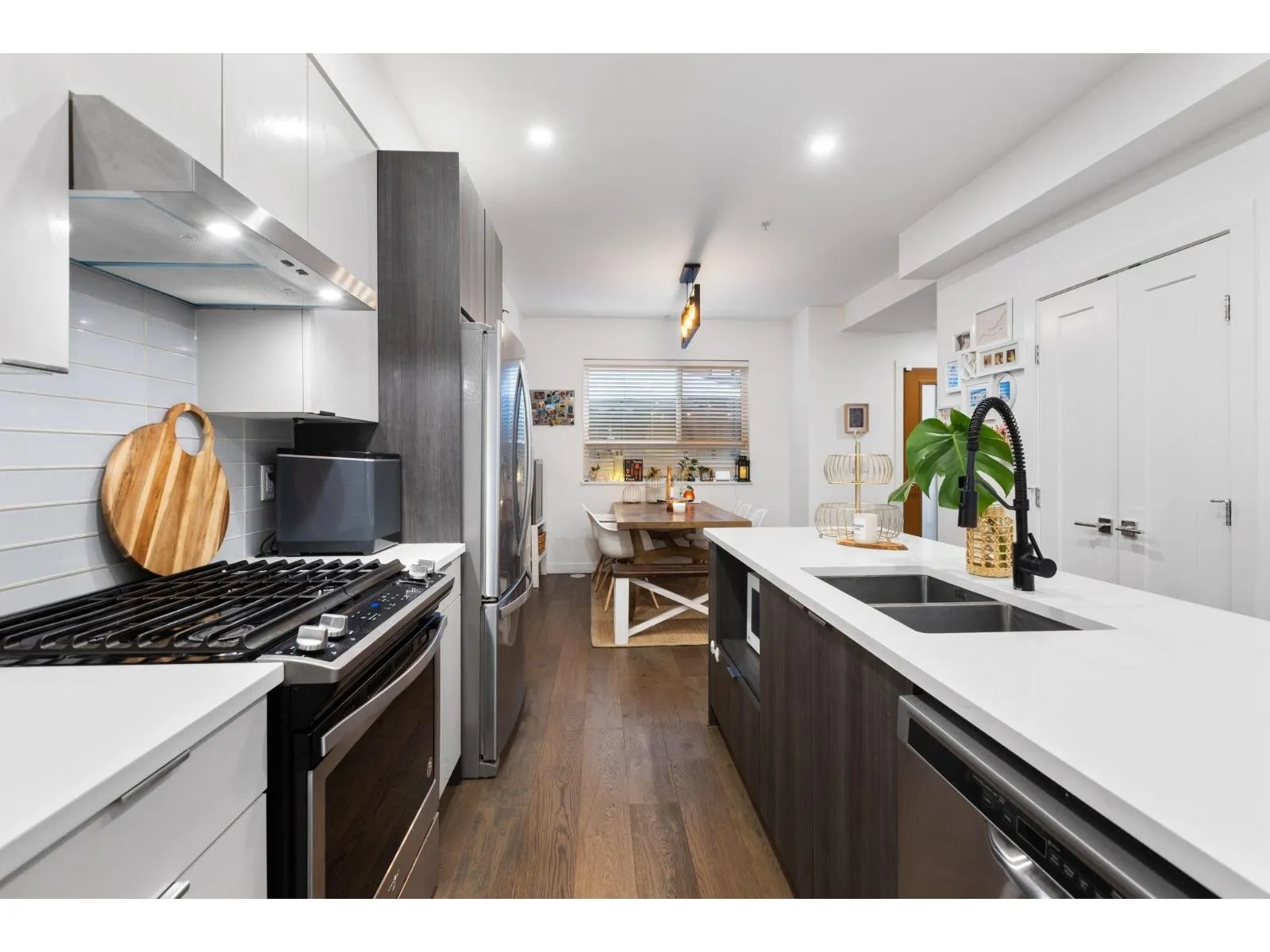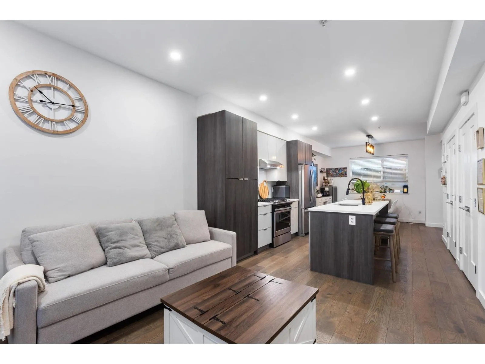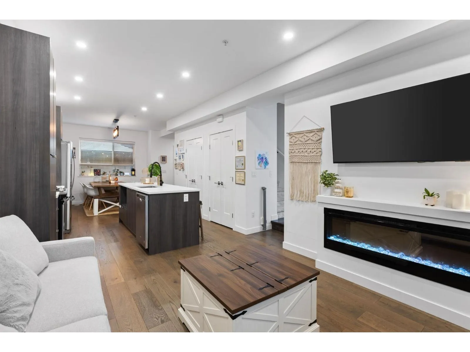 Welcome to this very clean and very well-kept 3 bed and 2.5 bath townhouse in The Terraces! The main floor offers an open-concept living room, a kitchen with a large island with a quartz countertop, and a dining area, which leads to a patio with turf. The upper floor has a decent-sized primary bedroom with its own ensuite and two additional bedrooms and a family bathroom. Additional features include central AC and hot water on demand. This centrally located complex is just a few minutes' walk to shopping, restaurants, recreation, parks, and the future new Skytrain station.Bonus EV charger, Updated Washer/Dryer, Hoodfan and hot water. Move in ready! (id:27476)