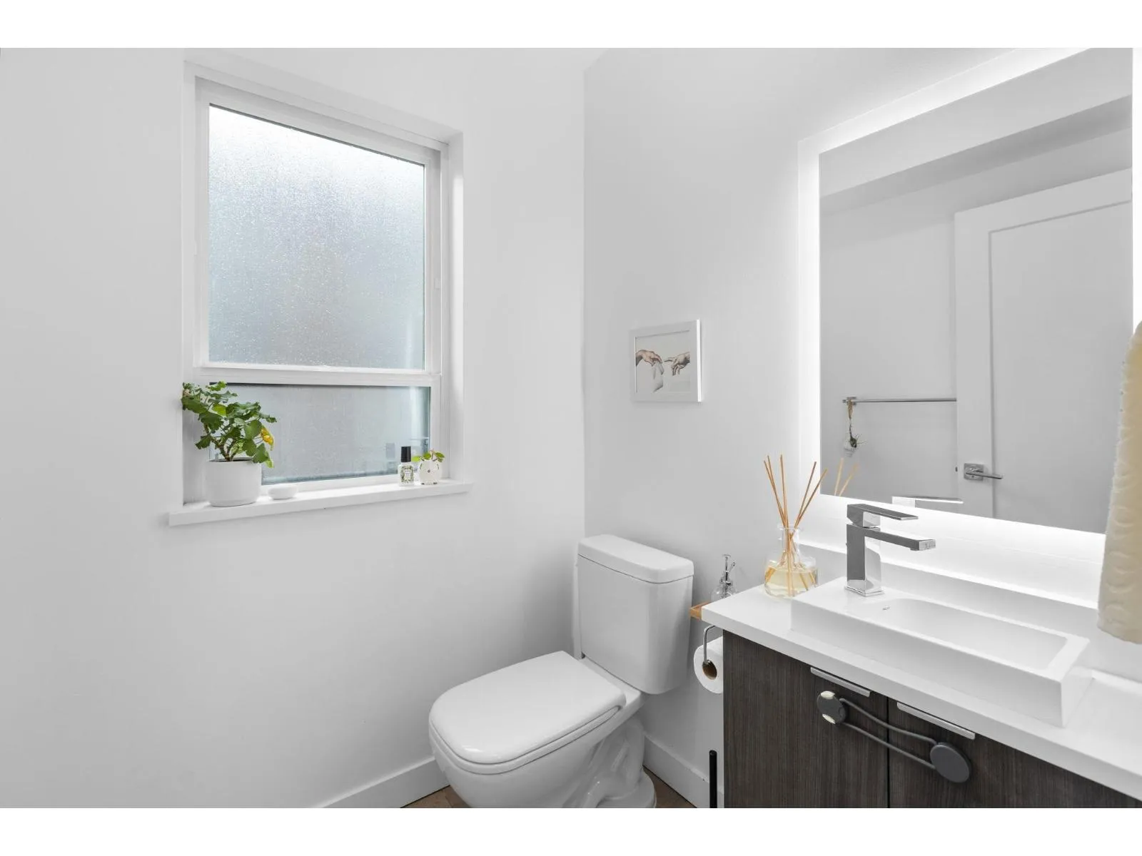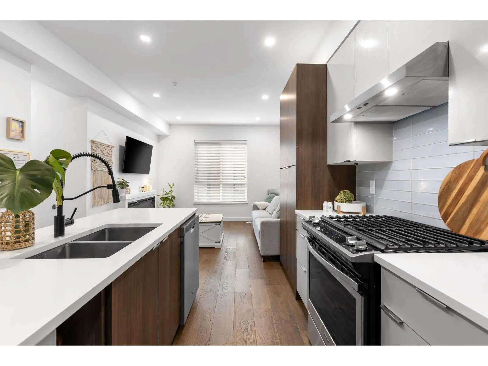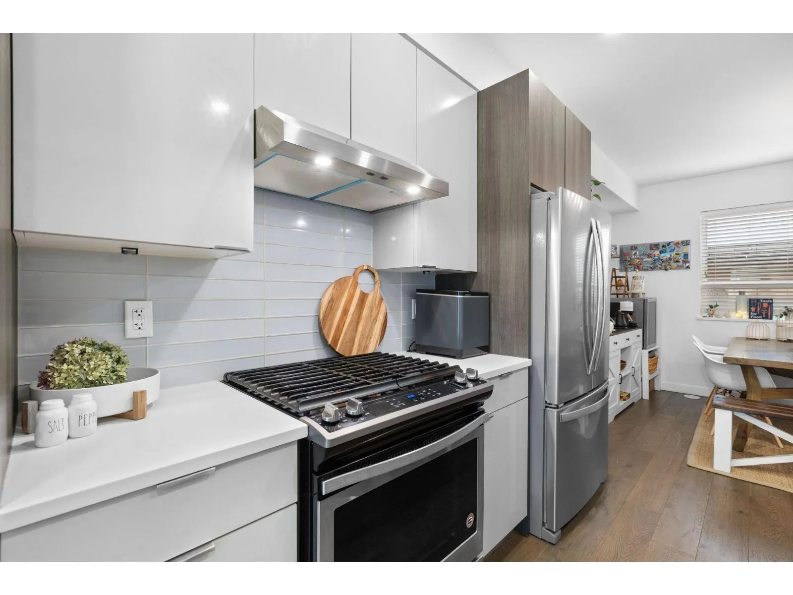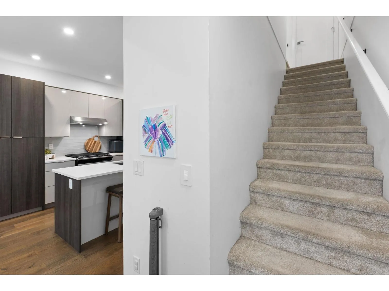 Welcome to this very clean and very well-kept 3 bed and 2.5 bath townhouse in The Terraces! The main floor offers an open-concept living room, a kitchen with a large island with a quartz countertop, and a dining area, which leads to a patio with turf. The upper floor has a decent-sized primary bedroom with its own ensuite and two additional bedrooms and a family bathroom. Additional features include central AC and hot water on demand. This centrally located complex is just a few minutes' walk to shopping, restaurants, recreation, parks, and the future new Skytrain station.Bonus EV charger, Updated Washer/Dryer, Hoodfan and hot water. Move in ready! (id:27476)