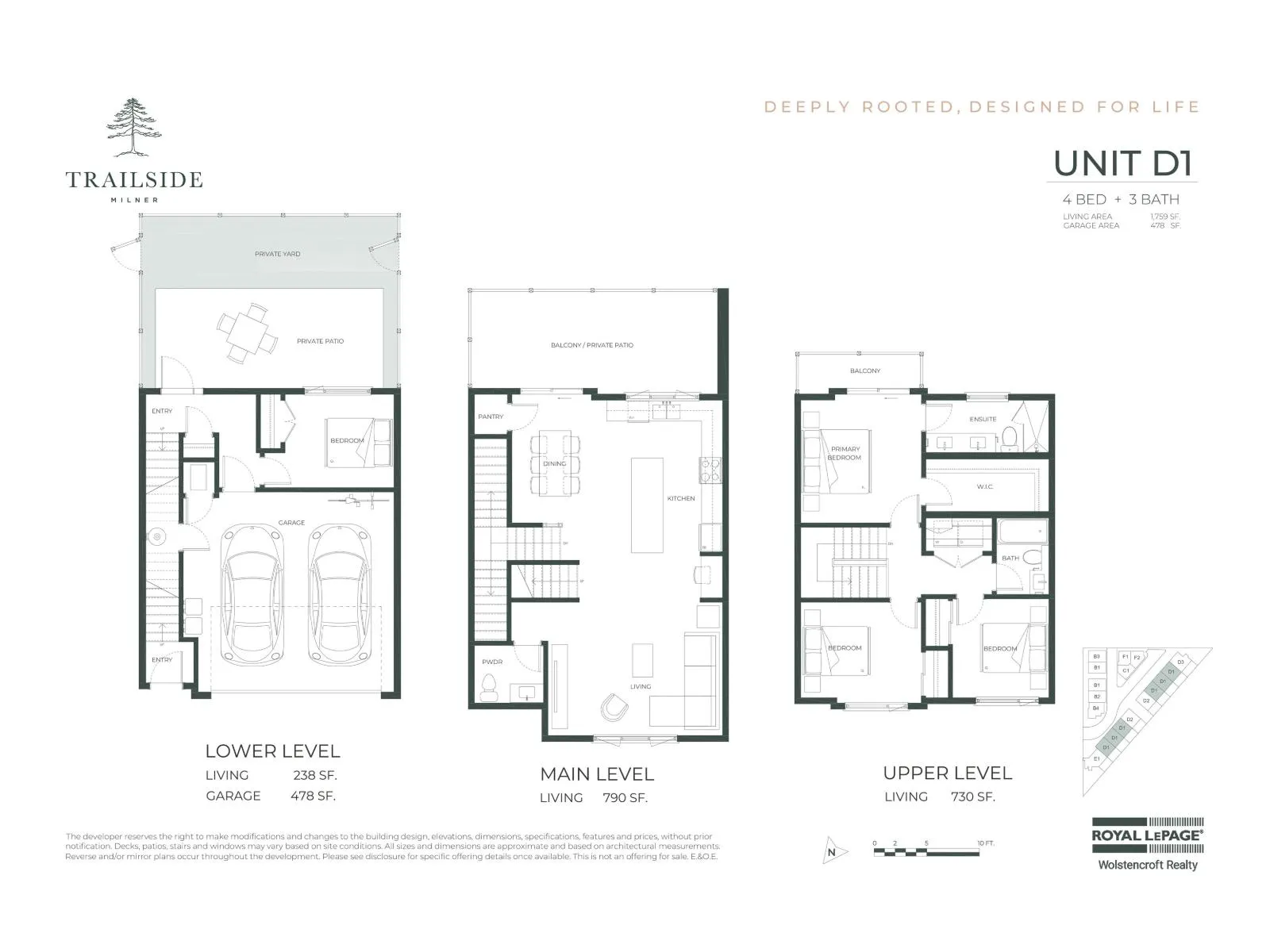 Welcome to Trailside! This end-unit townhome at Trailside Milner offers 4 bedrooms and 3 bathrooms, including a versatile ground-level space-perfect for a student, guest, or home office. With a double side-by-side garage, open-concept main floor, and large windows overlooking trails and greenspace, every detail balances comfort and function. The kitchen is elevated with a walk-in pantry and a stylish coffee/wine bar, while spacious living areas and durable finishes create a home designed to last. Upstairs, 3 bedrooms provide room to grow, with a primary suite that feels like a retreat. Set in a boutique community that values connection and timeless design, this residence blends modern living with natural serenity. Ready for occupancy December 2025. (id:27476)