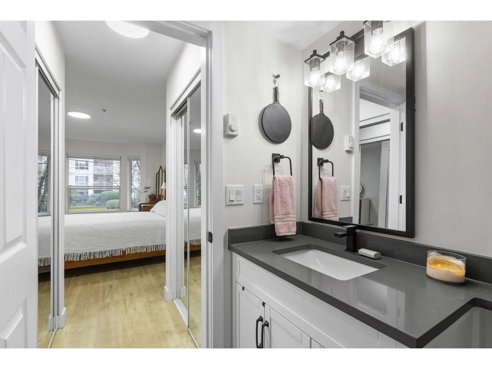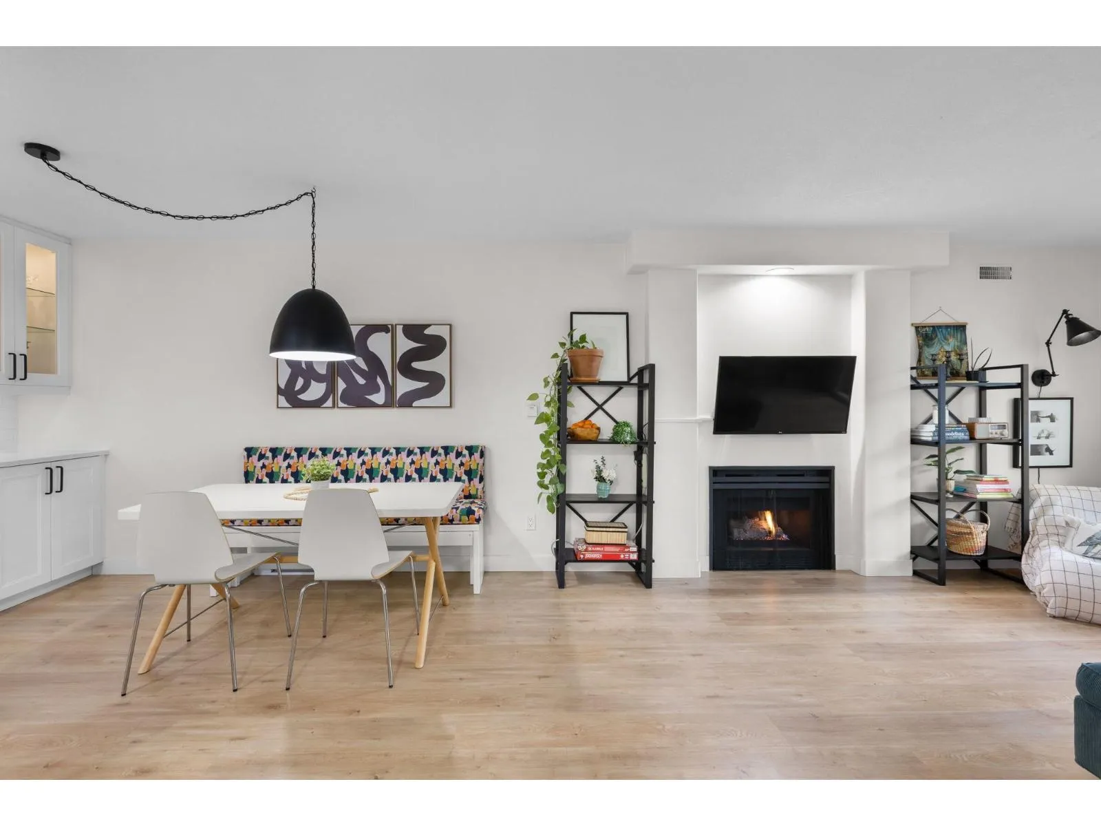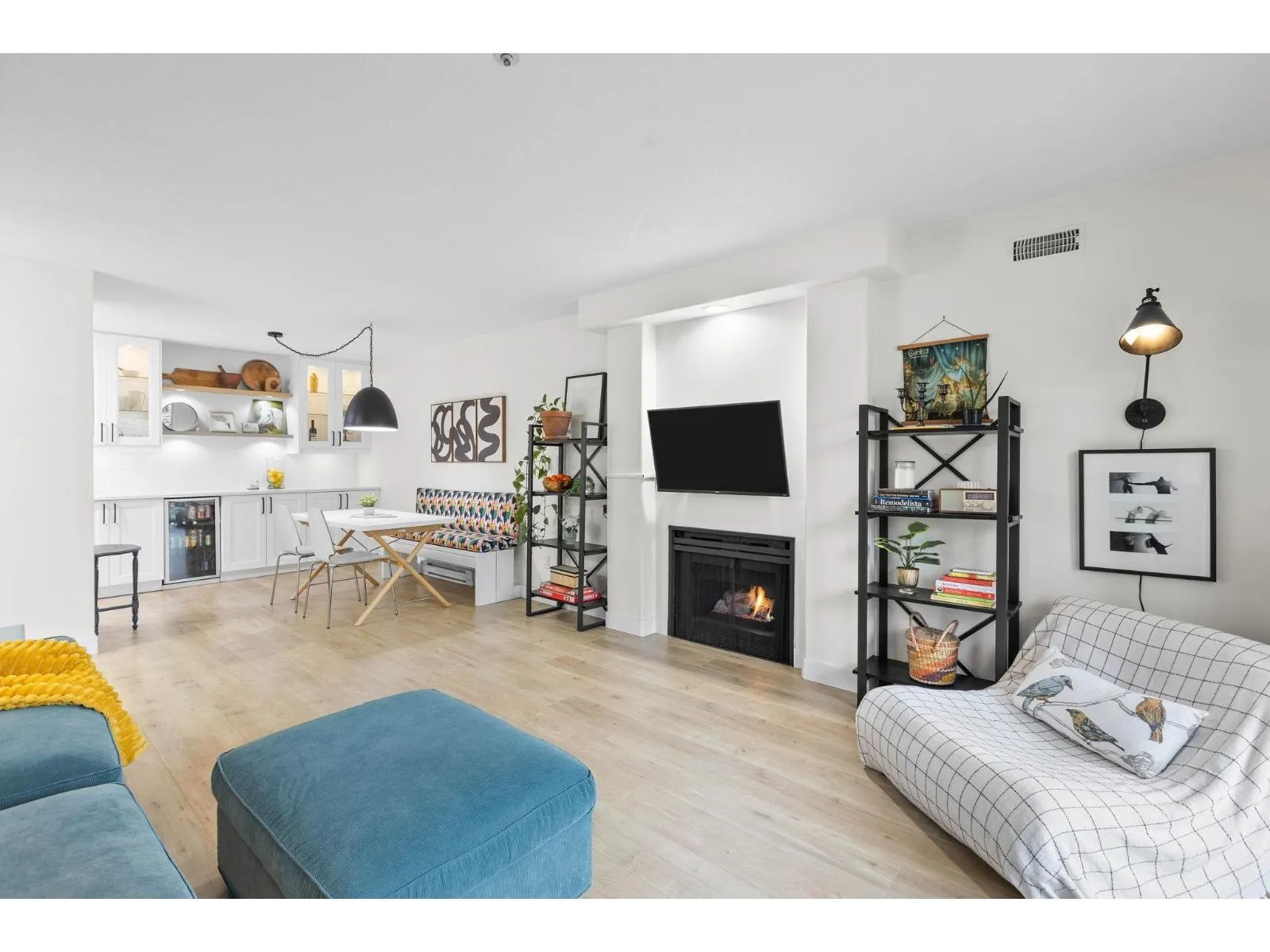 Step inside and fall in love. This bright 2 bed, 2 bath corner suite has been thoughtfully upgraded. The kitchen shines with expansive quartz counters, a custom coffee bar with floating shelves and bar fridge, sleek white shaker cabinets with soft close doors and under mount lighting, plus stainless appliances including a 4 door fridge. Oak laminate flooring and custom lighting carries through the home for a warm, elevated feel. The open living and dining space is perfect for relaxing by the gas fireplace or stepping onto your sunny south facing balcony. Enjoy views of mature trees from every room. Both bathrooms feature quartz counters and deep soaker tubs. Full size laundry adds convenience. Bonus extra street parking for your second car and a short distance to the future SkyTrain. (id:27476)