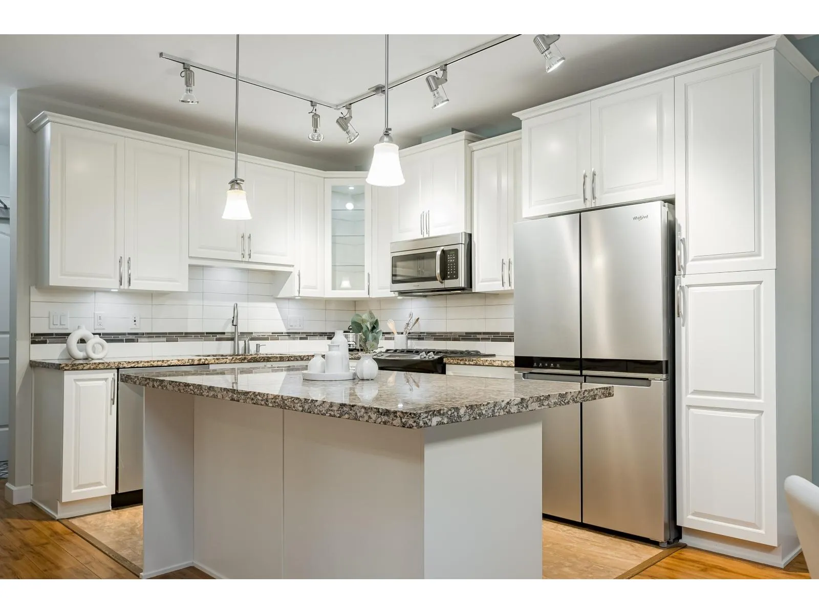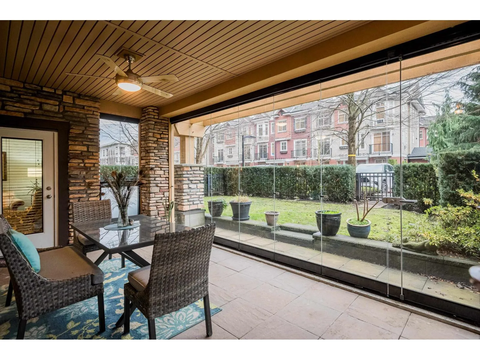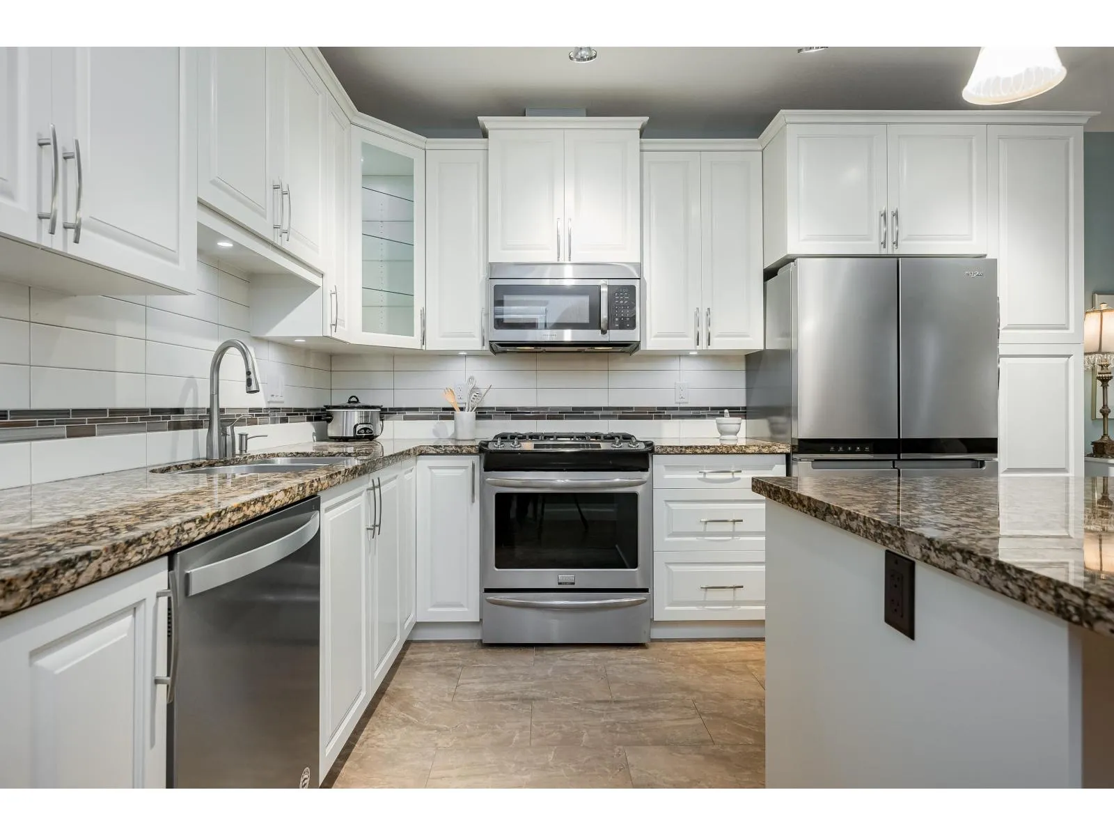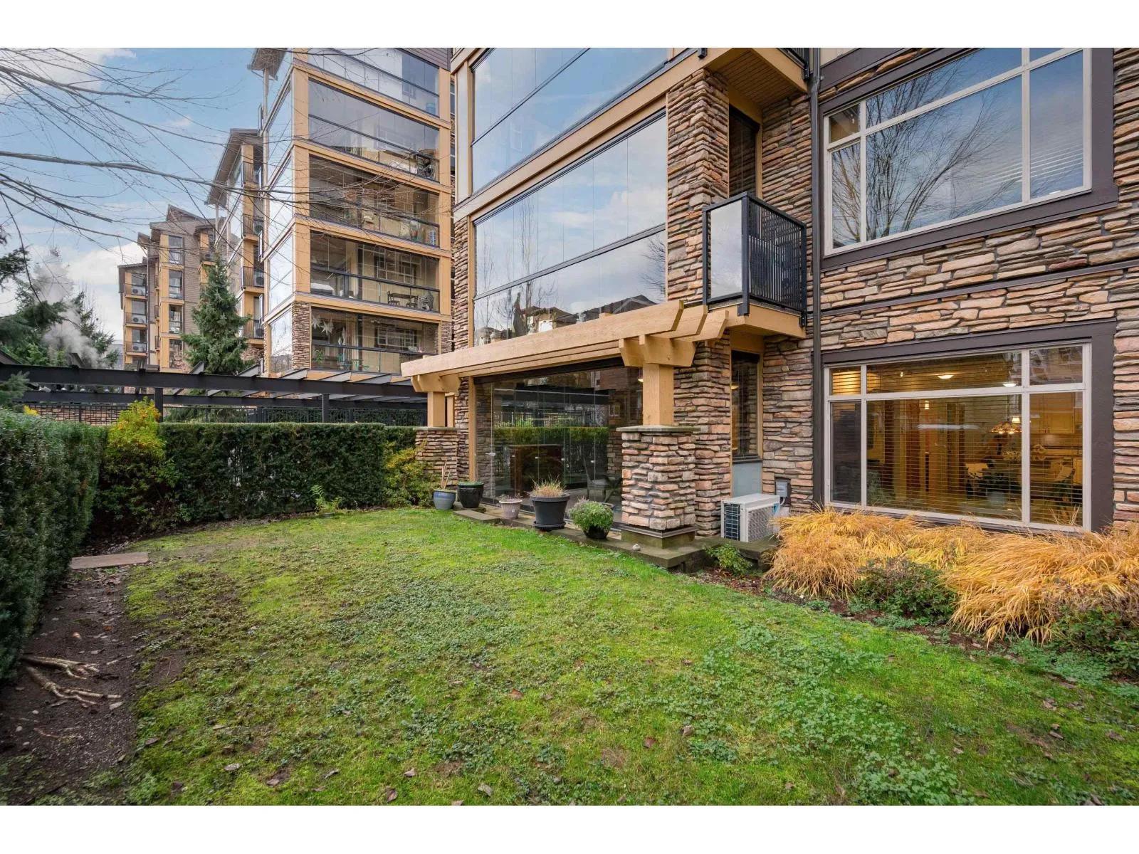 Parkside 1 in the heart of it all with everything right outside your door, welcomes you to this gorgeous 2 bdrm, 2 bth plus den END UNIT ! Great floor plan & just under 1050 sq ft, with some fantastic updates including the stunning white kitchen (2023) with S/S appliances including gas & newer dishwasher & fridge. Well sized island/prep space! Located on the ground floor with a massive yard, perfect for kids & pets, & offers quick access to visitor parking as well for guests! The wrap around glass enclosed patio is a great extension of your home for year round use and is accessed off both the primary bdrm & the living rm. Primary offers walk in closet with organizers & beautiful 4 pc ensuite. A/C is great for the hot summer ~ heat pump updated in 2022. 2 parking, 2 storage lockers! (id:27476)