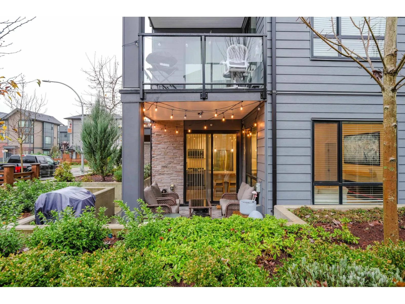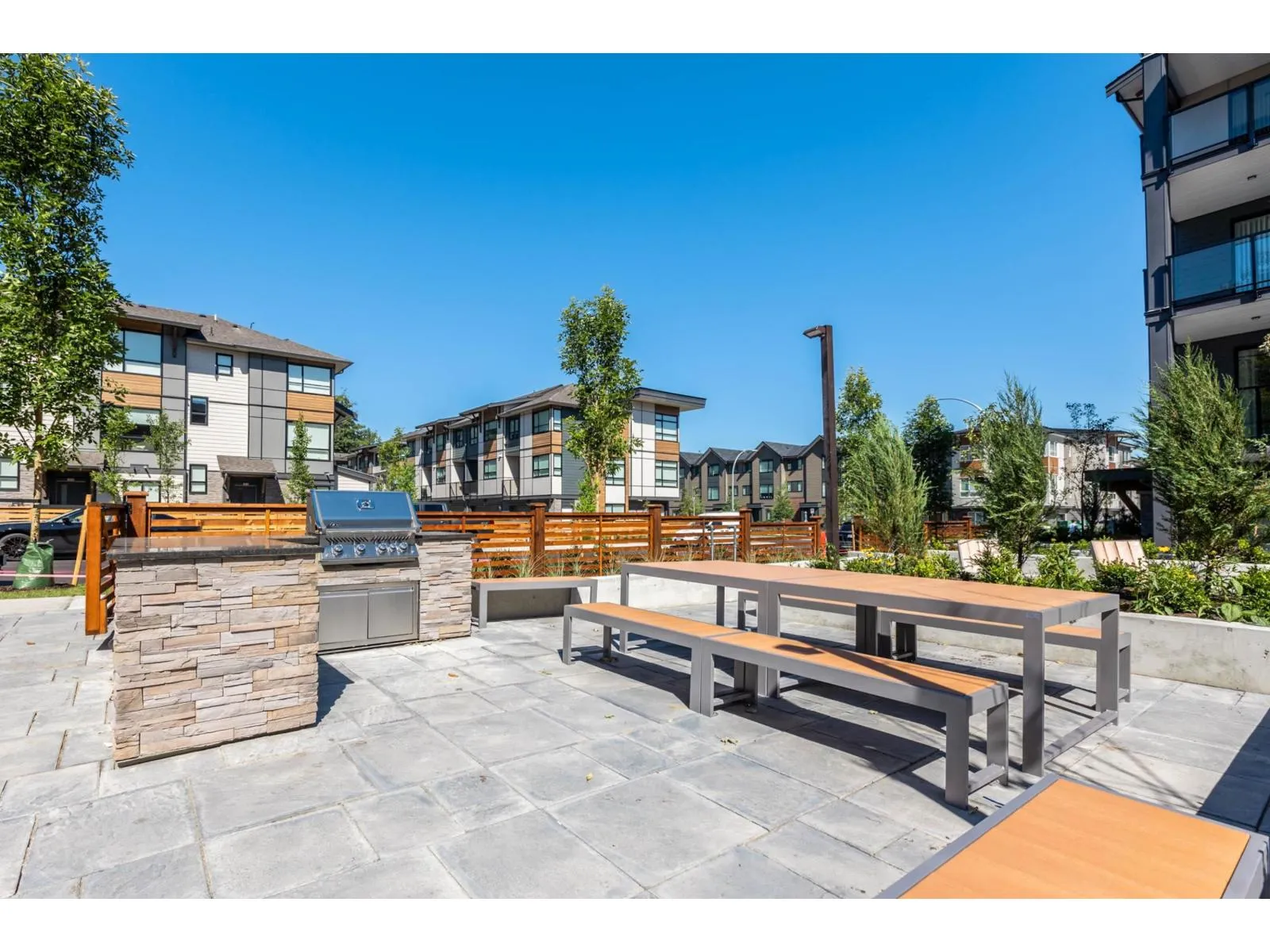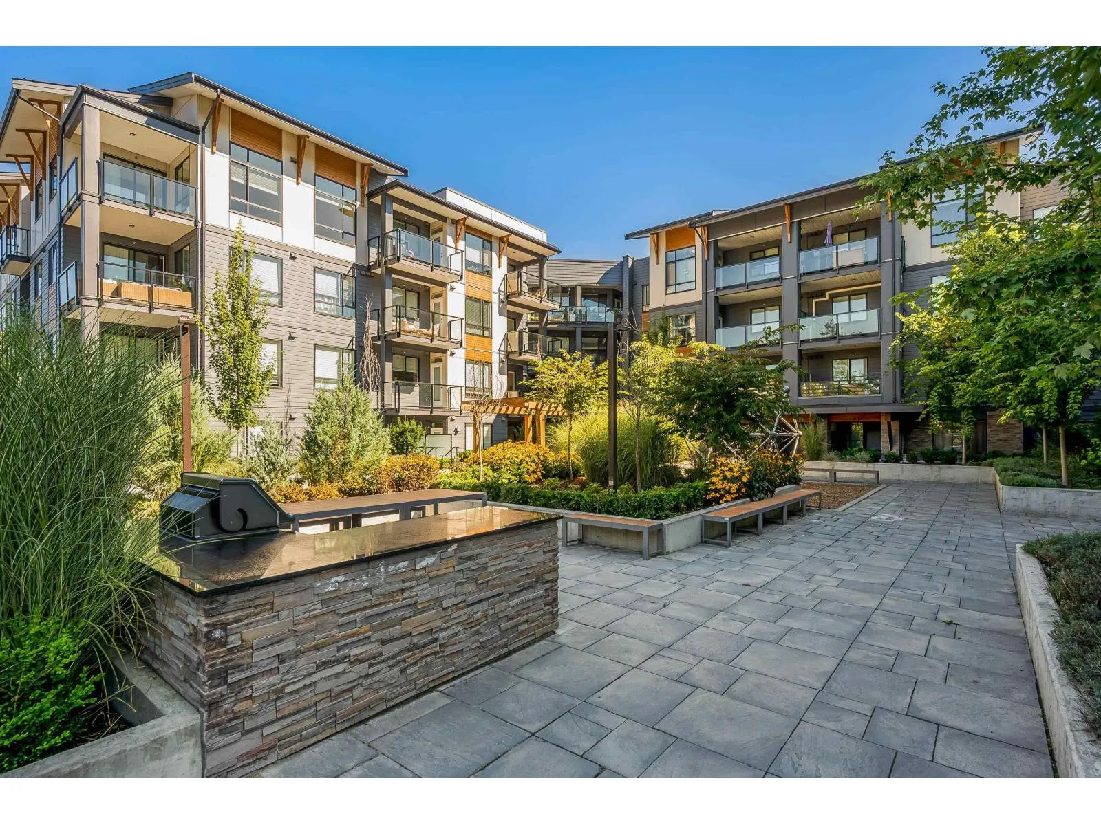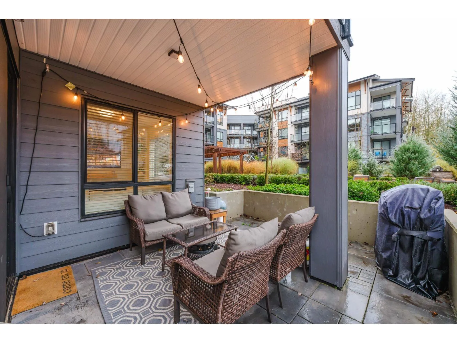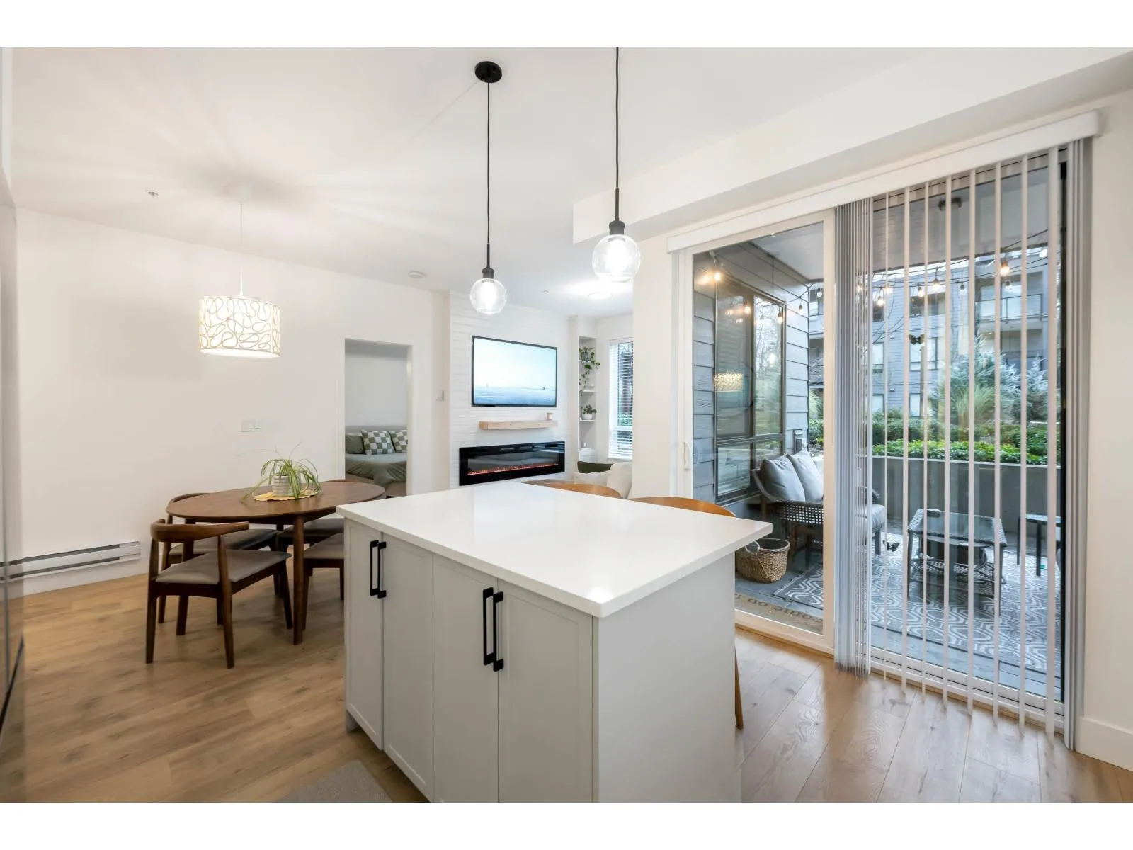 Bright, open, southwest-facing 2-bed, 2-bath corner home with a highly sought-after ground-level walkout patio, built by award-winning Zenterra. Excellent floor plan with 9 ft ceilings and vinyl plank flooring throughout. The kitchen features shaker-style cabinetry with a pantry, Samsung stainless-steel appliances with a gas range, a large island, quartz countertops, and an undermount sink. Two spacious bedrooms plus a bonus linen/storage area. Gas hookup on the patio. Unbeatable location: walk to coffee shops, restaurants, fitness facilities, and the Langley Events Centre. Future rapid transit will connect this area directly to SkyTrain. One underground parking, with more available to rent/purchase, plus plenty of street parking right out front. (id:27476)