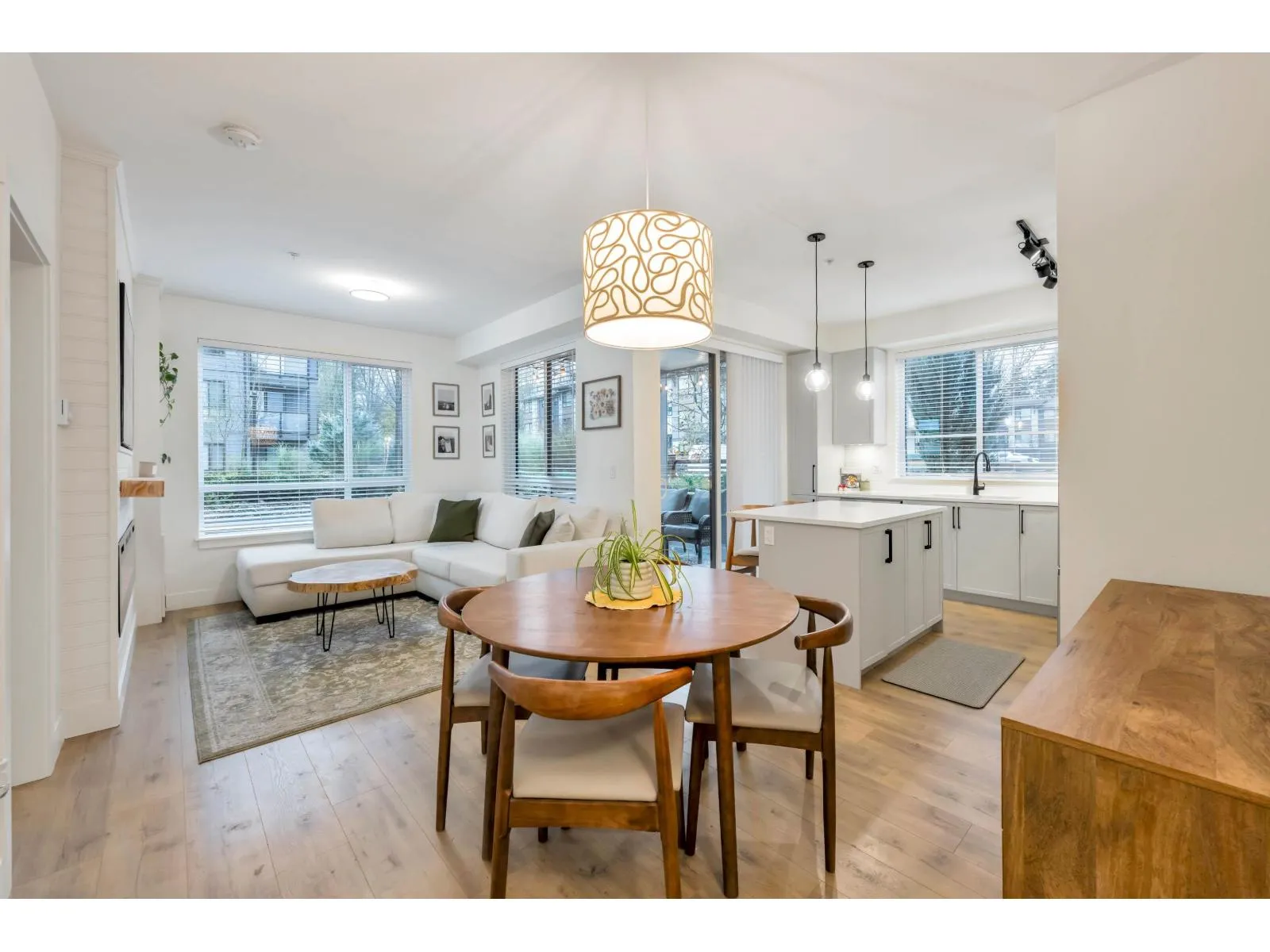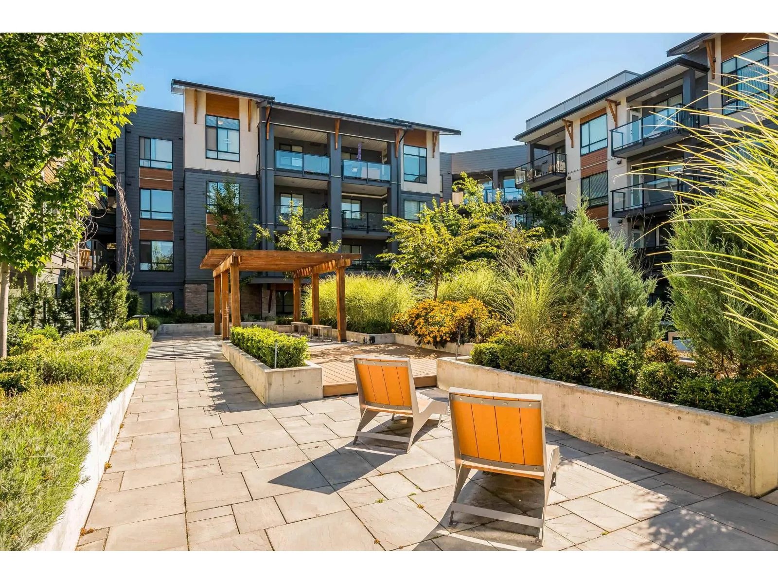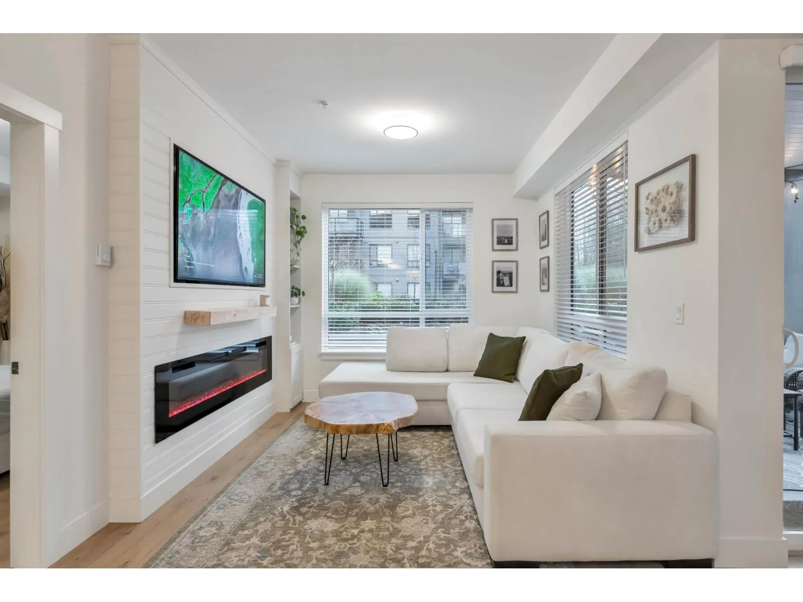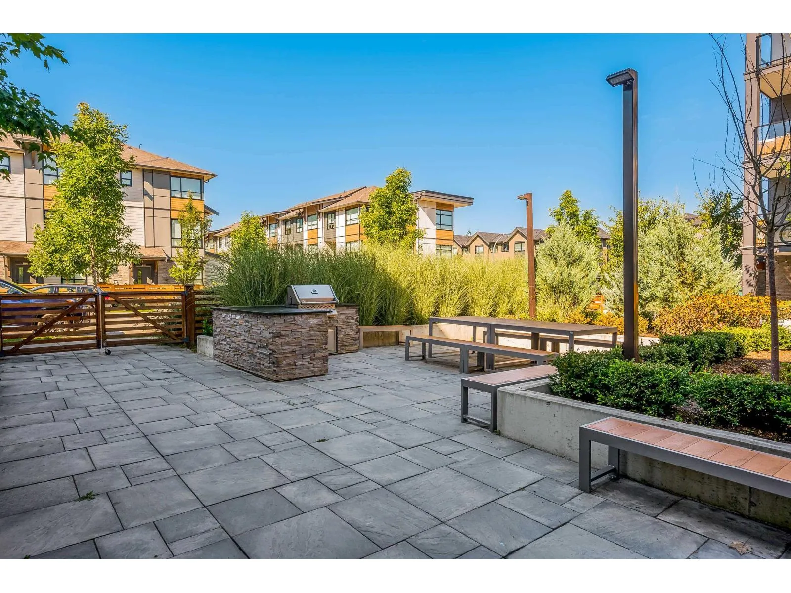 Bright, open, southwest-facing 2-bed, 2-bath corner home with a highly sought-after ground-level walkout patio, built by award-winning Zenterra. Excellent floor plan with 9 ft ceilings and vinyl plank flooring throughout. The kitchen features shaker-style cabinetry with a pantry, Samsung stainless-steel appliances with a gas range, a large island, quartz countertops, and an undermount sink. Two spacious bedrooms plus a bonus linen/storage area. Gas hookup on the patio. Unbeatable location: walk to coffee shops, restaurants, fitness facilities, and the Langley Events Centre. Future rapid transit will connect this area directly to SkyTrain. One underground parking, with more available to rent/purchase, plus plenty of street parking right out front. (id:27476)