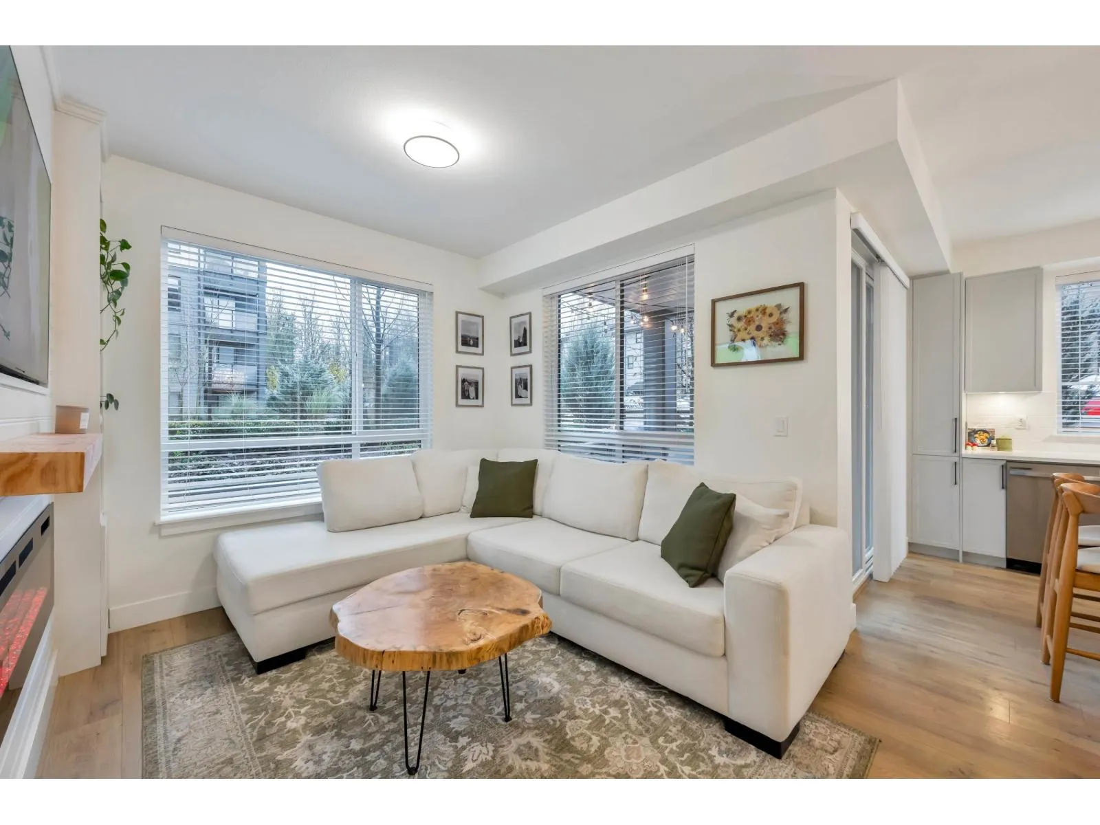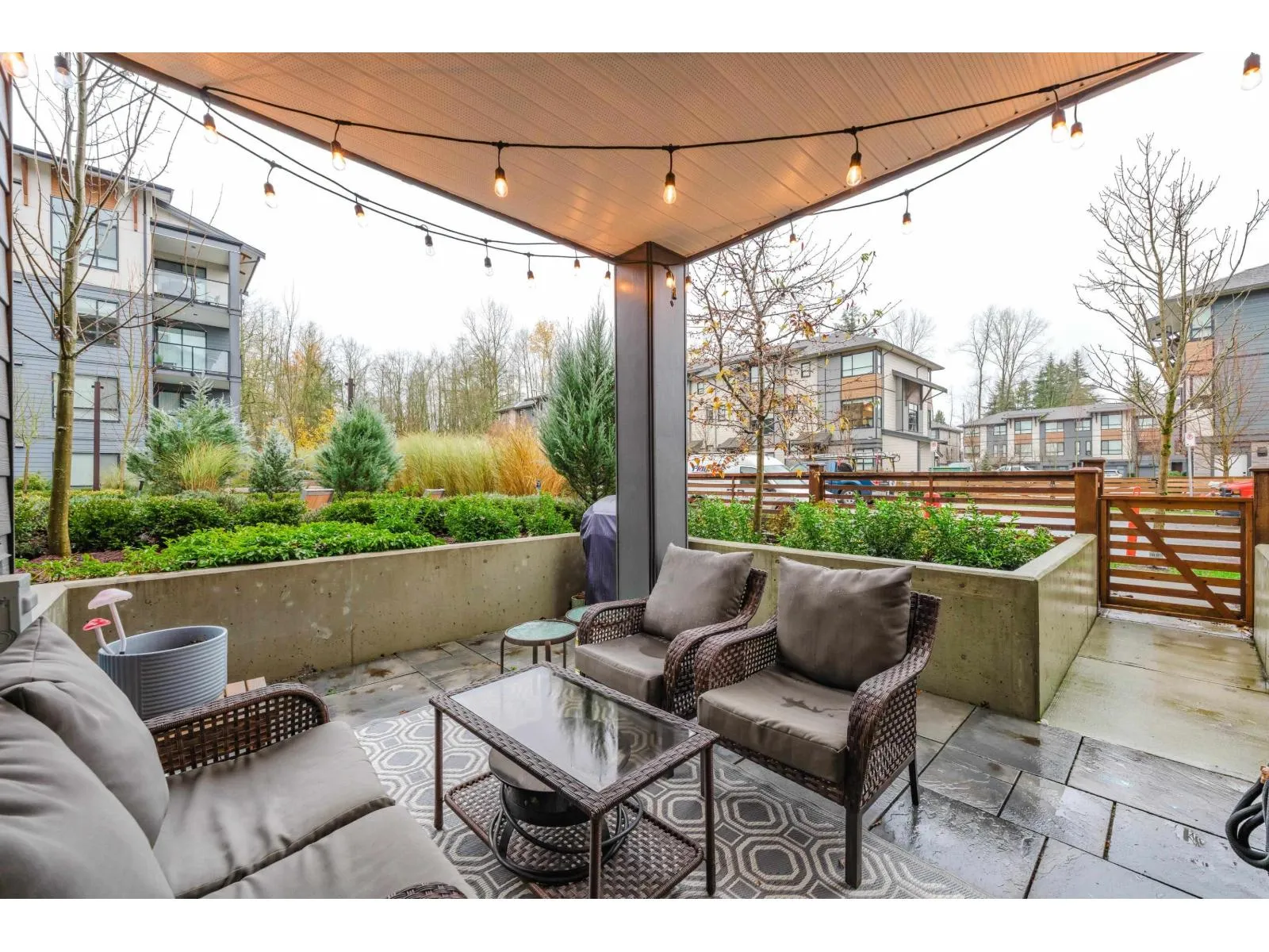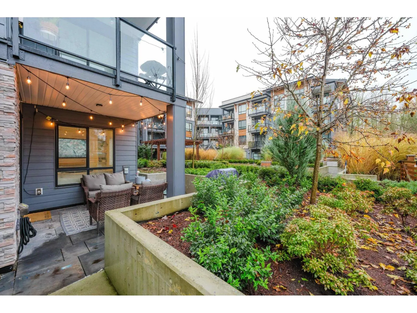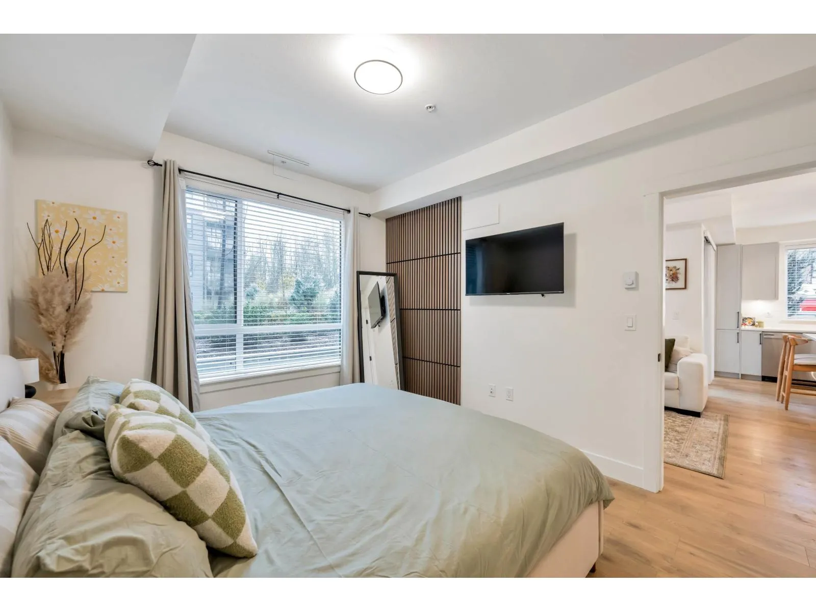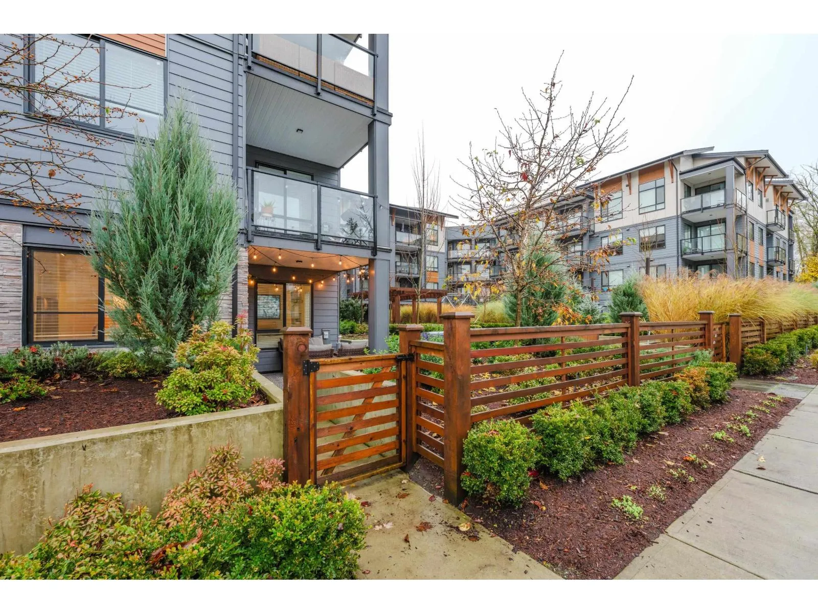 Bright, open, southwest-facing 2-bed, 2-bath corner home with a highly sought-after ground-level walkout patio, built by award-winning Zenterra. Excellent floor plan with 9 ft ceilings and vinyl plank flooring throughout. The kitchen features shaker-style cabinetry with a pantry, Samsung stainless-steel appliances with a gas range, a large island, quartz countertops, and an undermount sink. Two spacious bedrooms plus a bonus linen/storage area. Gas hookup on the patio. Unbeatable location: walk to coffee shops, restaurants, fitness facilities, and the Langley Events Centre. Future rapid transit will connect this area directly to SkyTrain. One underground parking, with more available to rent/purchase, plus plenty of street parking right out front. (id:27476)