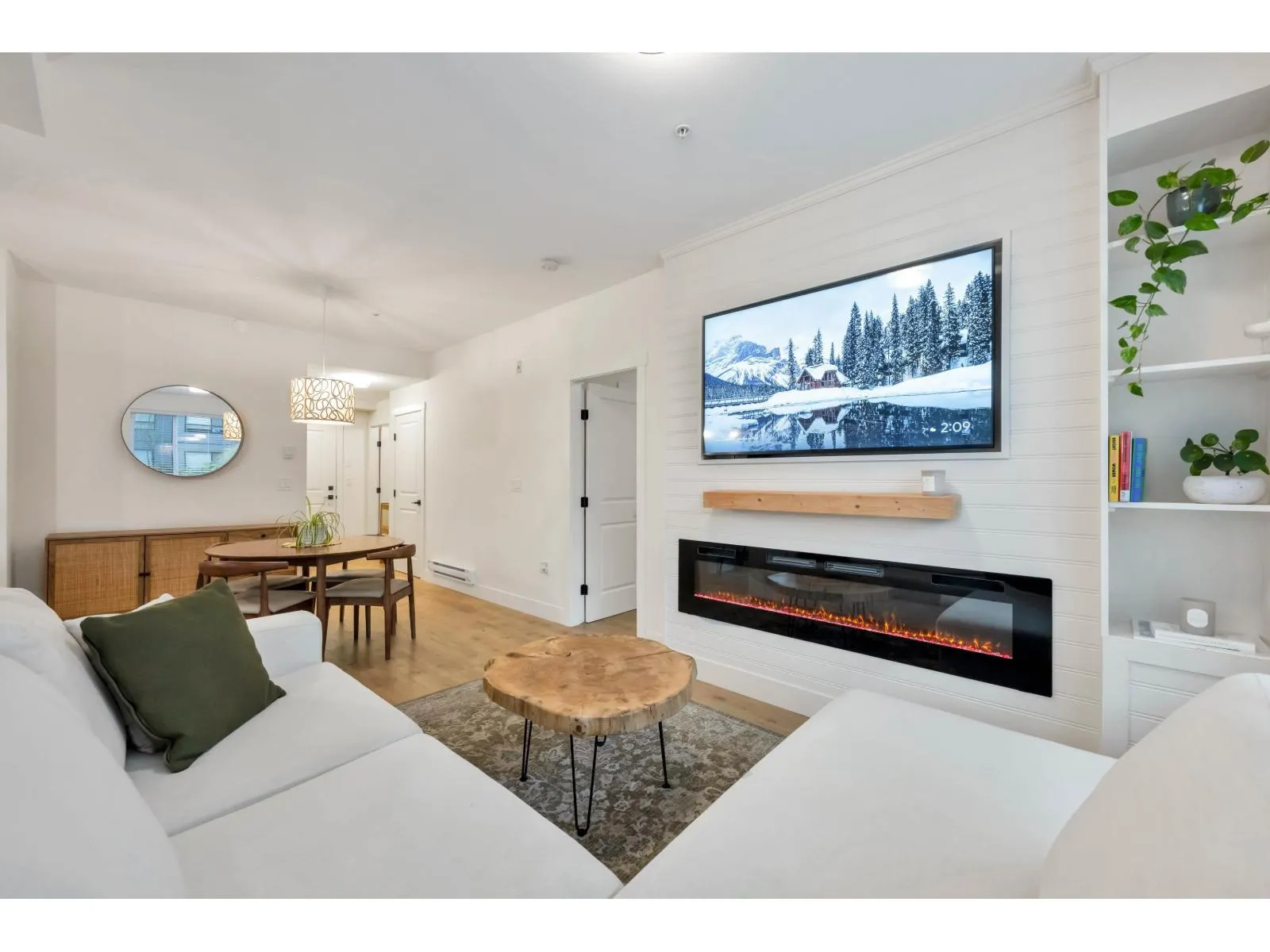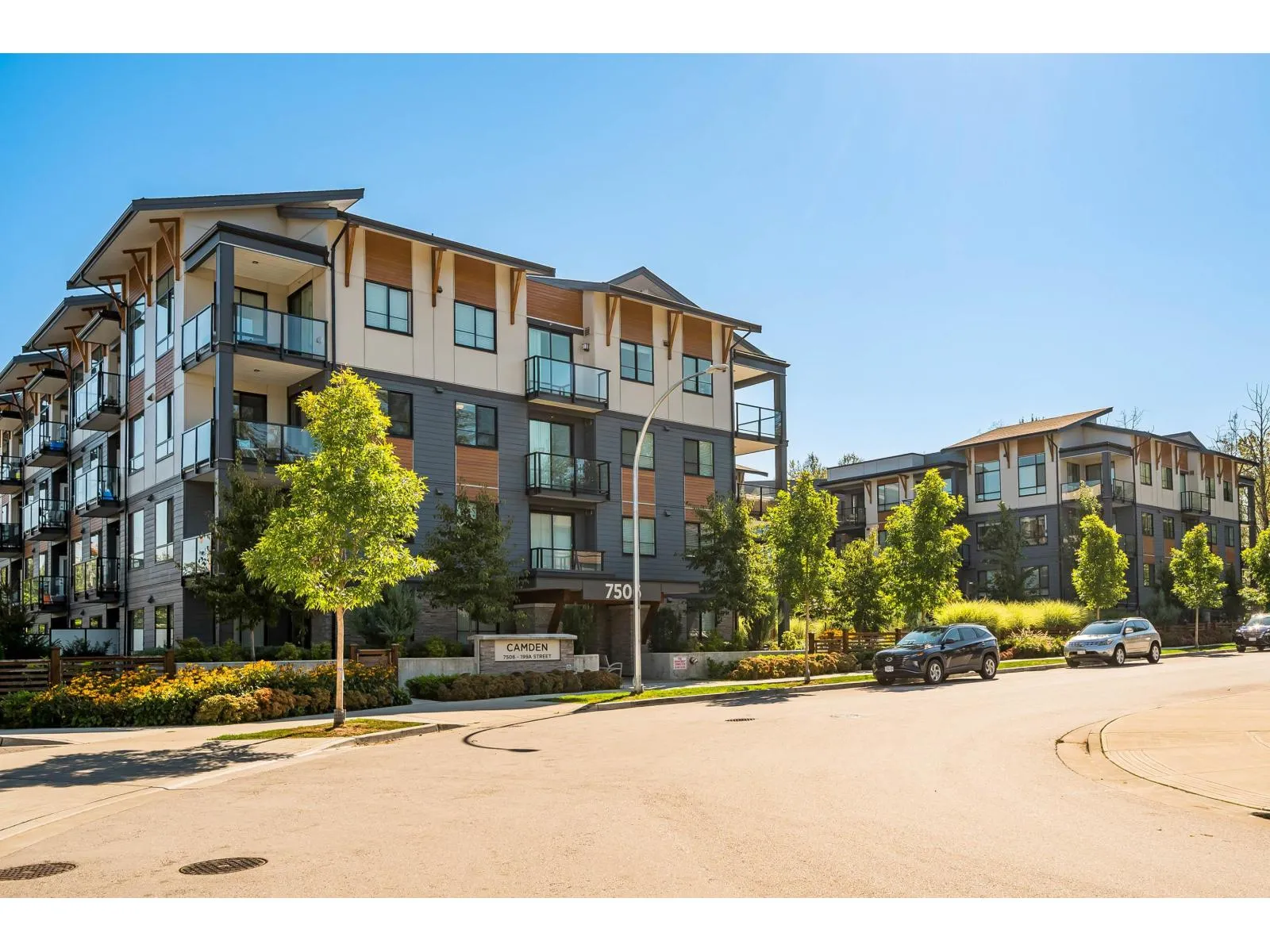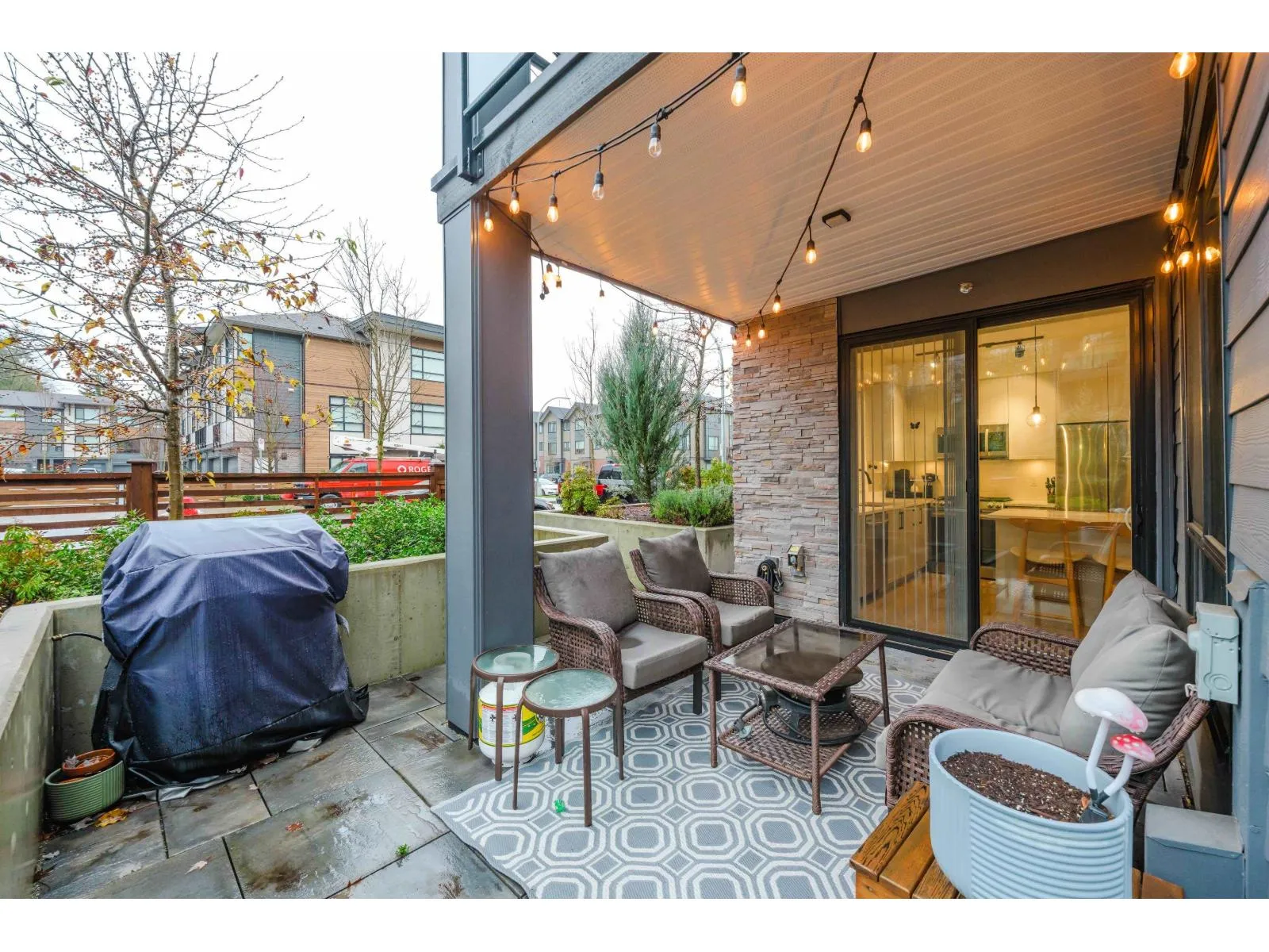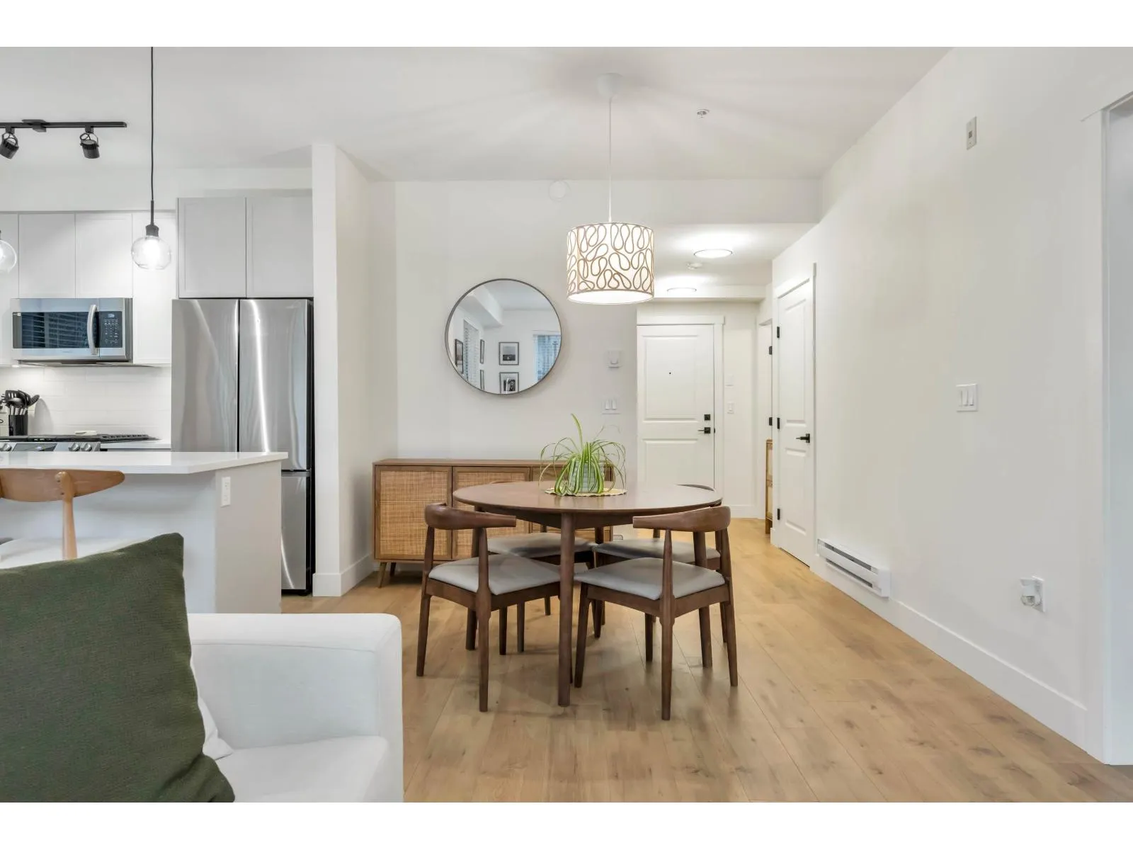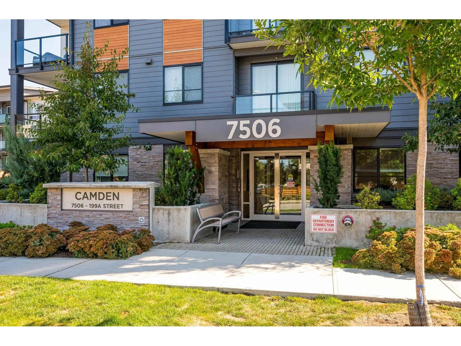 Bright, open, southwest-facing 2-bed, 2-bath corner home with a highly sought-after ground-level walkout patio, built by award-winning Zenterra. Excellent floor plan with 9 ft ceilings and vinyl plank flooring throughout. The kitchen features shaker-style cabinetry with a pantry, Samsung stainless-steel appliances with a gas range, a large island, quartz countertops, and an undermount sink. Two spacious bedrooms plus a bonus linen/storage area. Gas hookup on the patio. Unbeatable location: walk to coffee shops, restaurants, fitness facilities, and the Langley Events Centre. Future rapid transit will connect this area directly to SkyTrain. One underground parking, with more available to rent/purchase, plus plenty of street parking right out front. (id:27476)