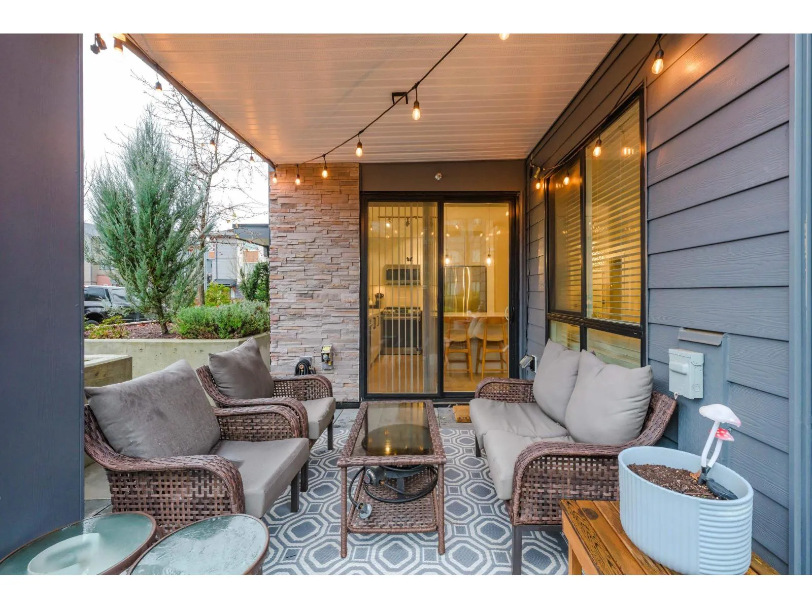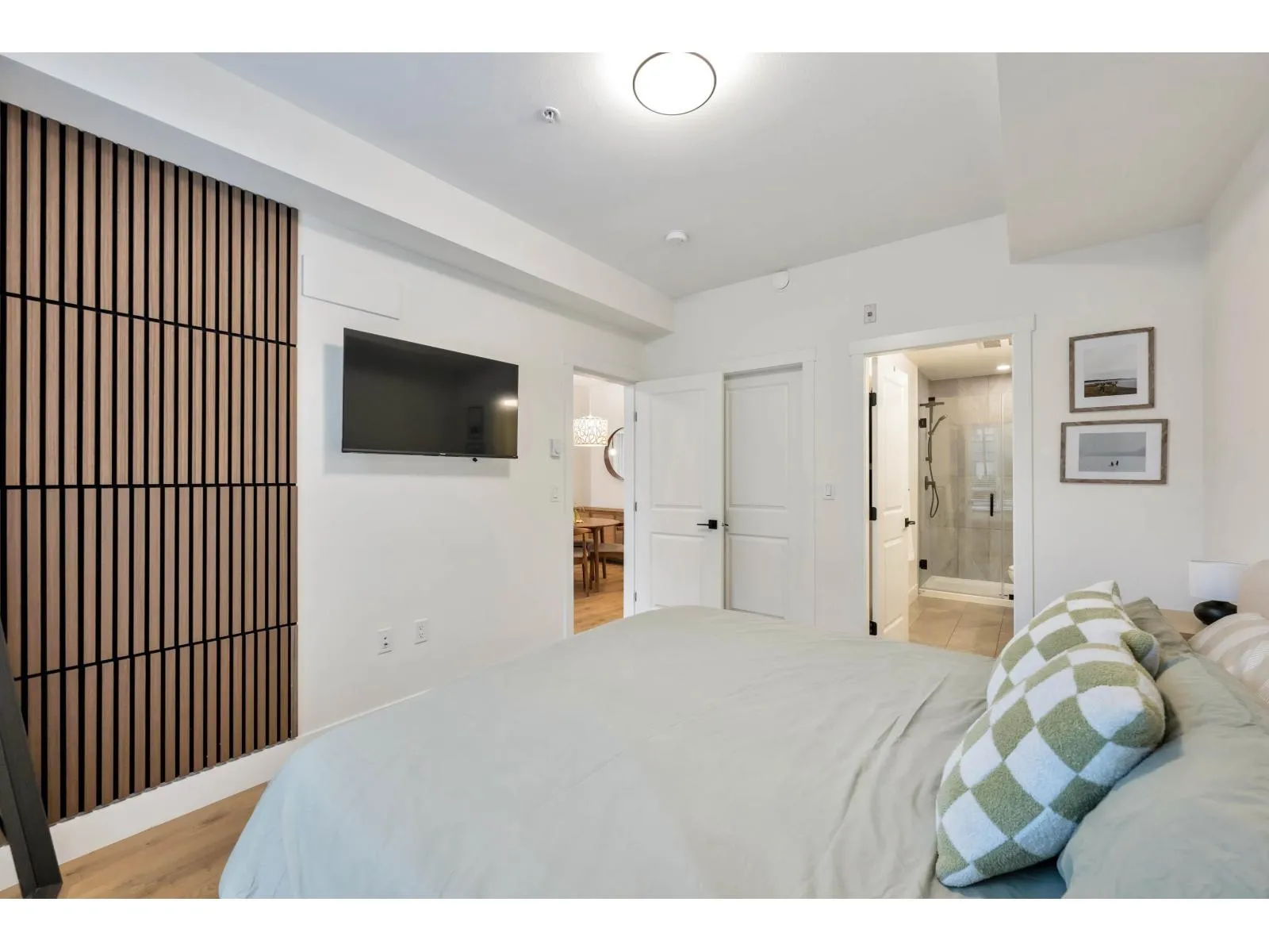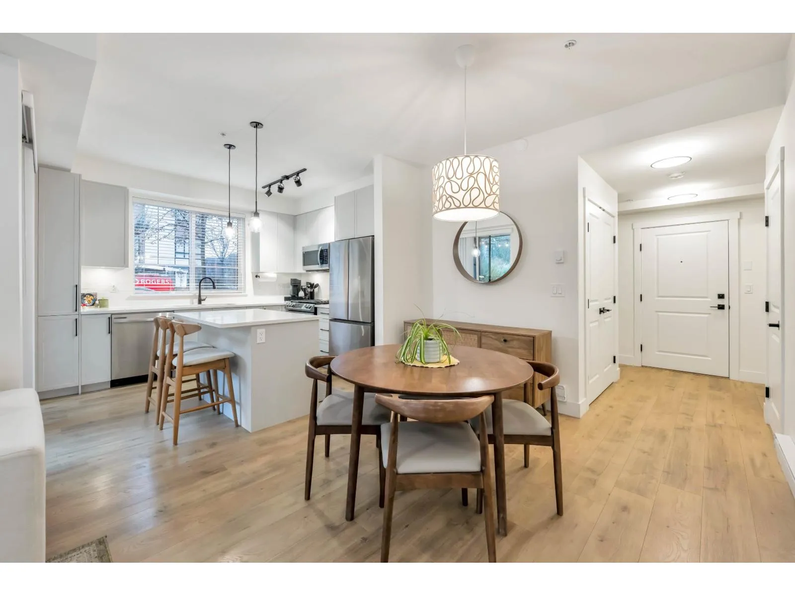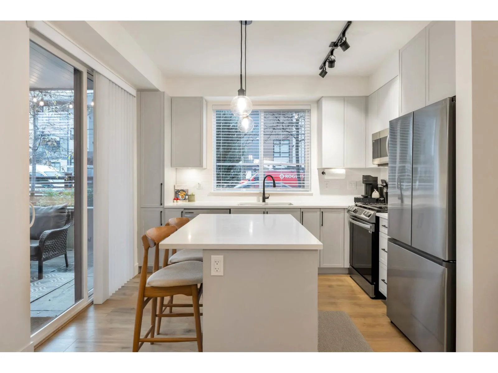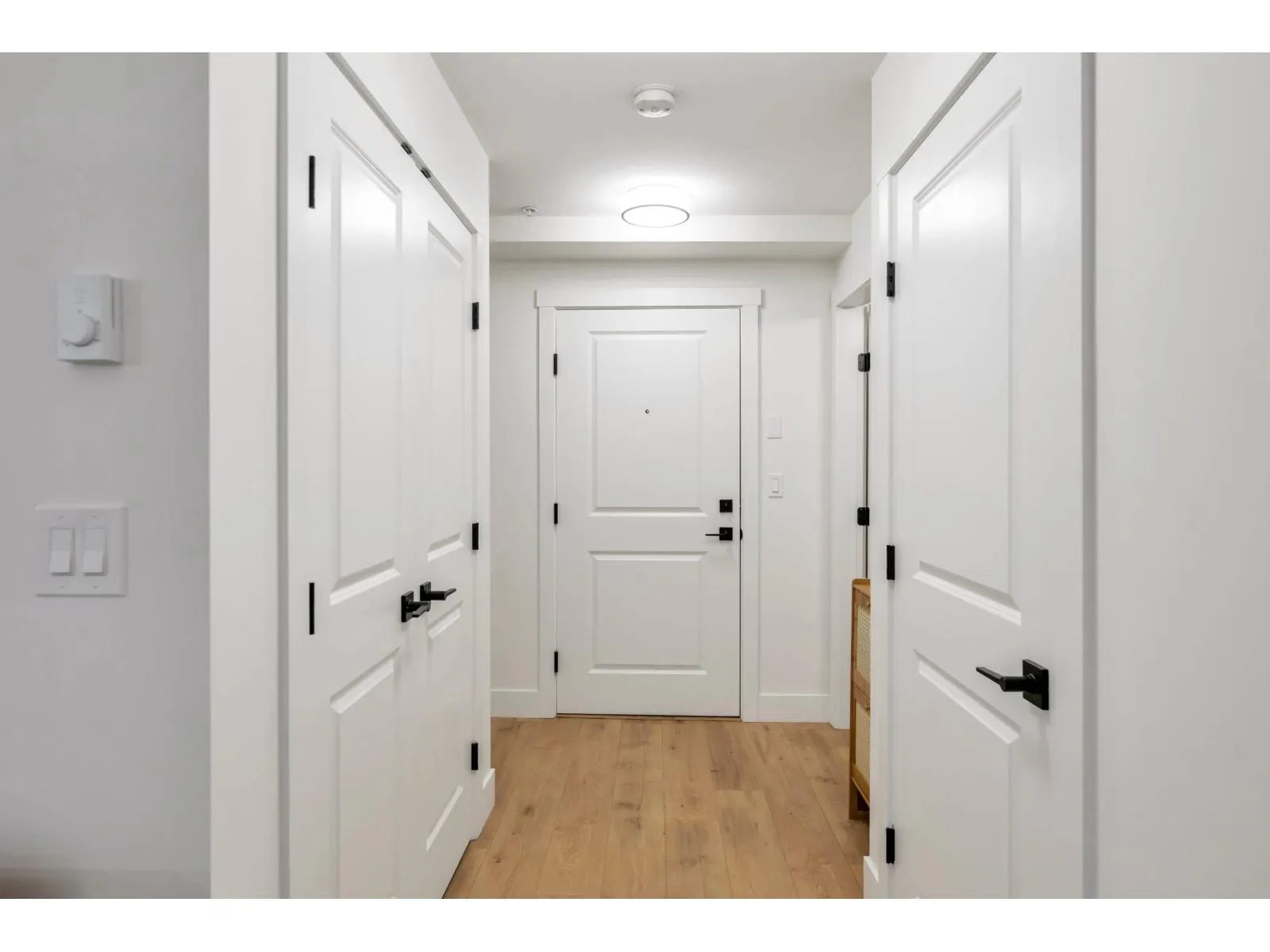 Bright, open, southwest-facing 2-bed, 2-bath corner home with a highly sought-after ground-level walkout patio, built by award-winning Zenterra. Excellent floor plan with 9 ft ceilings and vinyl plank flooring throughout. The kitchen features shaker-style cabinetry with a pantry, Samsung stainless-steel appliances with a gas range, a large island, quartz countertops, and an undermount sink. Two spacious bedrooms plus a bonus linen/storage area. Gas hookup on the patio. Unbeatable location: walk to coffee shops, restaurants, fitness facilities, and the Langley Events Centre. Future rapid transit will connect this area directly to SkyTrain. One underground parking, with more available to rent/purchase, plus plenty of street parking right out front. (id:27476)