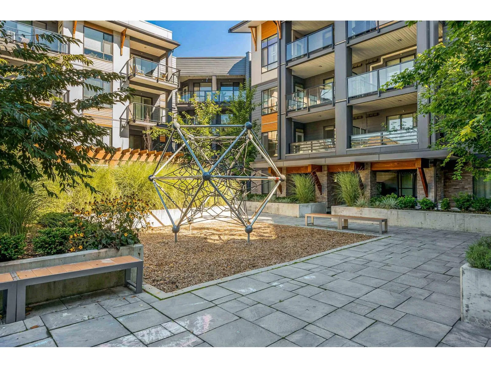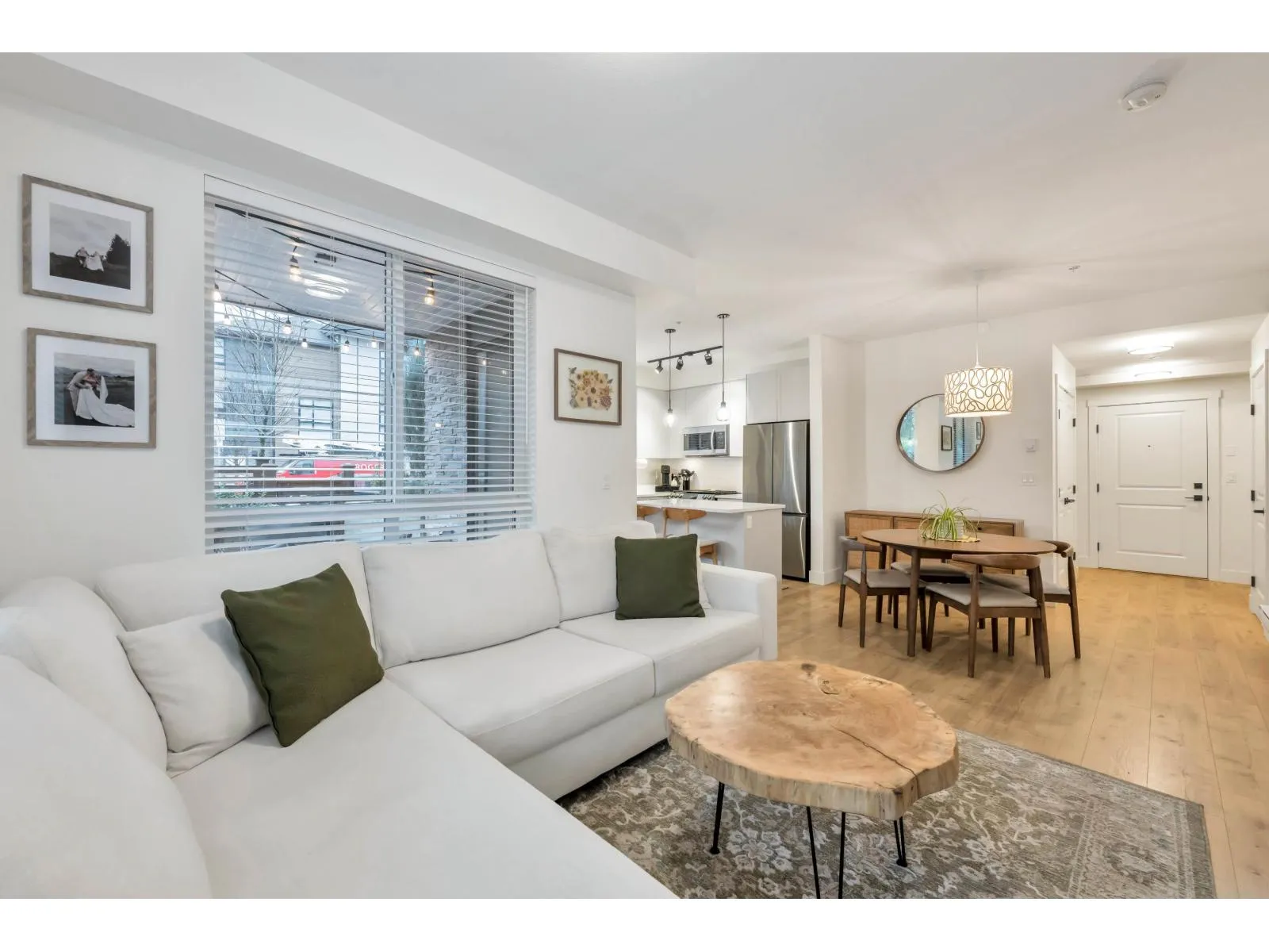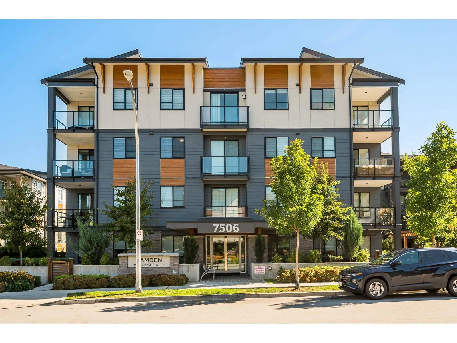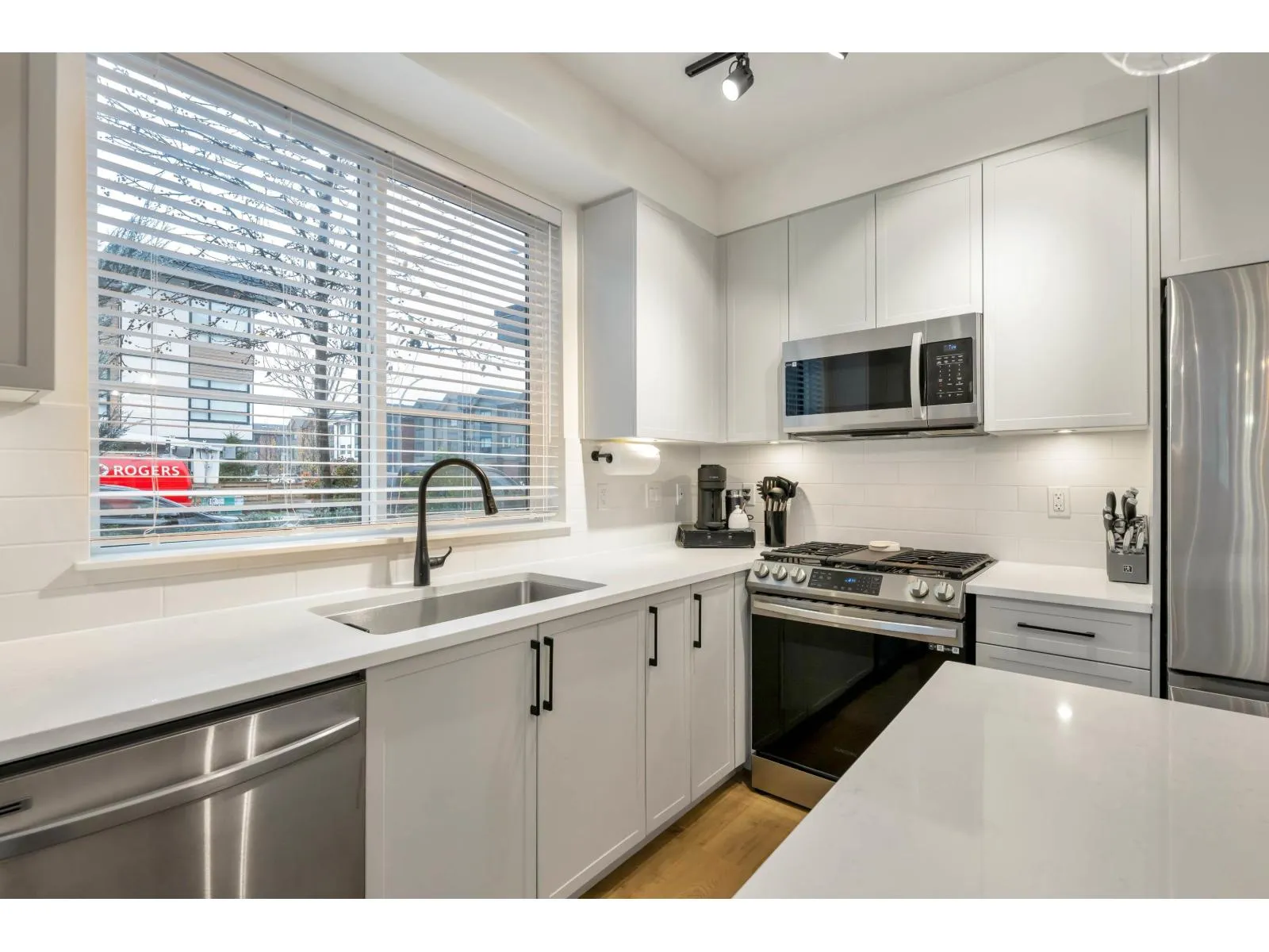 Bright, open, southwest-facing 2-bed, 2-bath corner home with a highly sought-after ground-level walkout patio, built by award-winning Zenterra. Excellent floor plan with 9 ft ceilings and vinyl plank flooring throughout. The kitchen features shaker-style cabinetry with a pantry, Samsung stainless-steel appliances with a gas range, a large island, quartz countertops, and an undermount sink. Two spacious bedrooms plus a bonus linen/storage area. Gas hookup on the patio. Unbeatable location: walk to coffee shops, restaurants, fitness facilities, and the Langley Events Centre. Future rapid transit will connect this area directly to SkyTrain. One underground parking, with more available to rent/purchase, plus plenty of street parking right out front. (id:27476)