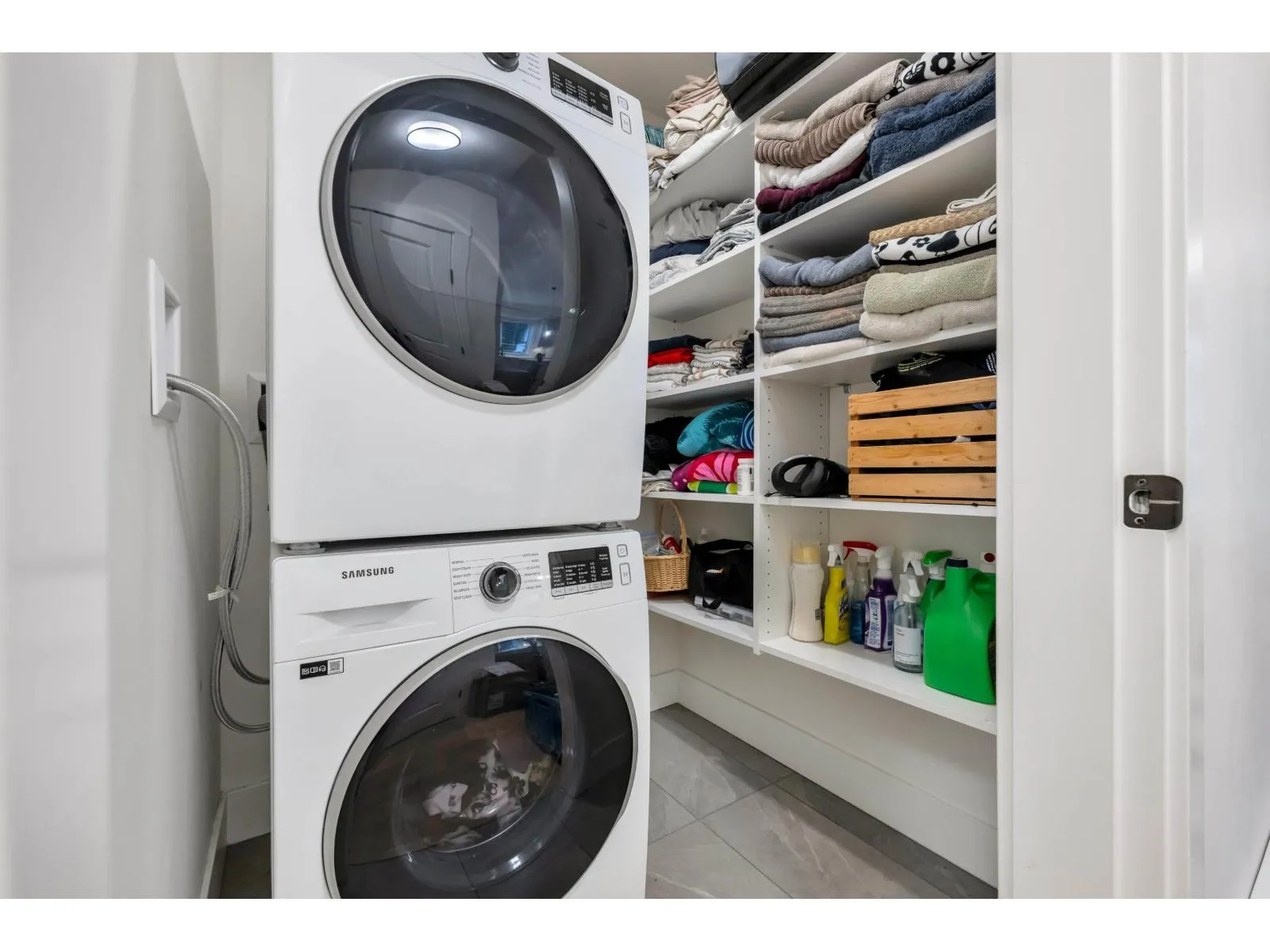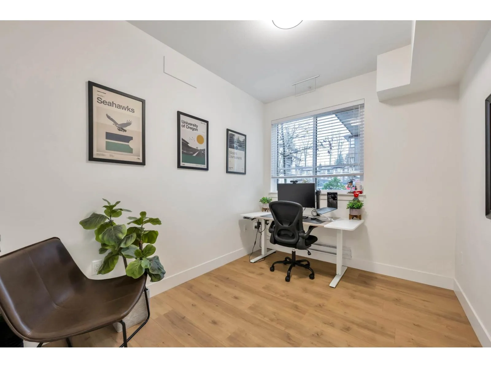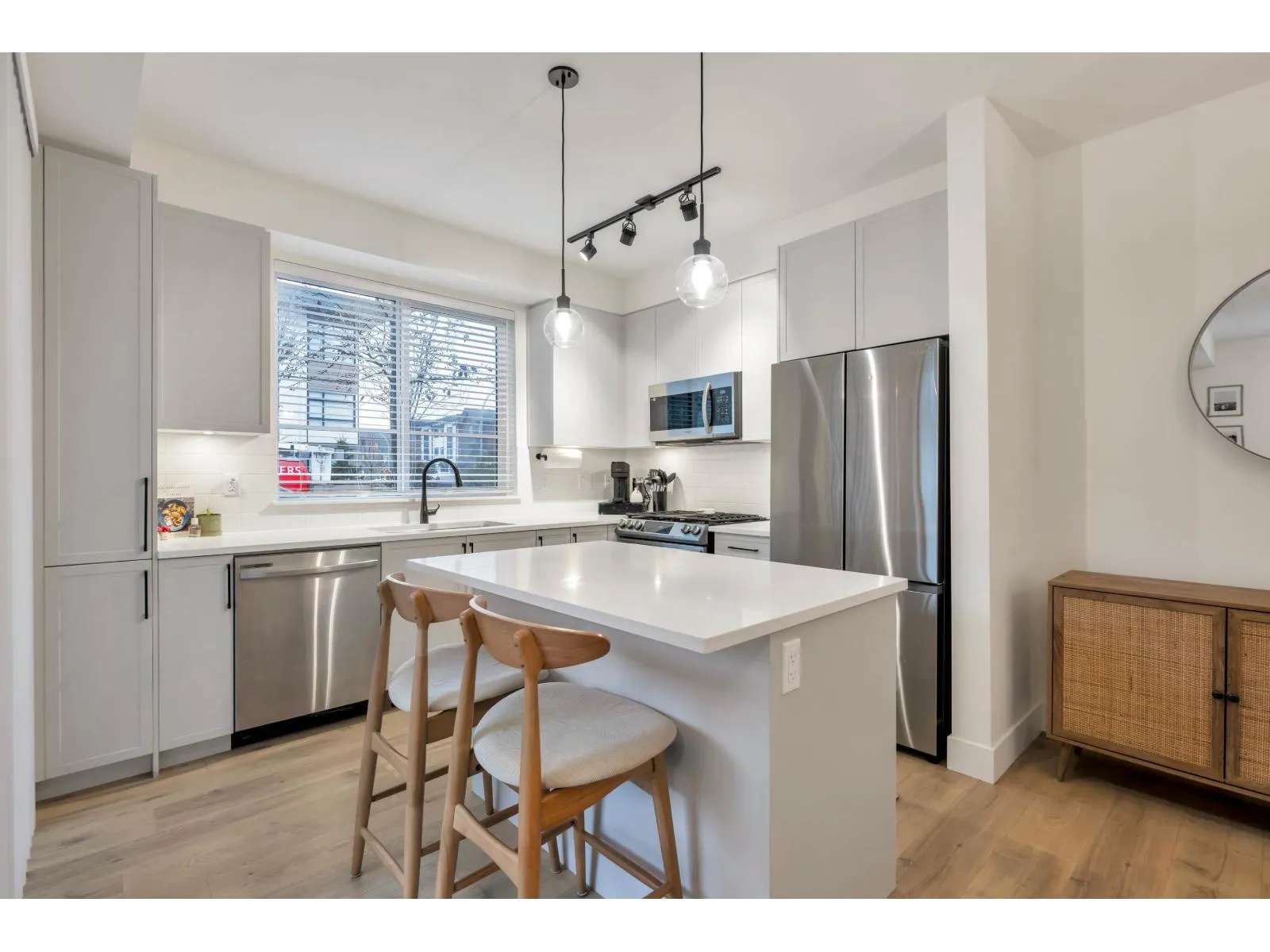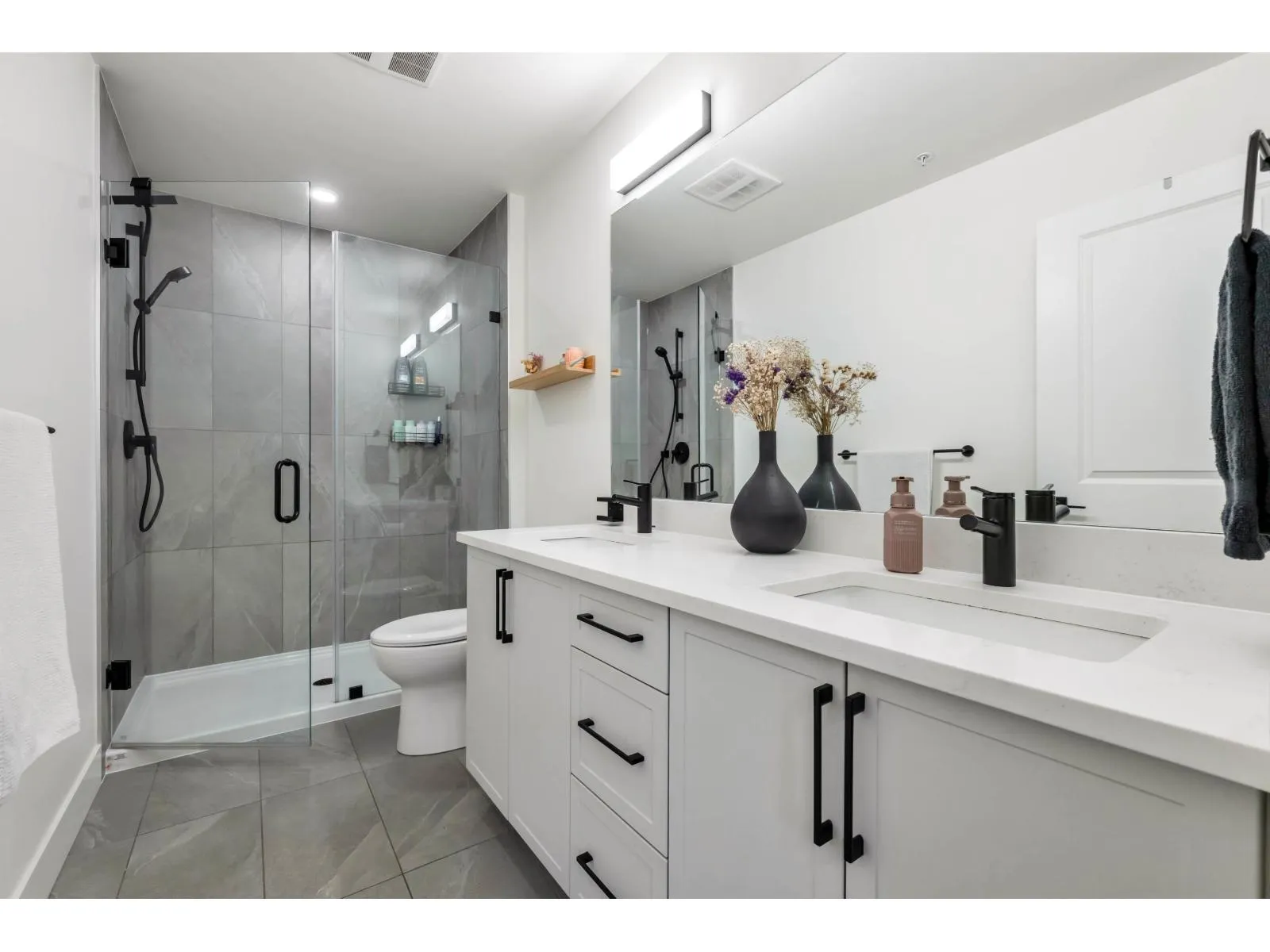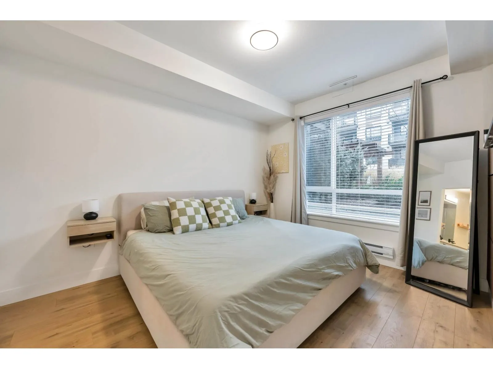 Bright, open, southwest-facing 2-bed, 2-bath corner home with a highly sought-after ground-level walkout patio, built by award-winning Zenterra. Excellent floor plan with 9 ft ceilings and vinyl plank flooring throughout. The kitchen features shaker-style cabinetry with a pantry, Samsung stainless-steel appliances with a gas range, a large island, quartz countertops, and an undermount sink. Two spacious bedrooms plus a bonus linen/storage area. Gas hookup on the patio. Unbeatable location: walk to coffee shops, restaurants, fitness facilities, and the Langley Events Centre. Future rapid transit will connect this area directly to SkyTrain. One underground parking, with more available to rent/purchase, plus plenty of street parking right out front. (id:27476)