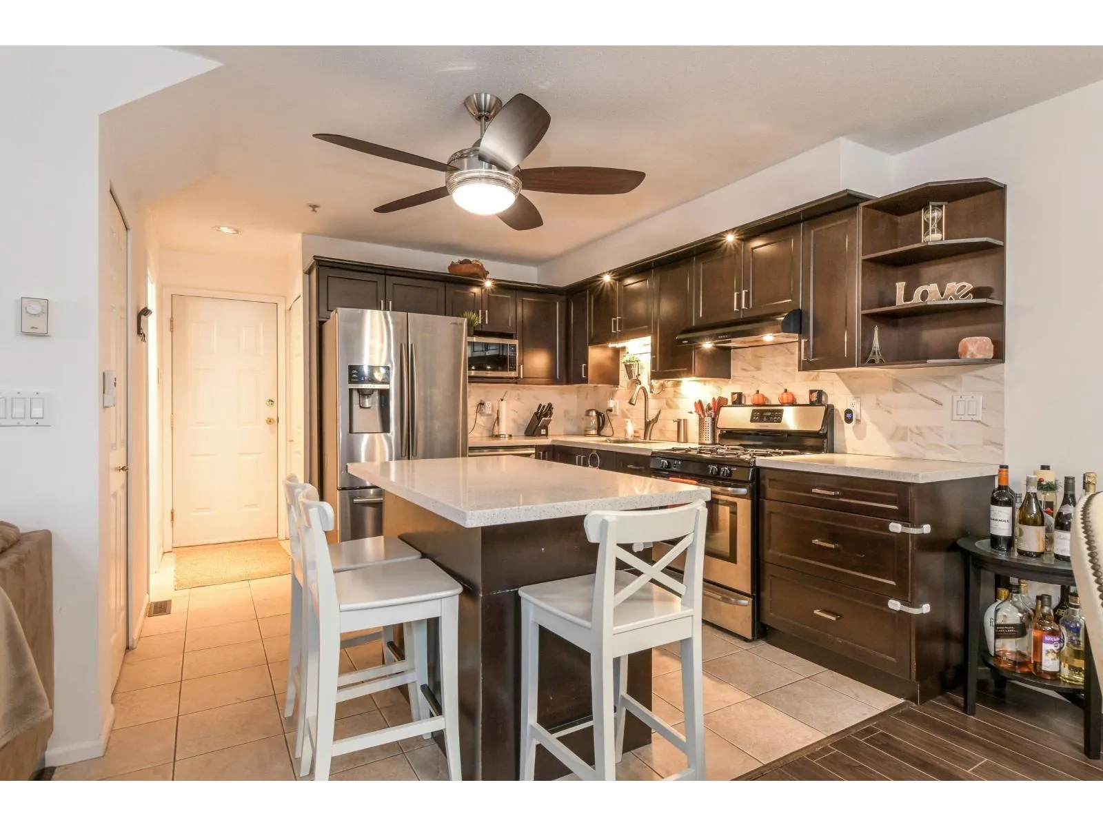 DELIGHTFUL KEW GARDENS BEAUTY!!! There's Ice Cream & then there is Gelato + your favourite flavour - this highly sought after Fairview plan. You will love it!! Great quiet & private, middle of the complex location. Beautiful treed, secluded backyard with wonderful patio deck. Superb, open floor plan - incredible glass solarium in living room. Island kitchen includes quartz counter tops, bright, clean backsplash and gas stove. Den at entry makes for a great home office. Enjoy your very own upstairs laundry room. Fabulous arched 2nd bedroom window with window seat. Mountain views. Huge primary bdrm. 2 car garage with tub sink. Air Conditioning, furnace & hot water tank in 2021 & New Roof & Gutters 2019. Walking distance to the finest schools, parks, recreation centre & transportation. (id:27476)