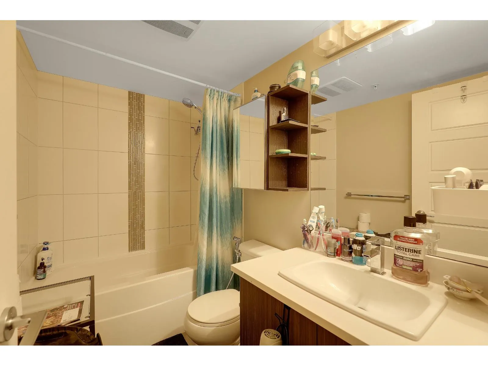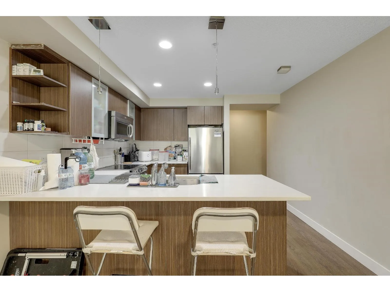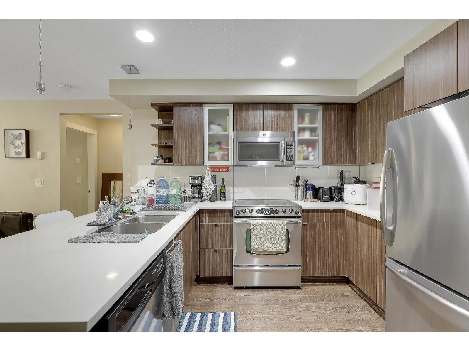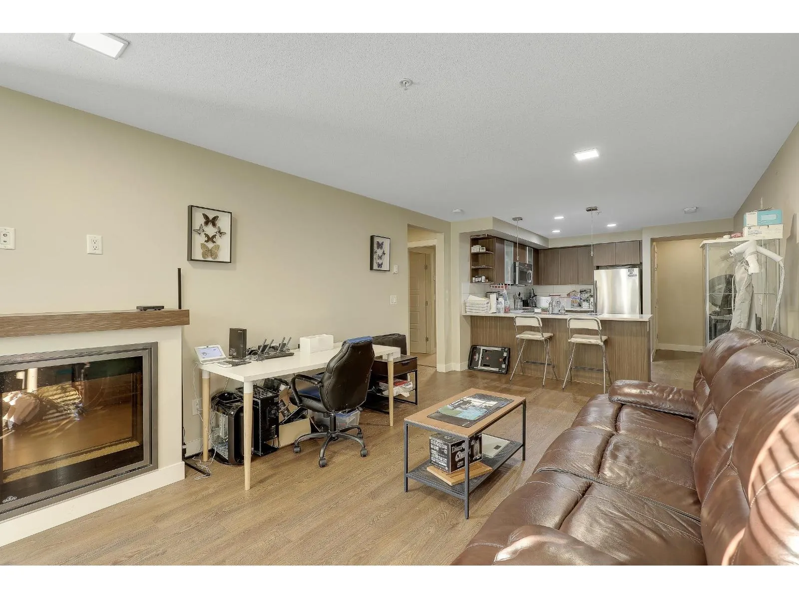 SOUTH-FACING 2 BED 2 BATH CORNER UNIT ON THE QUIET SIDE OF THE BUILDING! This bright, functional layout offers a gourmet kitchen with stainless steel appliances, modern full-wrap cabinets, under-cabinet lighting & Caesarstone counters. Spacious living/dining area with built-in fireplace & covered deck access. Primary bedroom features walk-in closet & 4-pc ensuite. Moen fixtures, ceramic tile & premium finishes throughout. Includes secure parking, storage locker & 2 elevators. Pets & rentals allowed. Beautiful, well-managed building close to shopping, parks & transit. (id:27476)