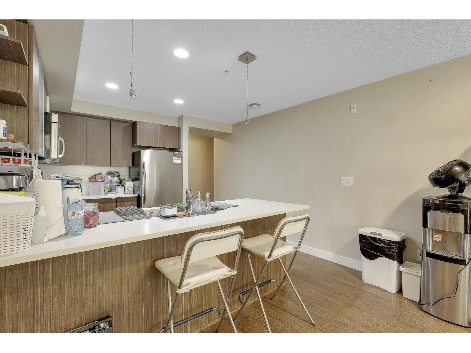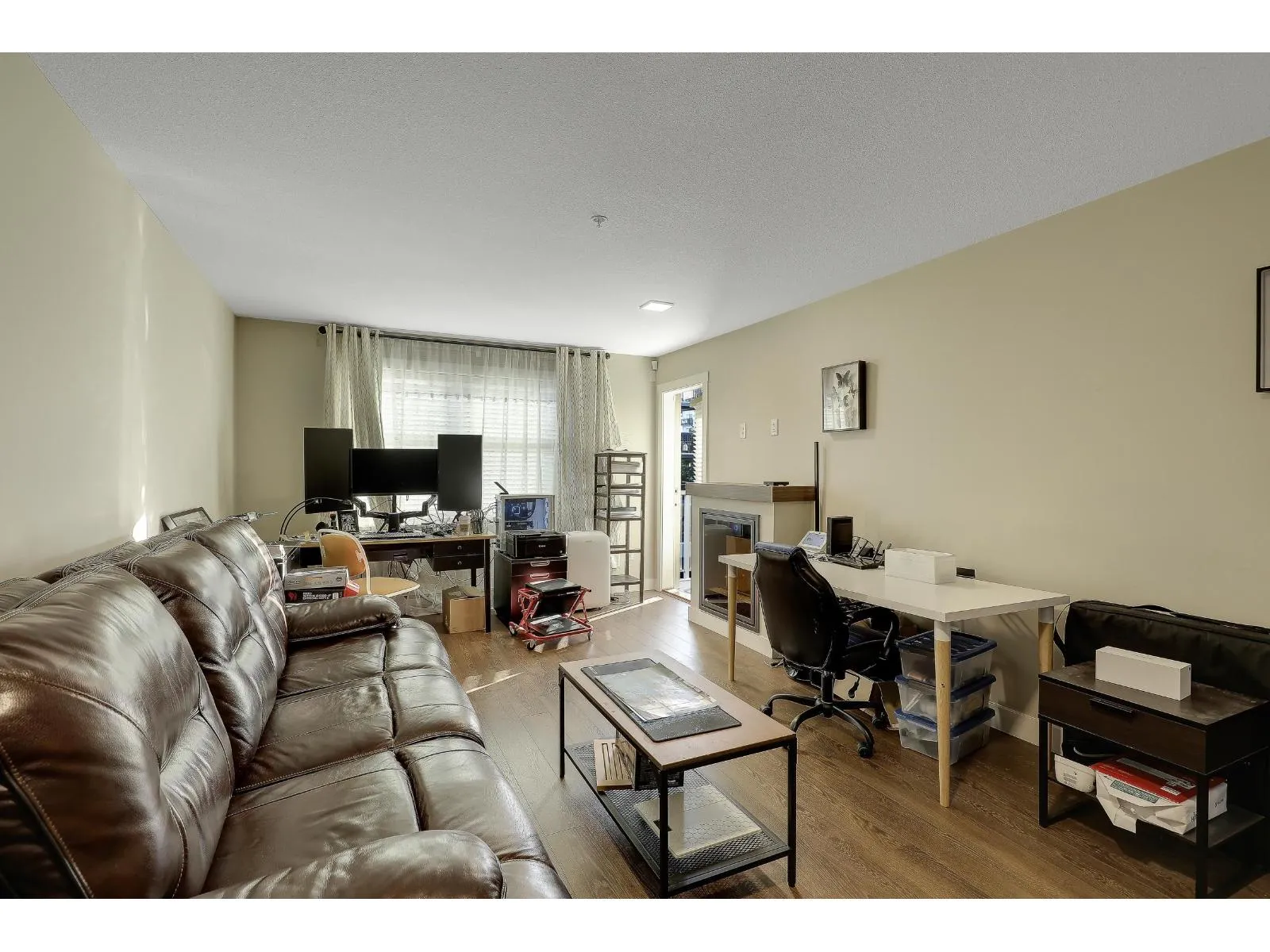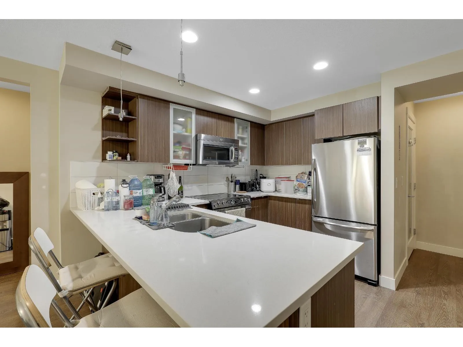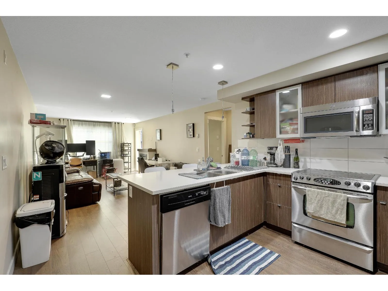 SOUTH-FACING 2 BED 2 BATH CORNER UNIT ON THE QUIET SIDE OF THE BUILDING! This bright, functional layout offers a gourmet kitchen with stainless steel appliances, modern full-wrap cabinets, under-cabinet lighting & Caesarstone counters. Spacious living/dining area with built-in fireplace & covered deck access. Primary bedroom features walk-in closet & 4-pc ensuite. Moen fixtures, ceramic tile & premium finishes throughout. Includes secure parking, storage locker & 2 elevators. Pets & rentals allowed. Beautiful, well-managed building close to shopping, parks & transit. (id:27476)