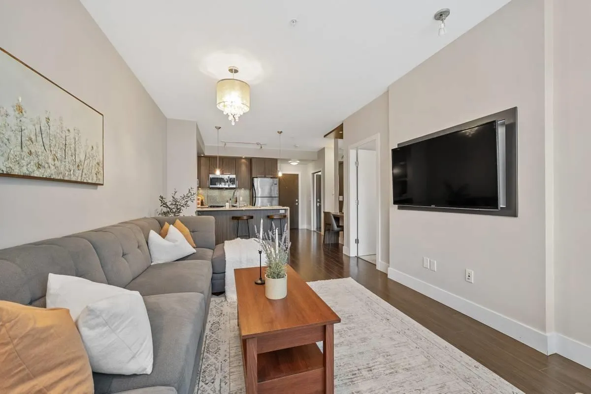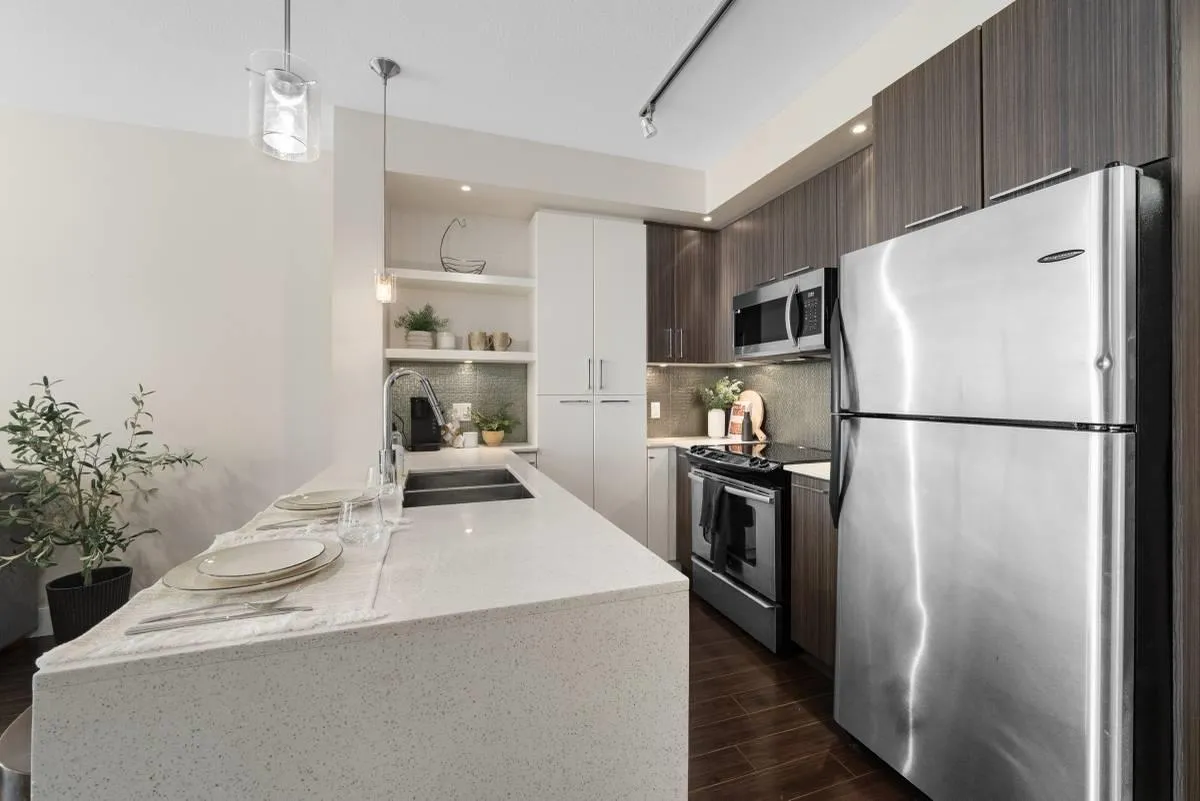 Modern ground-level condo for rent at The Elements in the heart of Willoughby Heights, just steps to transit, shopping, restaurants, and everyday conveniences. This bright, ground-level unit features high ceilings, a contemporary open layout with excellent natural light, modern flair with built-in shelving, in-suite laundry, dishwasher and microwave, and is pet friendly with no size restrictions. A storage locker conveniently located on the same floor and one underground parking stall are included. Residents enjoy access to impressive two-level amenities including a fully equipped gym, yoga studio, and an entertainment/lounge room perfect for hosting or relaxing. Available January onwards. (id:27476)