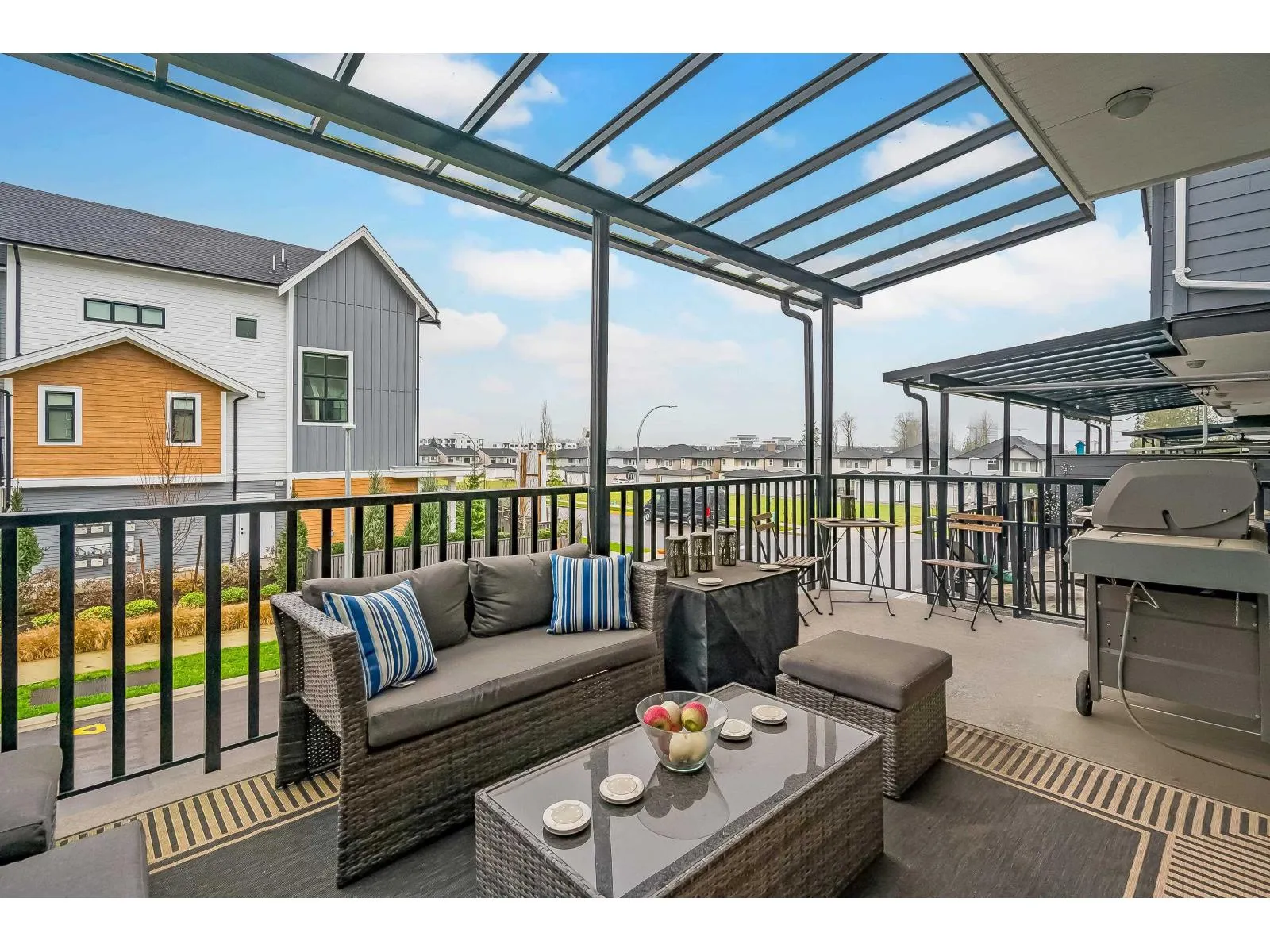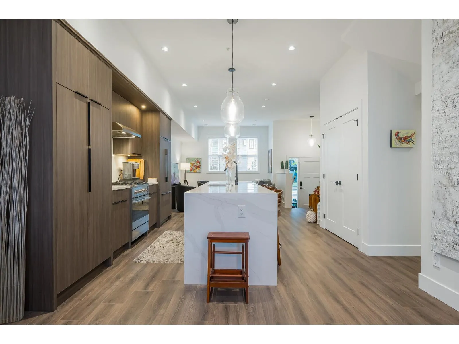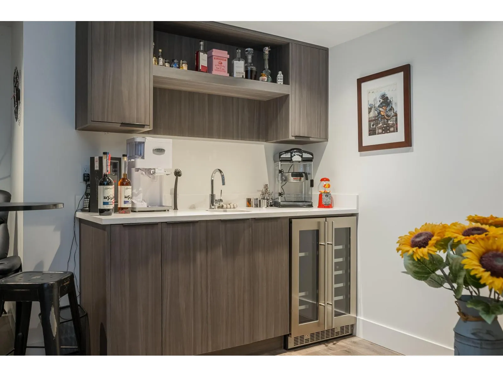 Exceptionally built END-UNIT ROWHOME by North Arc Properties with NO STRATA FEES. This spacious & meticulously maintained home shows like new and offers extensive upgrades throughout. Enjoy A/C, a chef-inspired kitchen w/ wine fridge and Fisher & Paykel appliances complemented by high-end finishes throughout. The professionally finished basement is ideal for guests or entertaining, showcasing a custom bar w/sink, wine storage, cabinetry & bar fridge, plus a developer-installed soundproofed bedroom. Well-sized bedrooms with potential to add 5th bedroom upstairs. Enjoy year-round outdoor living on the covered deck with gas BBQ hookup and custom awning. Rare 4-vehicle parking with double garage (epoxy floors) plus parking pad. A standout home offering privacy, space and luxury without strata. (id:27476)
