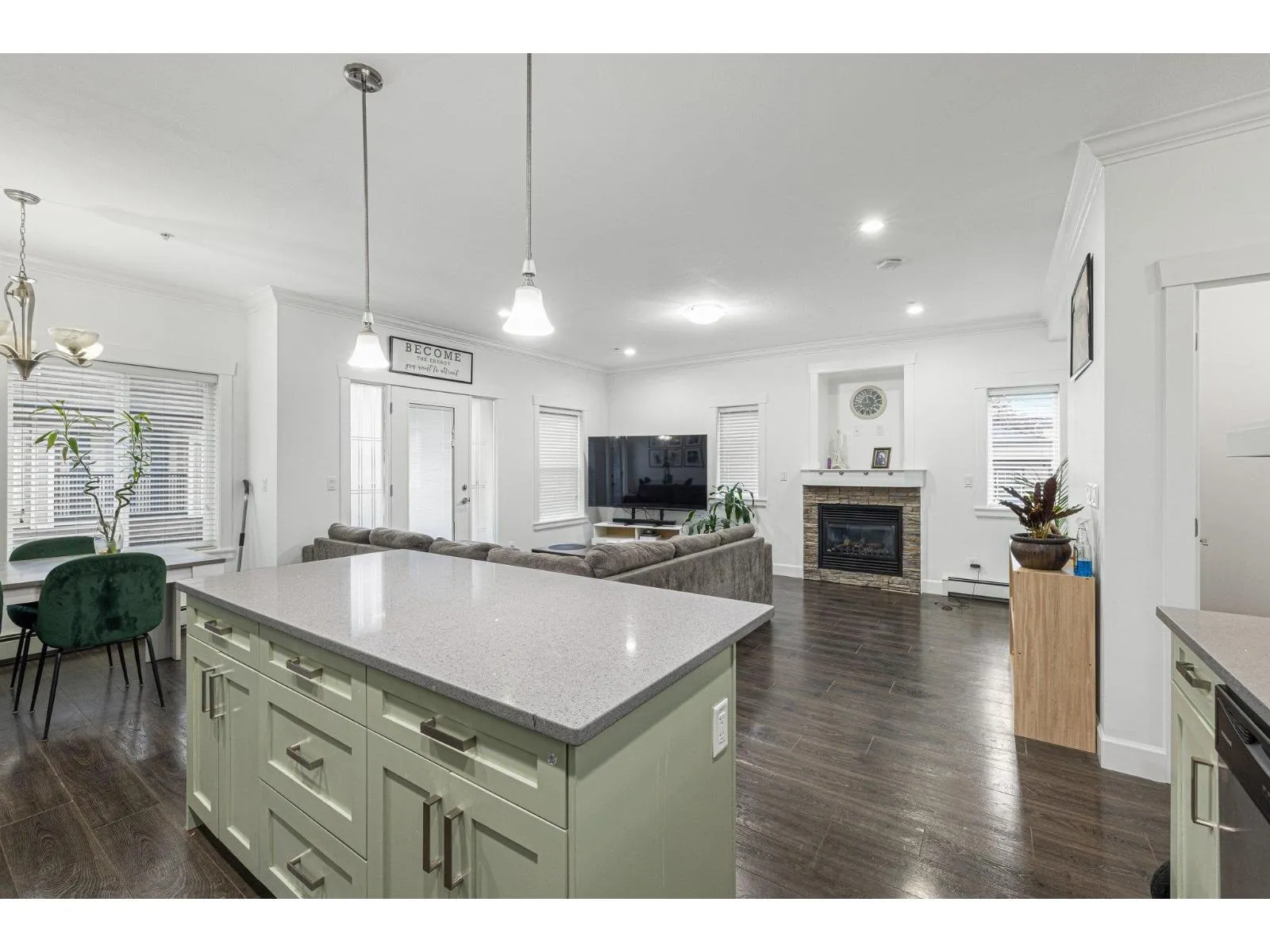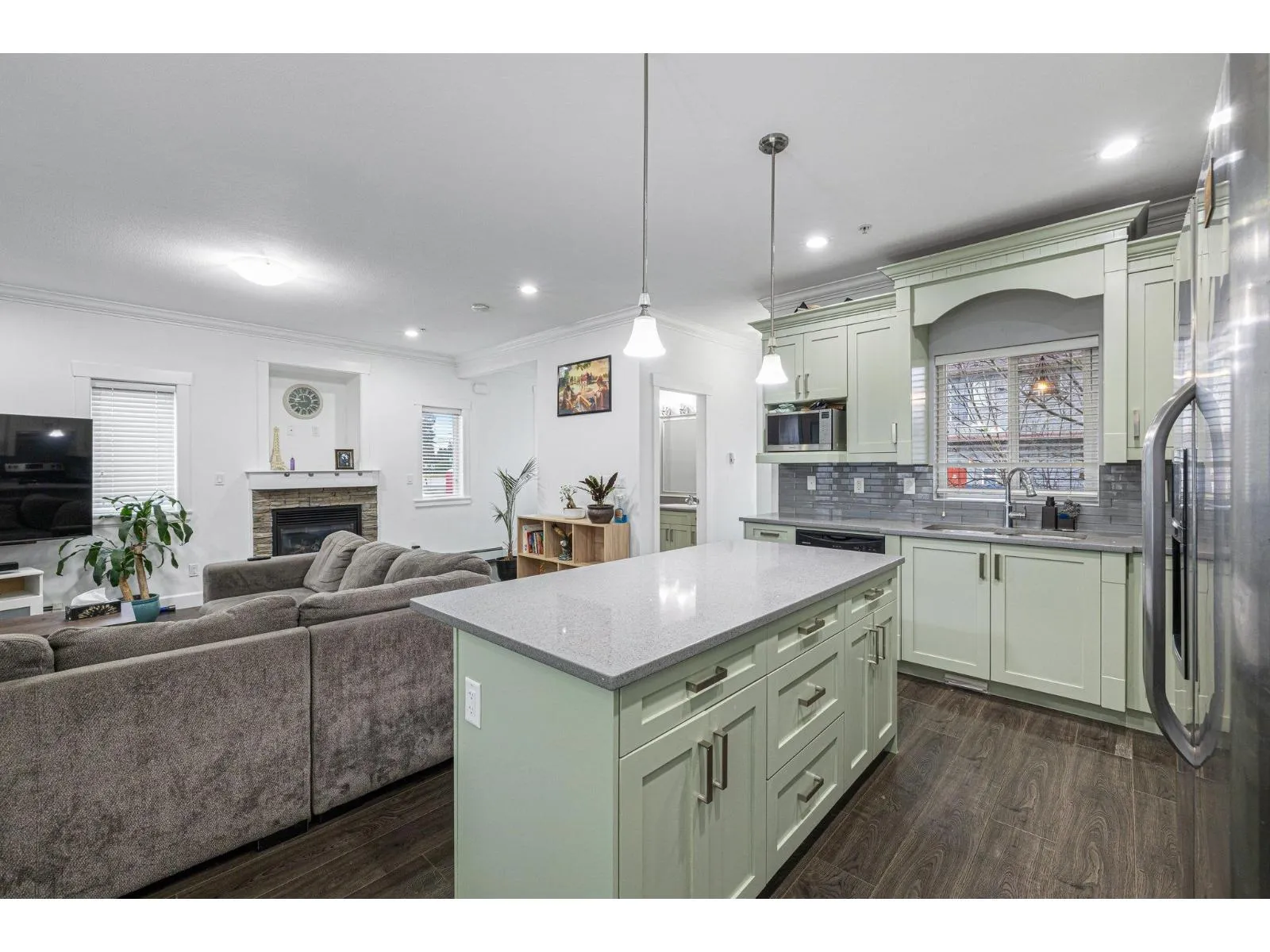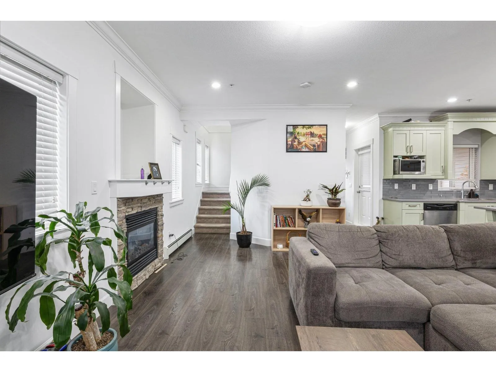 This beautifully updated end-unit townhome offers quartz countertops, soft-close cabinets, stainless steel appliances, crown moldings, designer colours, and an on-demand hot water system. The side-by-side garage provides ample space. The main level features a spacious great room with laminate floors, a gas fireplace, and a Juliet balcony. The gorgeous kitchen boasts an off-white island with a breakfast bar, plus access to a covered balcony with a gas hookup and stairs to the backyard. A powder room completes this level. Upstairs, find three bedrooms, two baths, including a primary suite with a three-piece ensuite. The lower level offers a den with yard access, a laundry room, and bath.Affordable strata fees. Close to daycares, a new rec center, and a pool! (id:27476)