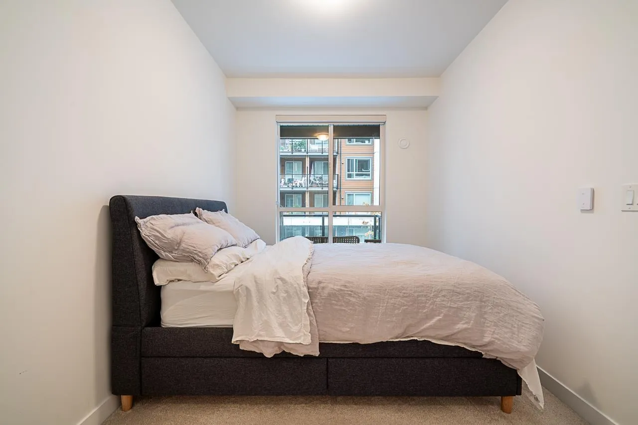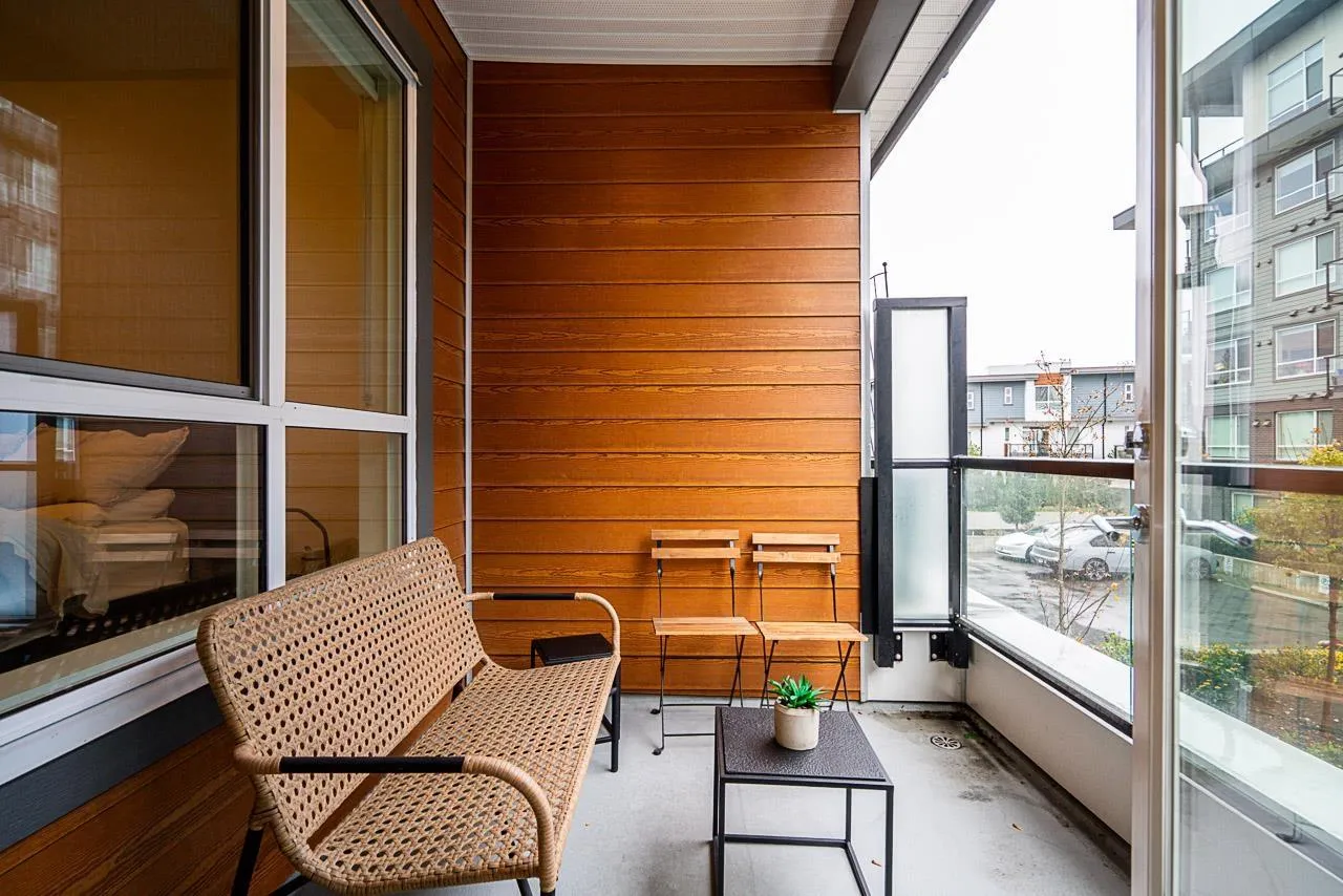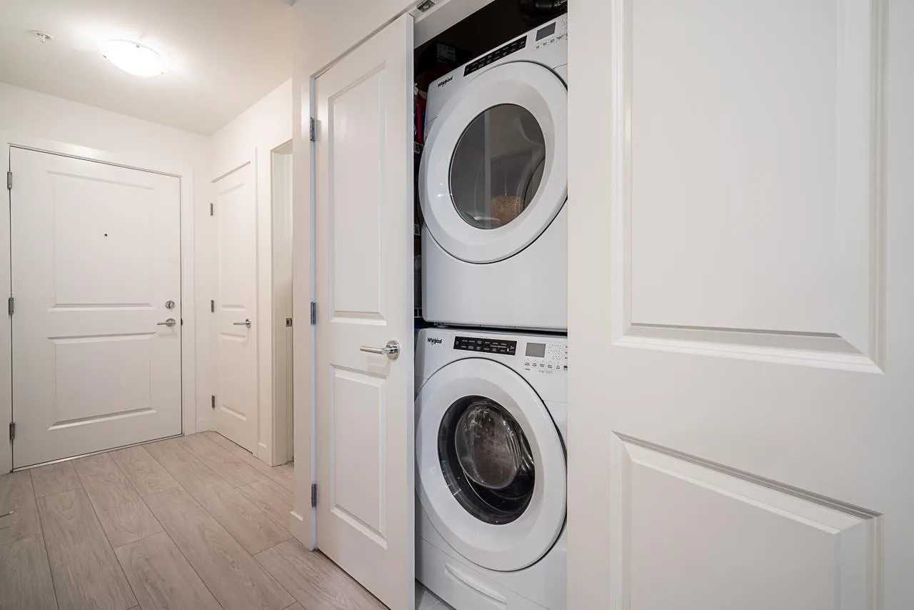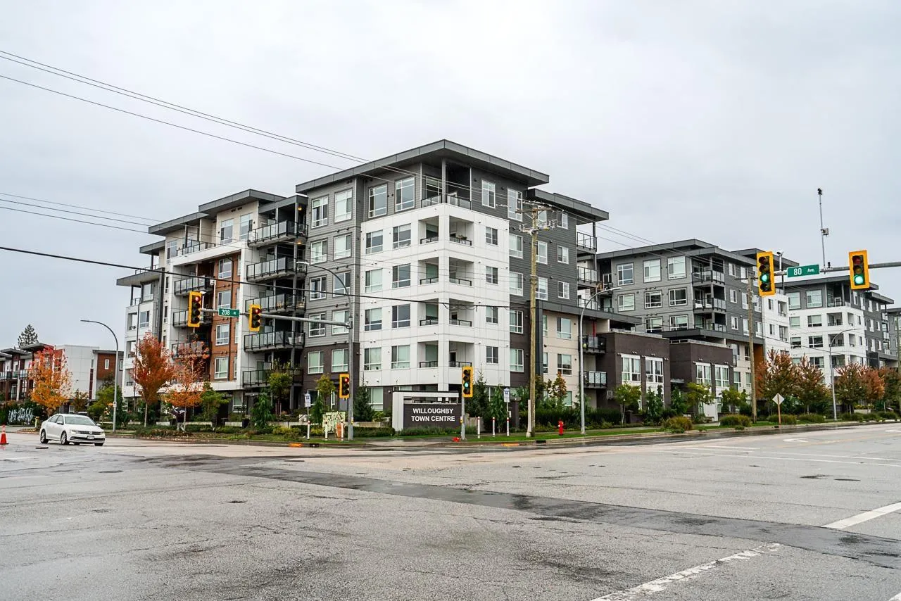 Prime Alexander Square location, steps from Willoughby Town Centre, restaurants, schools, transit, and highways. This like-new 1 bed plus den, 1 bath RDG home offers bright south-facing exposure overlooking the courtyard. The kitchen features quartz counters, Whirlpool stainless steel appliances, washer/dryer, microwave, and a Mysa smart thermostat. The bedroom and walk-in closet are carpeted for comfort. Parking access via 80th St. and through the adjacent townhouse with fob entry to the two-level parkade. Amenities include a gym, lounge, rooftop deck with BBQs, courtyard with fire pits, and community garden plots. Well-run strata includes hot water and caretaker, offering move-in-ready comfort and convenience. (id:27476)