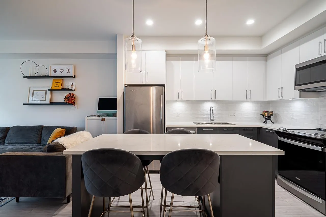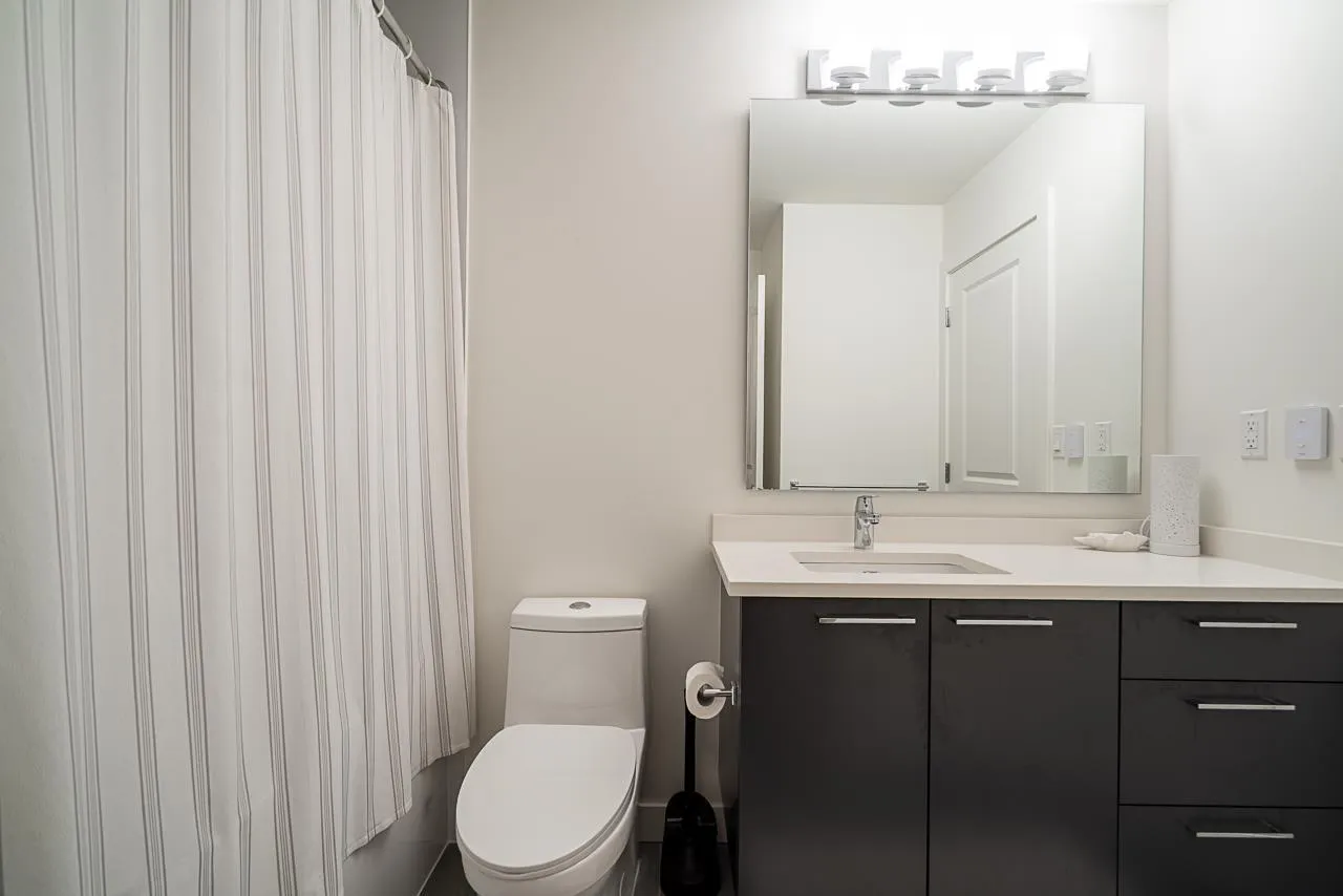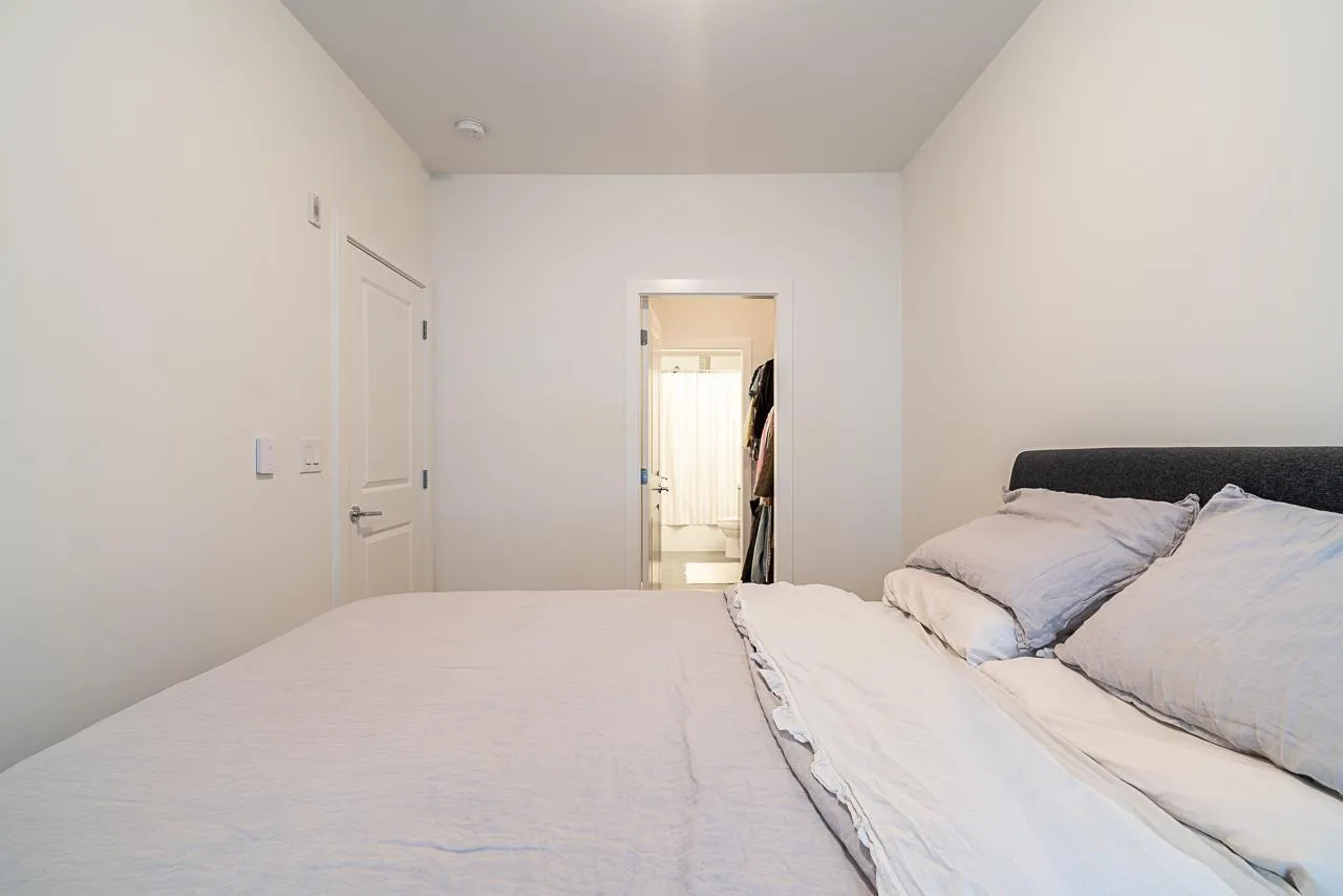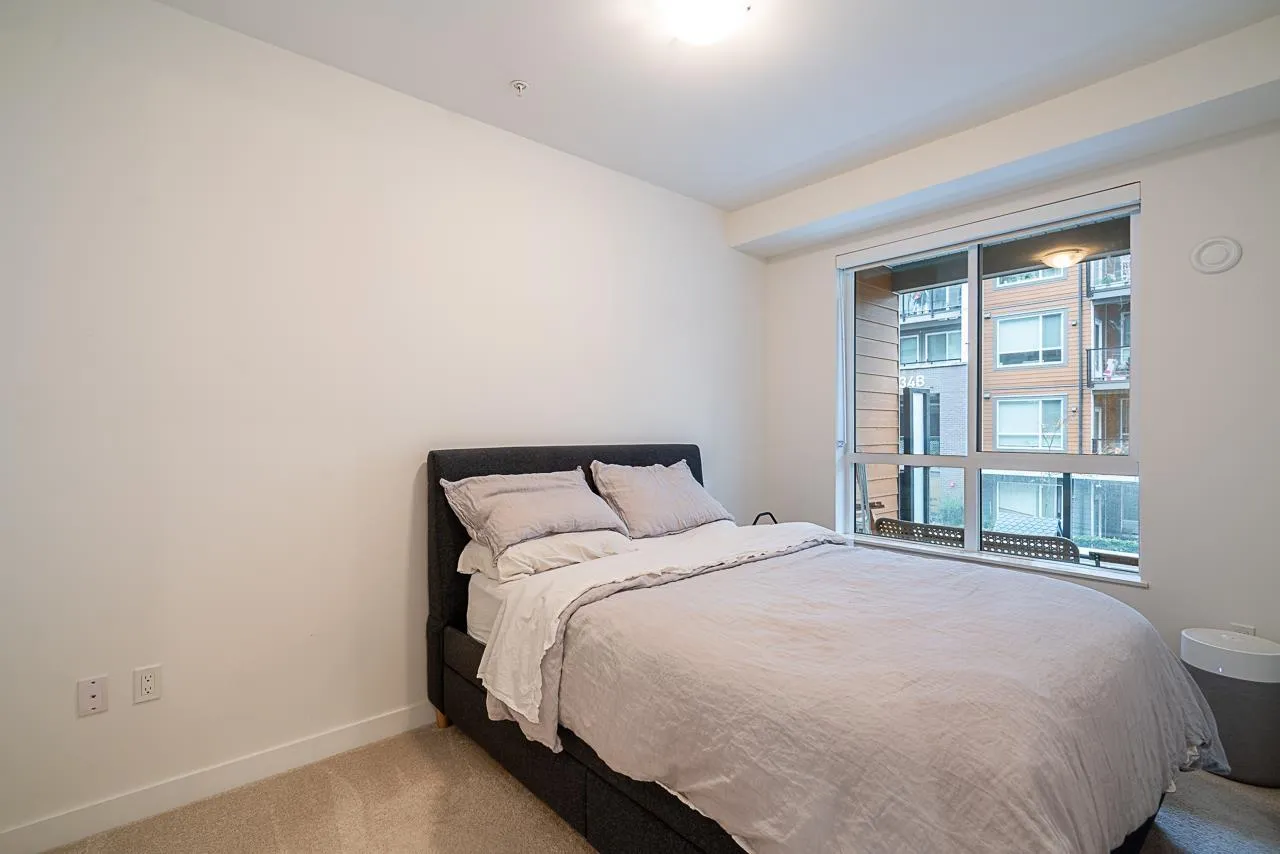 Prime Alexander Square location, steps from Willoughby Town Centre, restaurants, schools, transit, and highways. This like-new 1 bed plus den, 1 bath RDG home offers bright south-facing exposure overlooking the courtyard. The kitchen features quartz counters, Whirlpool stainless steel appliances, washer/dryer, microwave, and a Mysa smart thermostat. The bedroom and walk-in closet are carpeted for comfort. Parking access via 80th St. and through the adjacent townhouse with fob entry to the two-level parkade. Amenities include a gym, lounge, rooftop deck with BBQs, courtyard with fire pits, and community garden plots. Well-run strata includes hot water and caretaker, offering move-in-ready comfort and convenience. (id:27476)