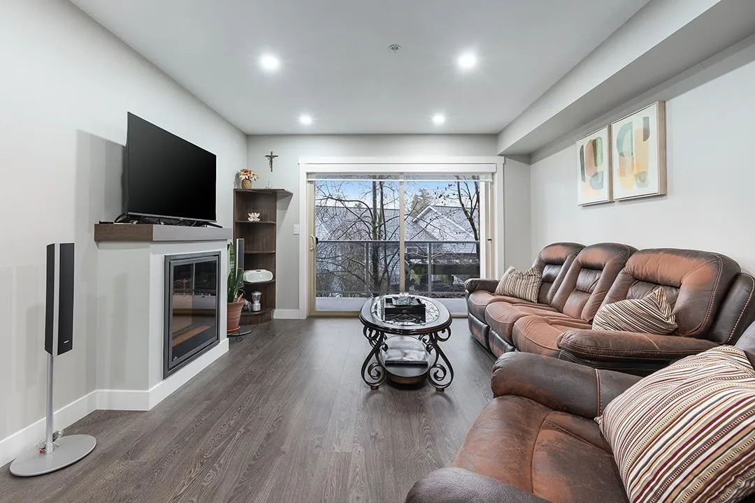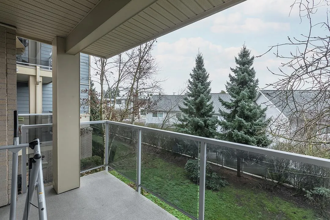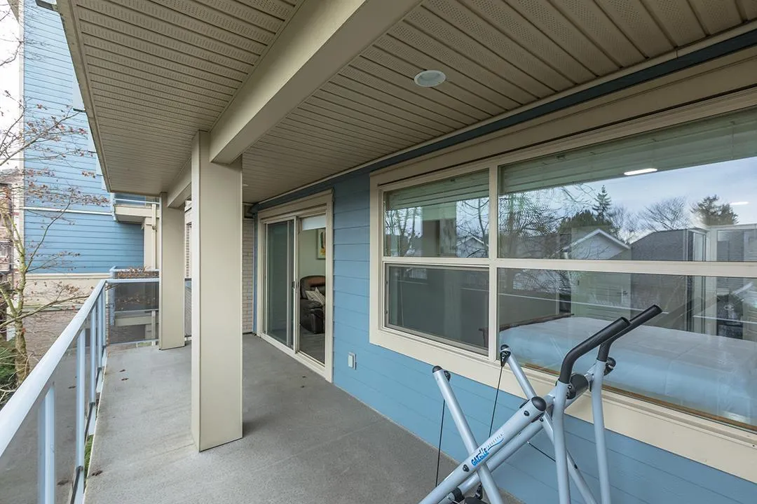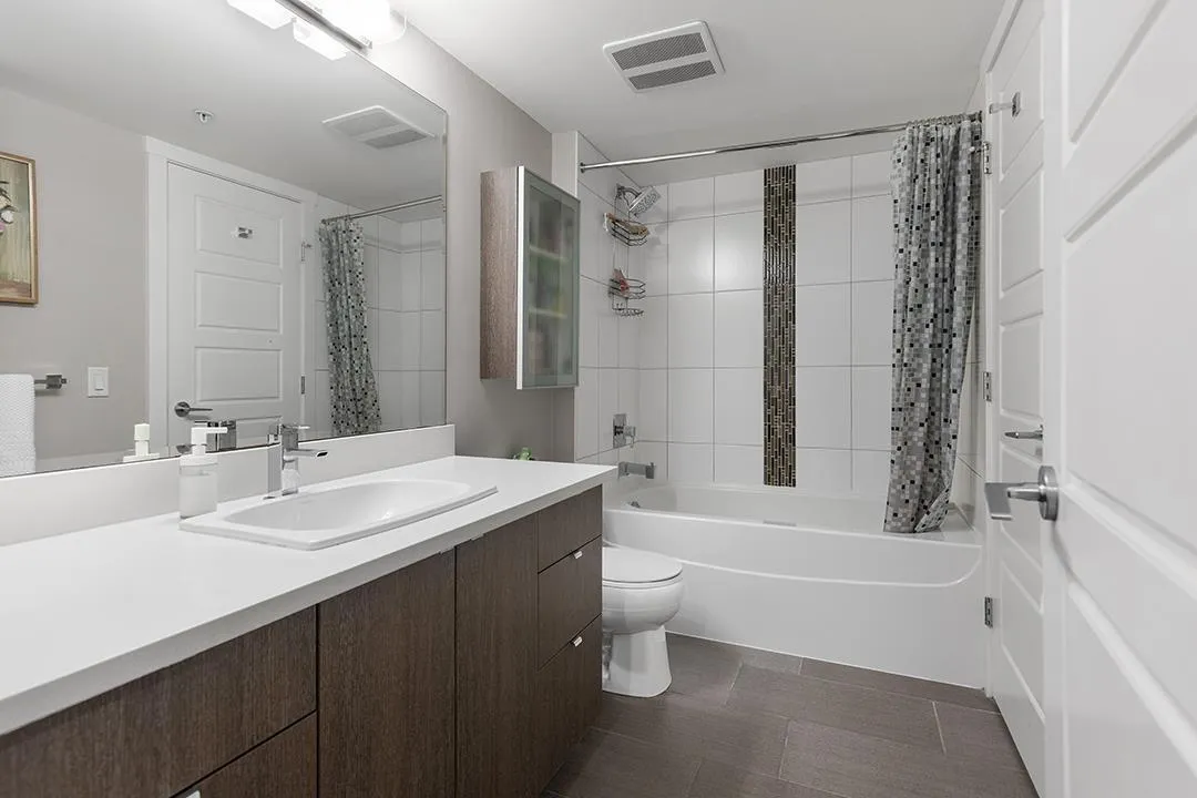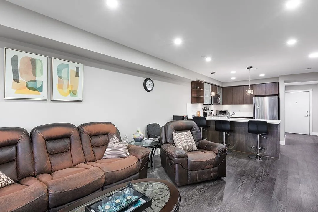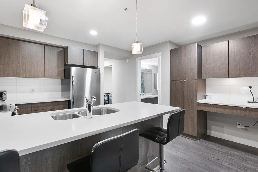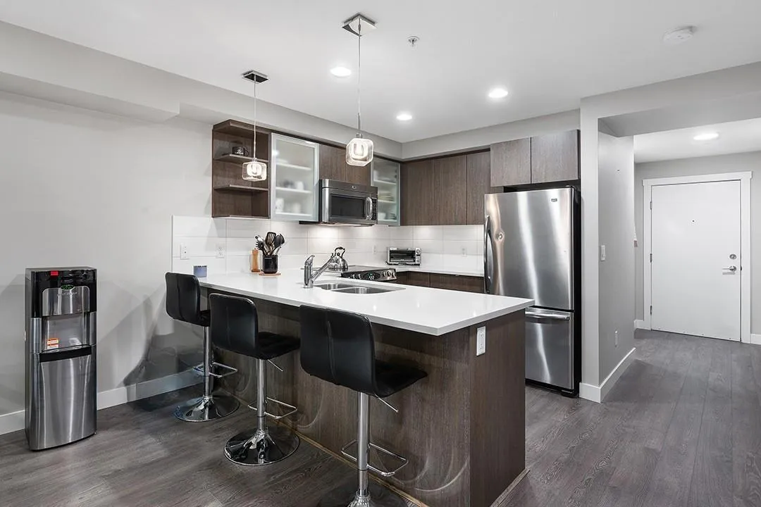 Well laid out 1 bedroom plus den and 2 bath home at Bearing Pointe facing the quiet side, featuring an oversized den with a closet that easily functions as a second bedroom, primary bedroom can accommodate king size furniture. The kitchen is bright and modern with stainless steel appliances, quartz countertops, sleek cabinetry, under cabinet lighting, a built in pantry and computer nook, plus a breakfast bar. Enjoy a cozy living area with fireplace that opens to a large covered deck surrounded by greenery for year round enjoyment. Additional highlights include updated lighting, a convenient powder room, and full size in suite laundry. Prime location close to shopping, transit, and parks. 1 parking and 2 pets allowed. (id:27476)