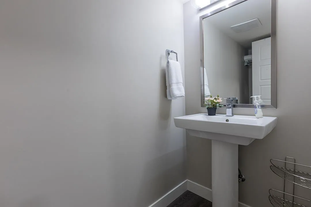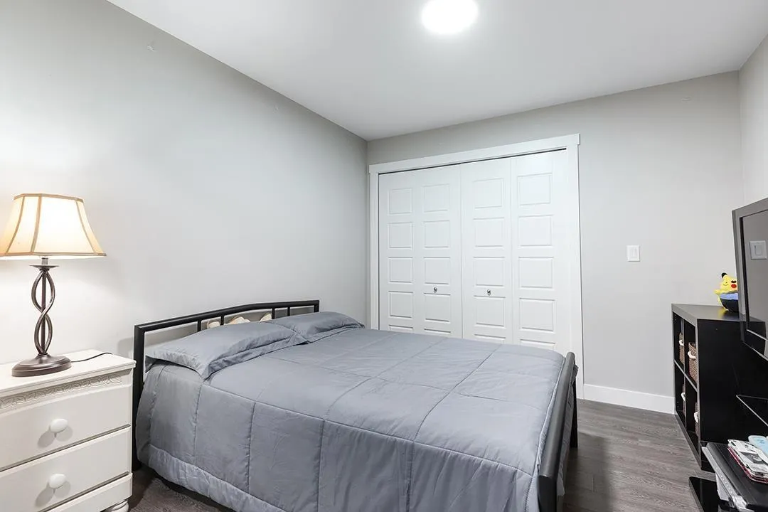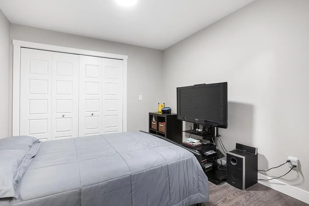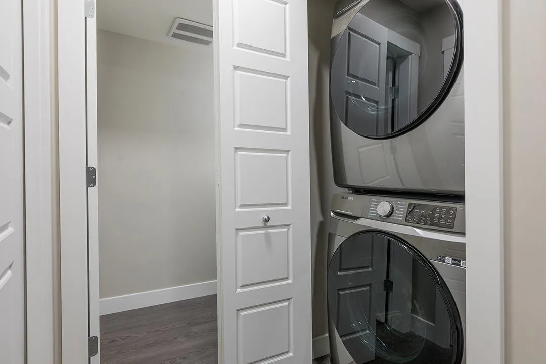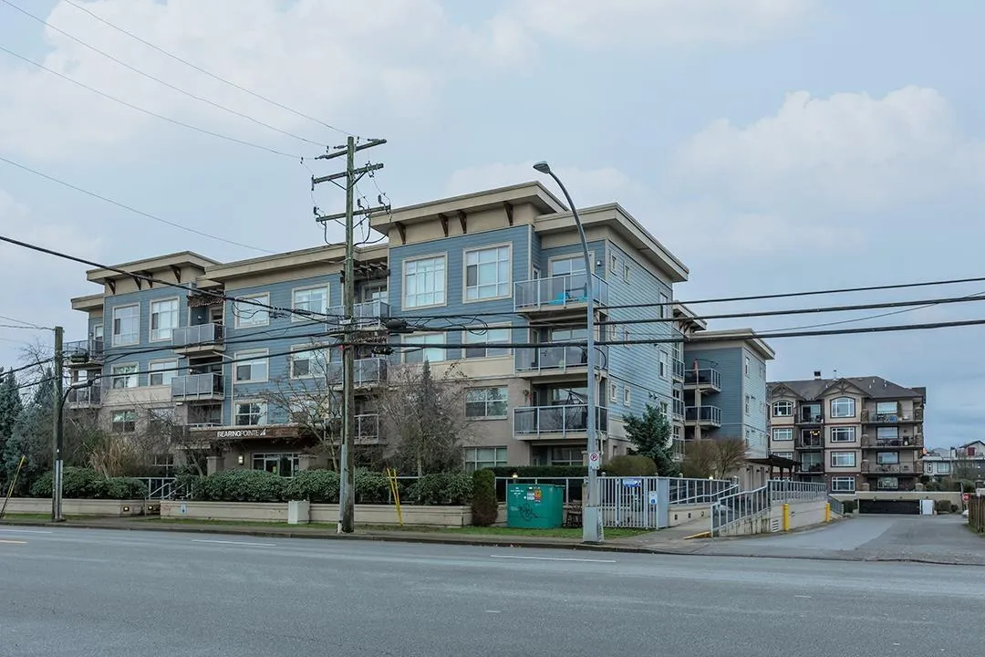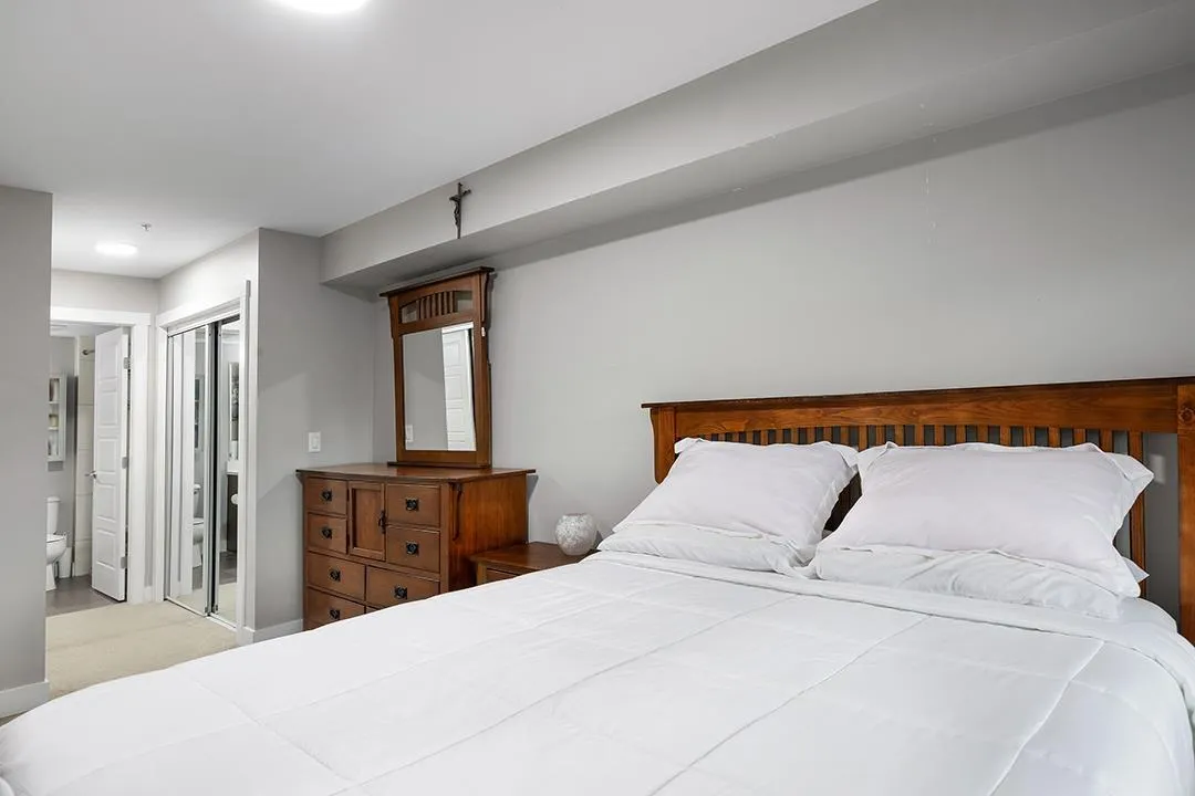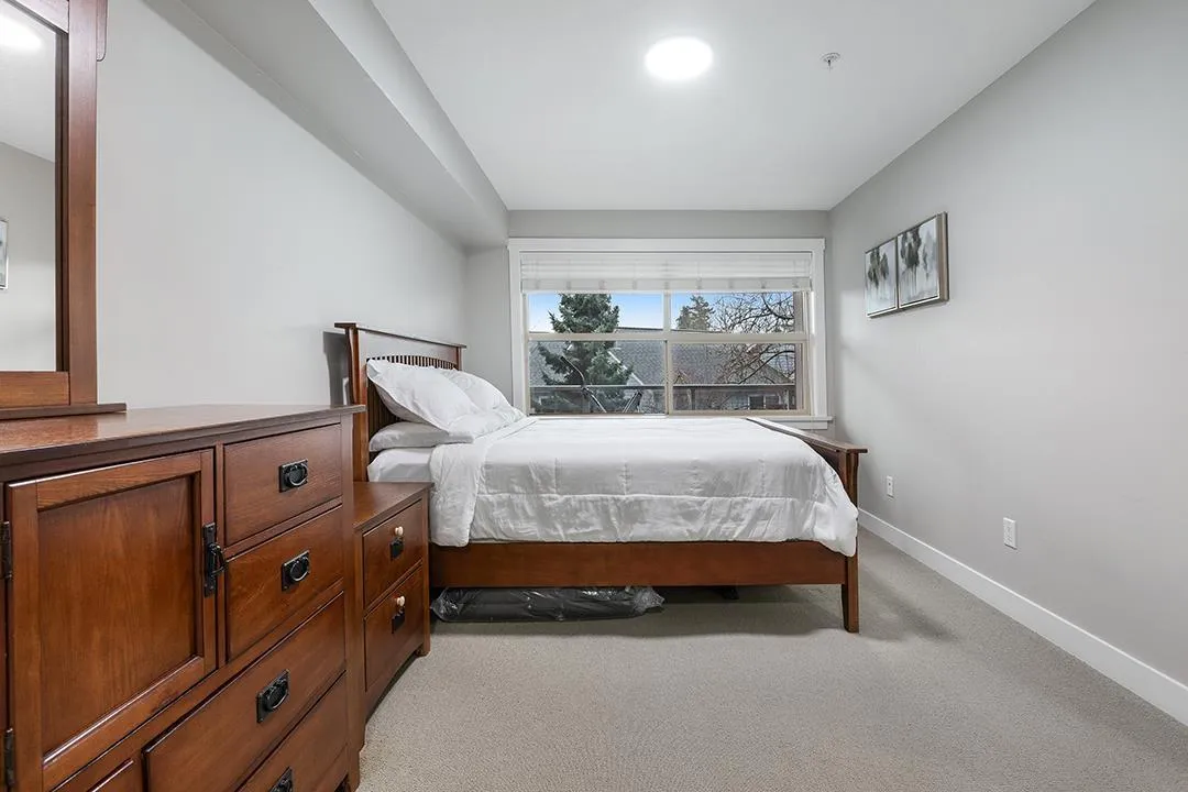 Well laid out 1 bedroom plus den and 2 bath home at Bearing Pointe facing the quiet side, featuring an oversized den with a closet that easily functions as a second bedroom, primary bedroom can accommodate king size furniture. The kitchen is bright and modern with stainless steel appliances, quartz countertops, sleek cabinetry, under cabinet lighting, a built in pantry and computer nook, plus a breakfast bar. Enjoy a cozy living area with fireplace that opens to a large covered deck surrounded by greenery for year round enjoyment. Additional highlights include updated lighting, a convenient powder room, and full size in suite laundry. Prime location close to shopping, transit, and parks. 1 parking and 2 pets allowed. (id:27476)