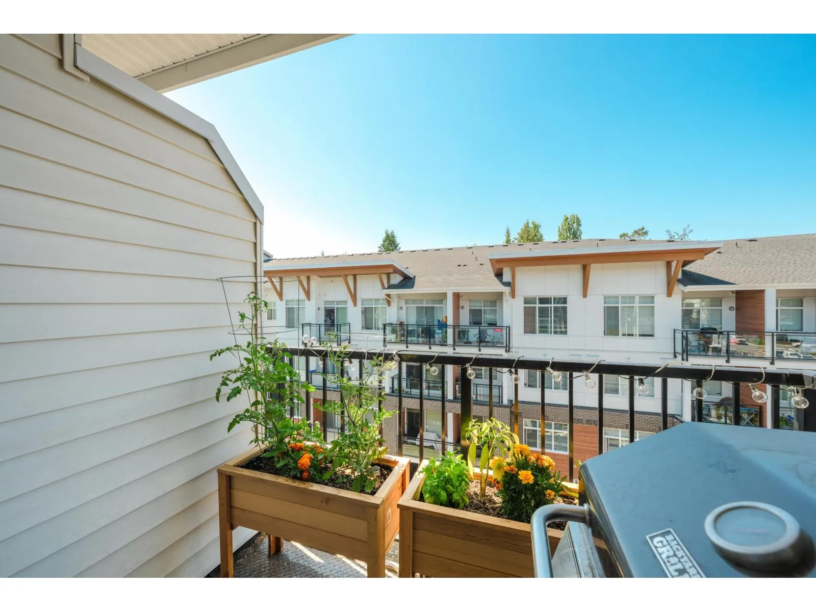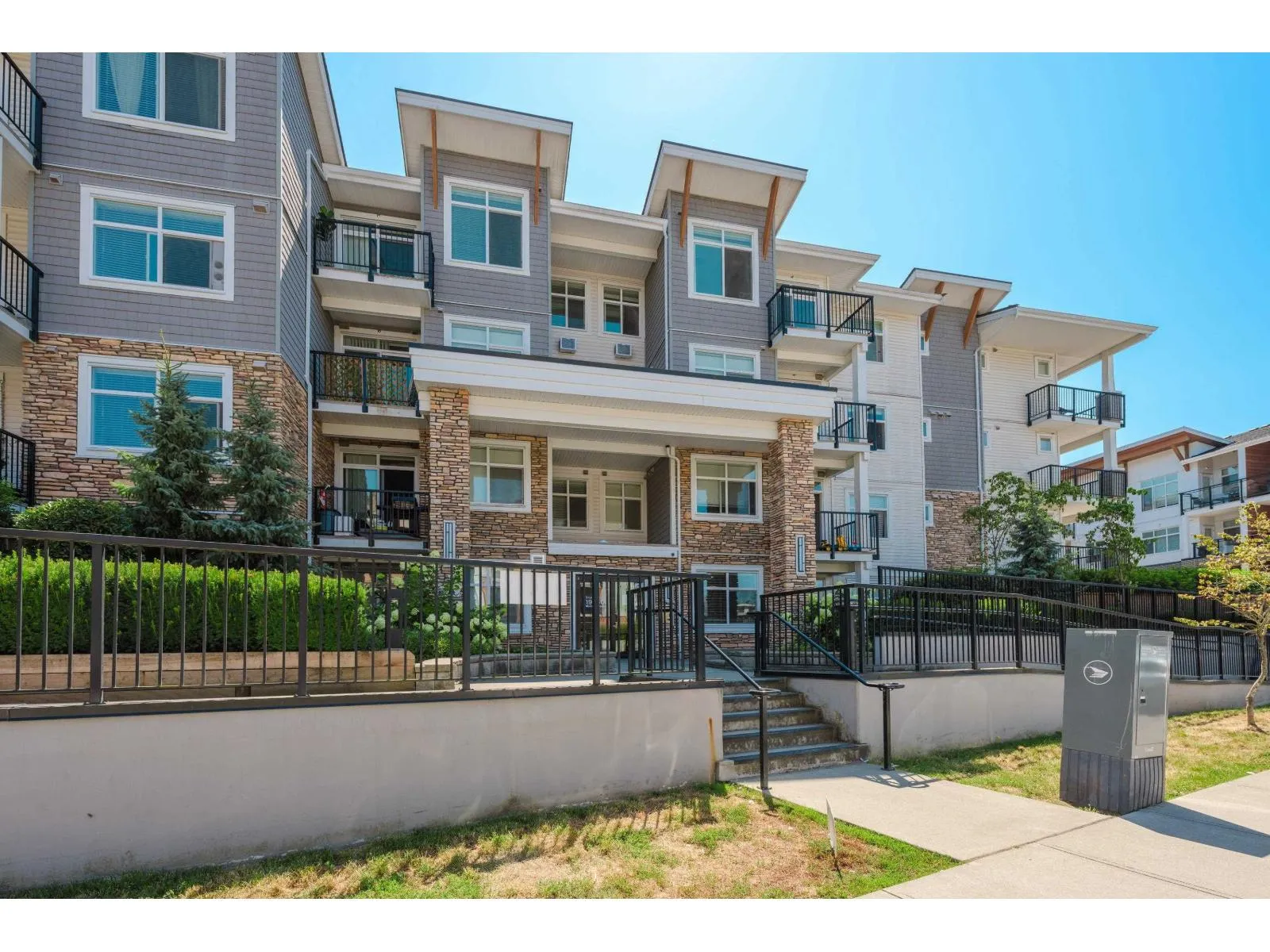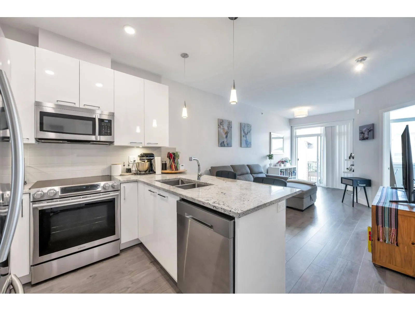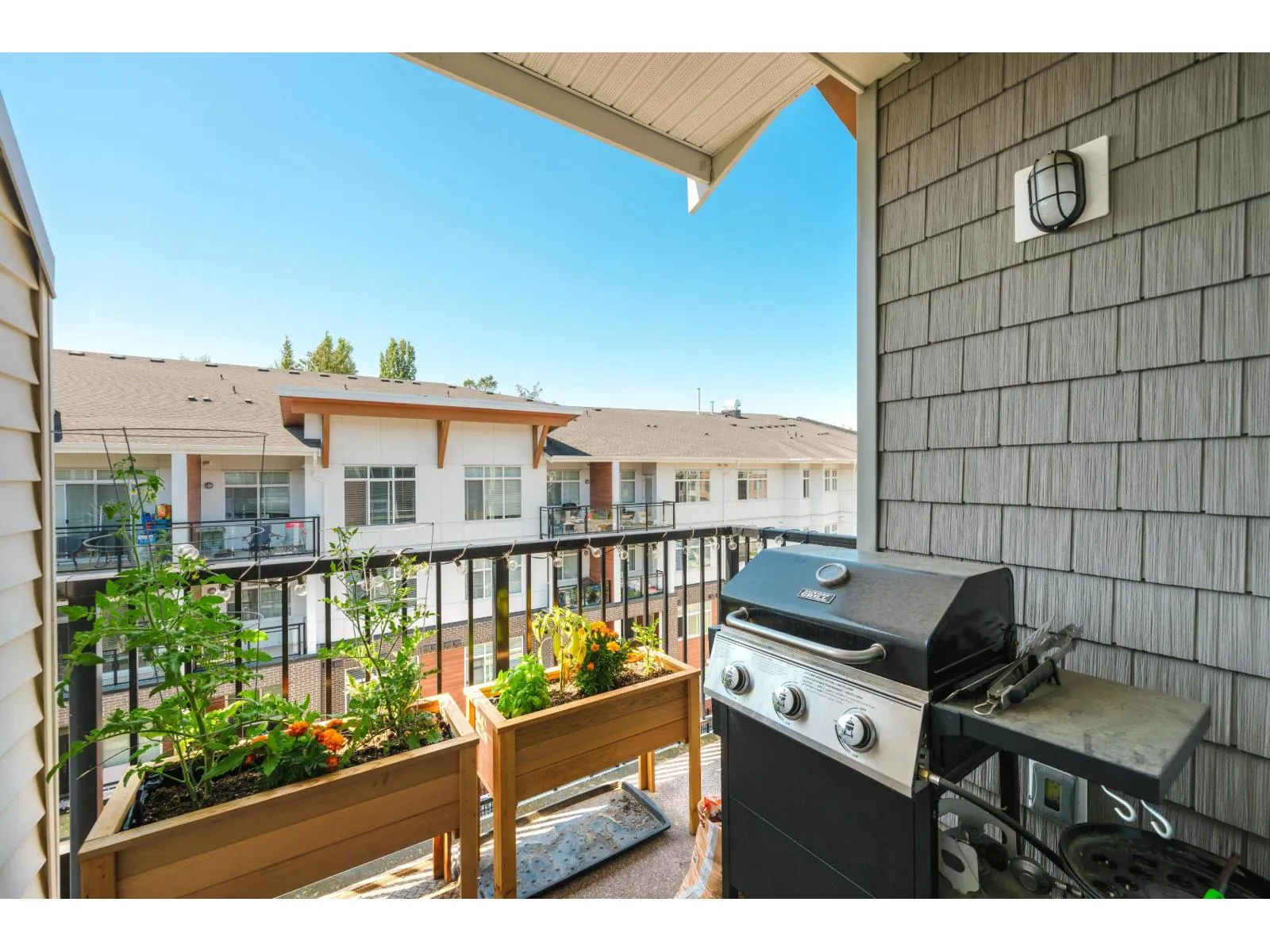 Brydon Green. Spacious 2 bedroom 2 bath top floor bright unit with oversized windows and 9' ceilings. Kitchen has Samsung S/S appliances incl microwave, European white lacquer cabinets, breakfast bar with granite countertops. Spacious primary bedroom with A/C. Ensuite has twin sinks & large walk-in shower. Large storage area and w/d. Centrally located and minutes away to schools, parks, Willowbrook Mall and transit plus future skytrain station, Great walking nature trails! The High quality laminate floors throughout. 2 pets allowed. 5 years remaining on building warranty. Low strata fees of $304.00. 1 parking (additional available). Top floor condo is vacant and ready for occupancy. (id:27476)