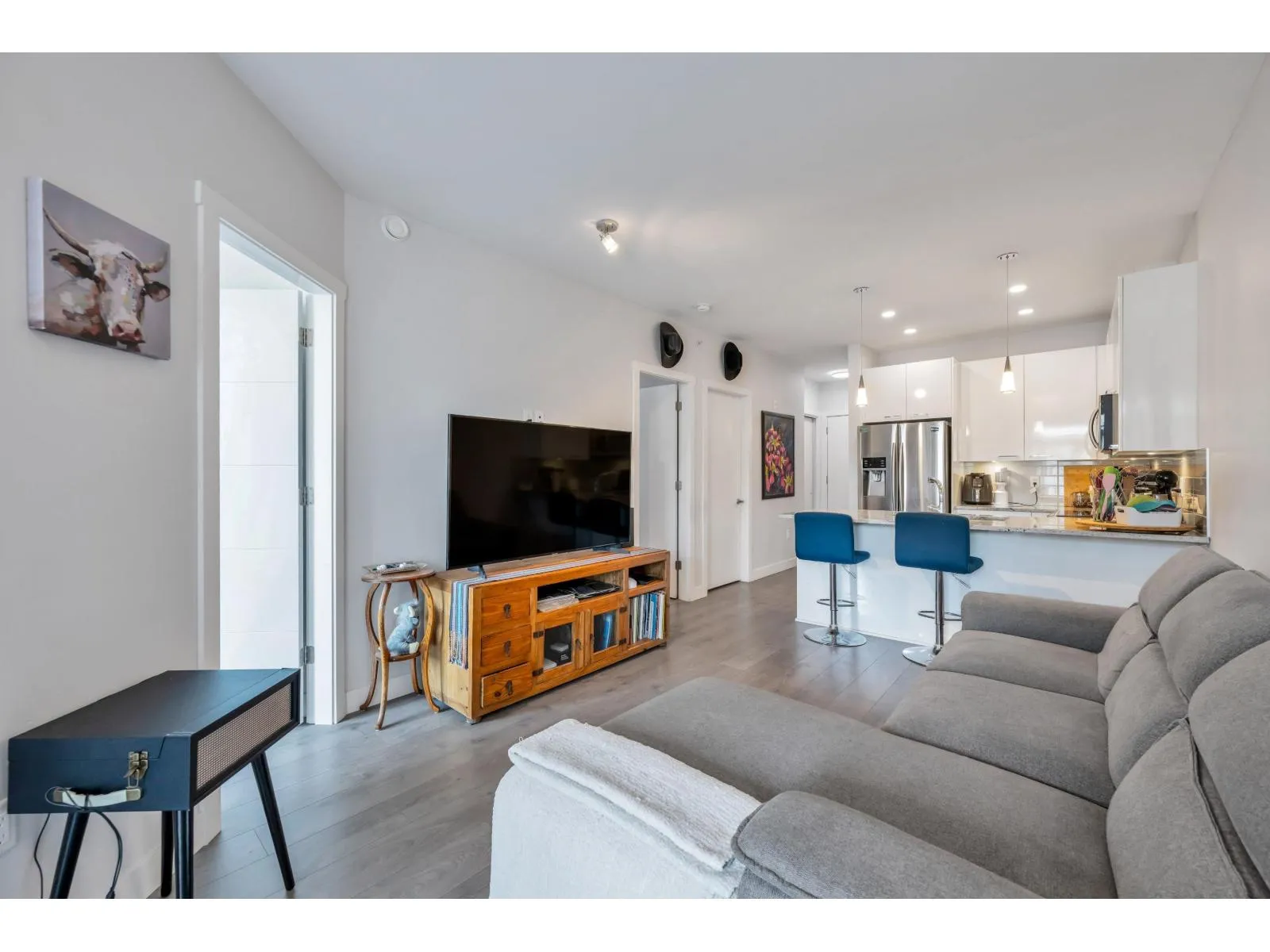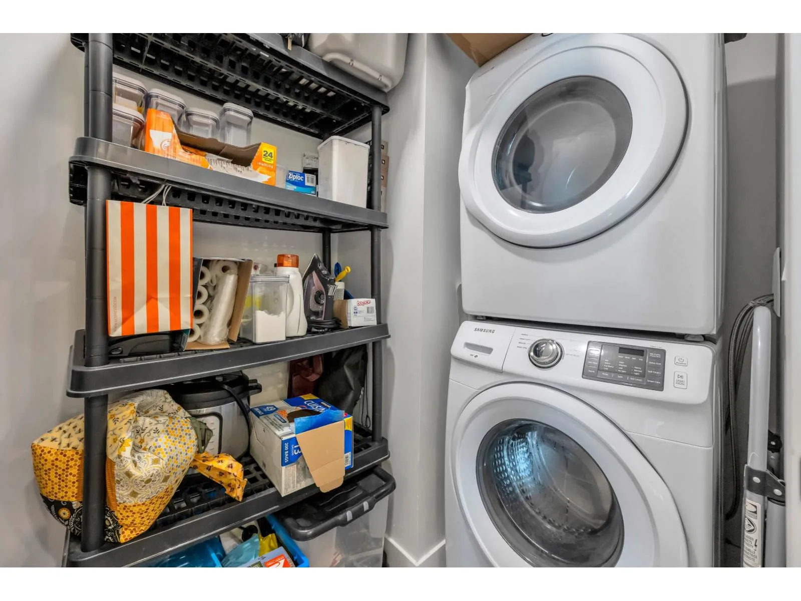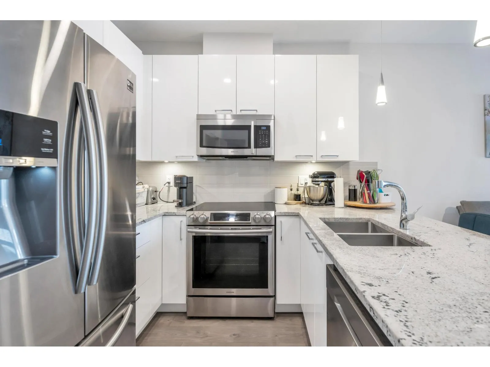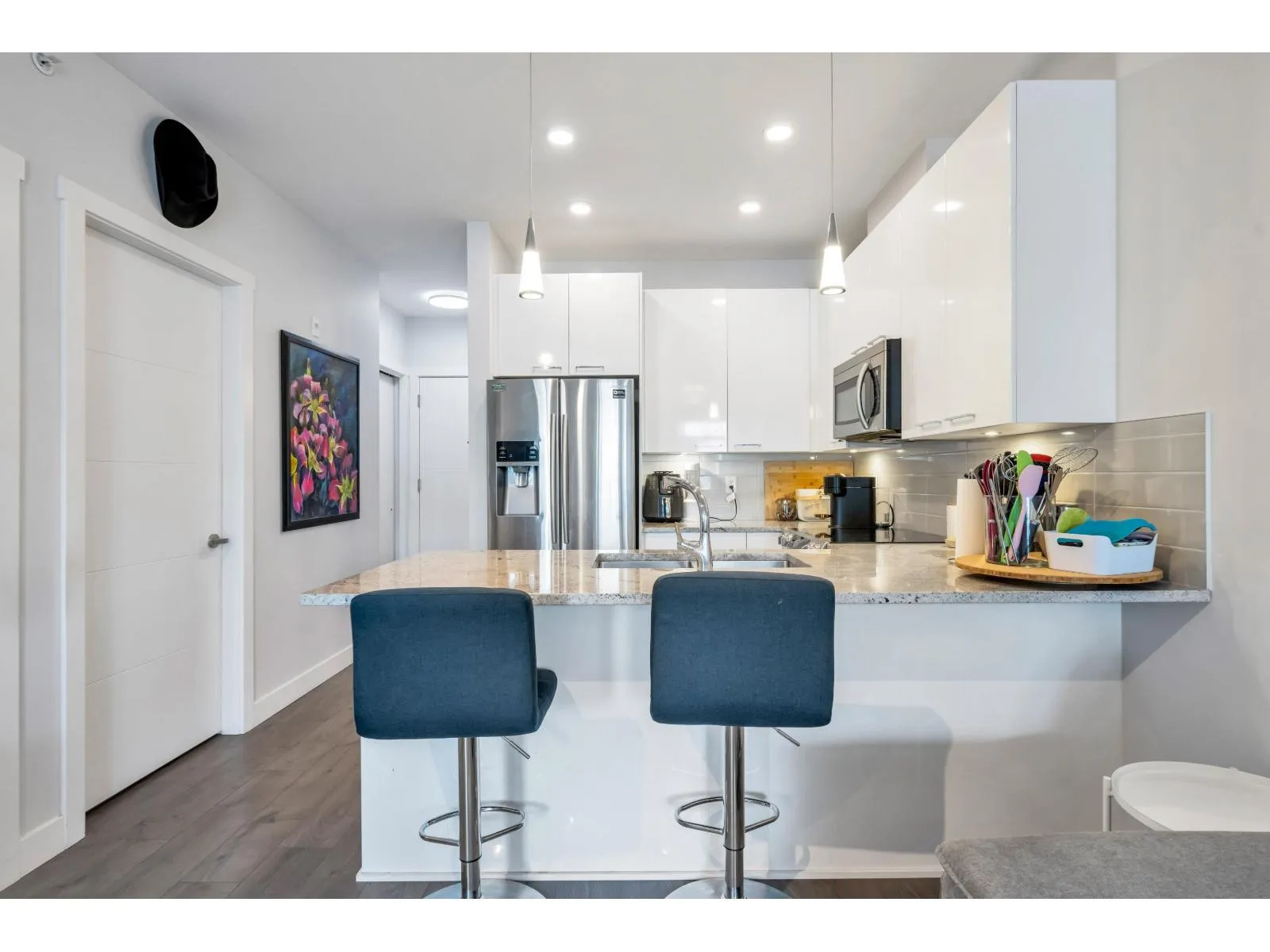 Brydon Green. Spacious 2 bedroom 2 bath top floor bright unit with oversized windows and 9' ceilings. Kitchen has Samsung S/S appliances incl microwave, European white lacquer cabinets, breakfast bar with granite countertops. Spacious primary bedroom with A/C. Ensuite has twin sinks & large walk-in shower. Large storage area and w/d. Centrally located and minutes away to schools, parks, Willowbrook Mall and transit plus future skytrain station, Great walking nature trails! The High quality laminate floors throughout. 2 pets allowed. 5 years remaining on building warranty. Low strata fees of $304.00. 1 parking (additional available). Top floor condo is vacant and ready for occupancy. (id:27476)