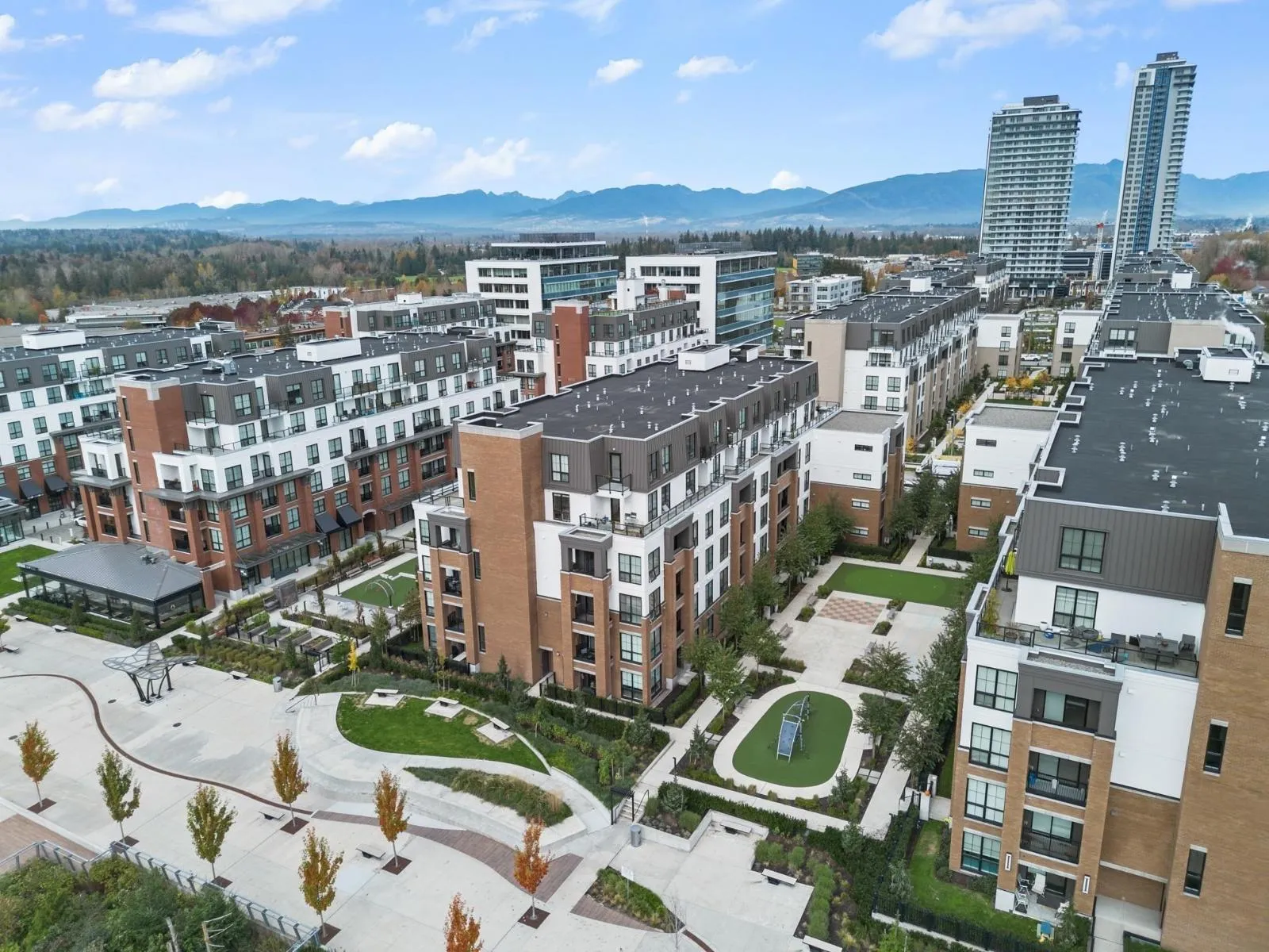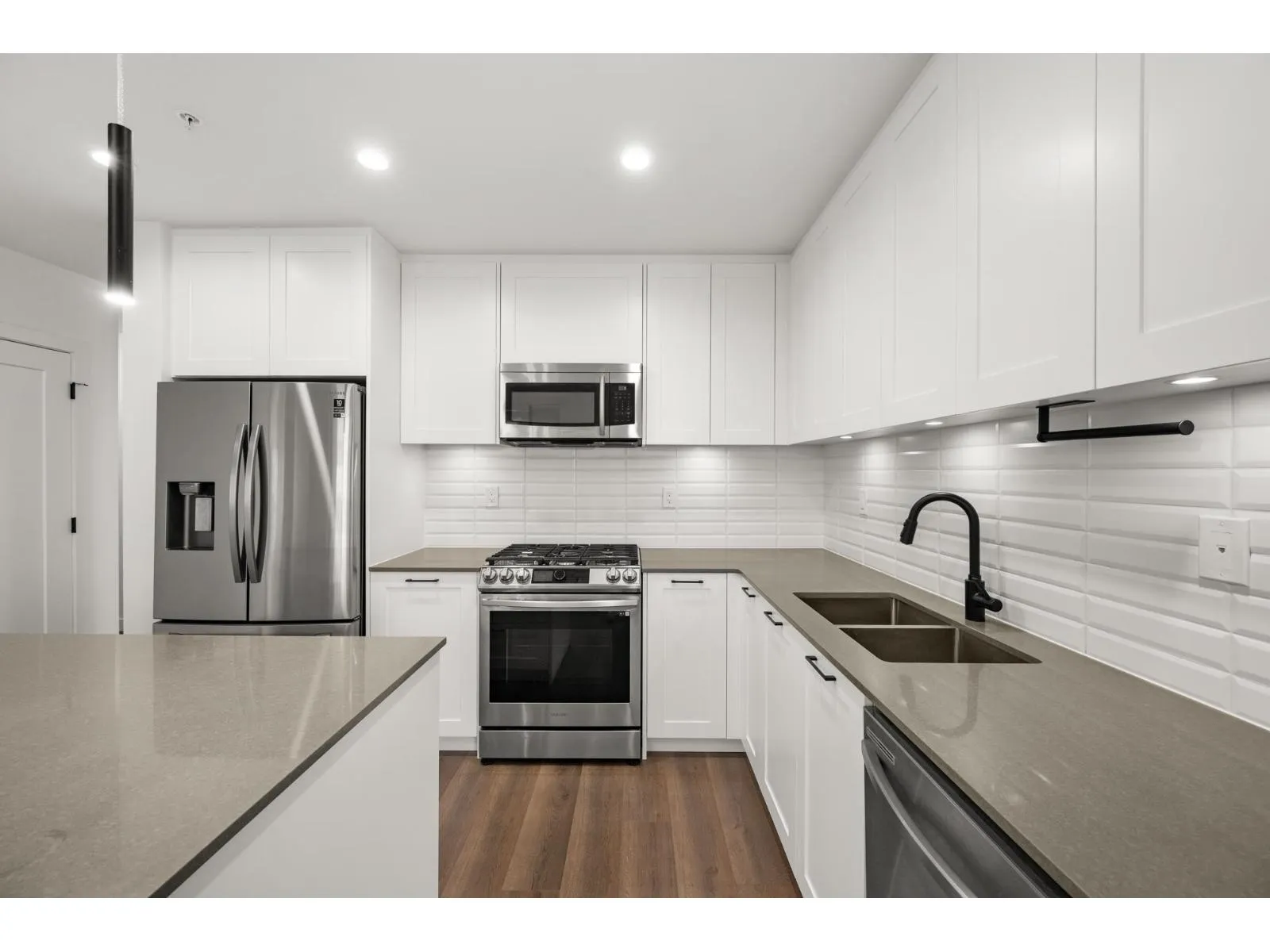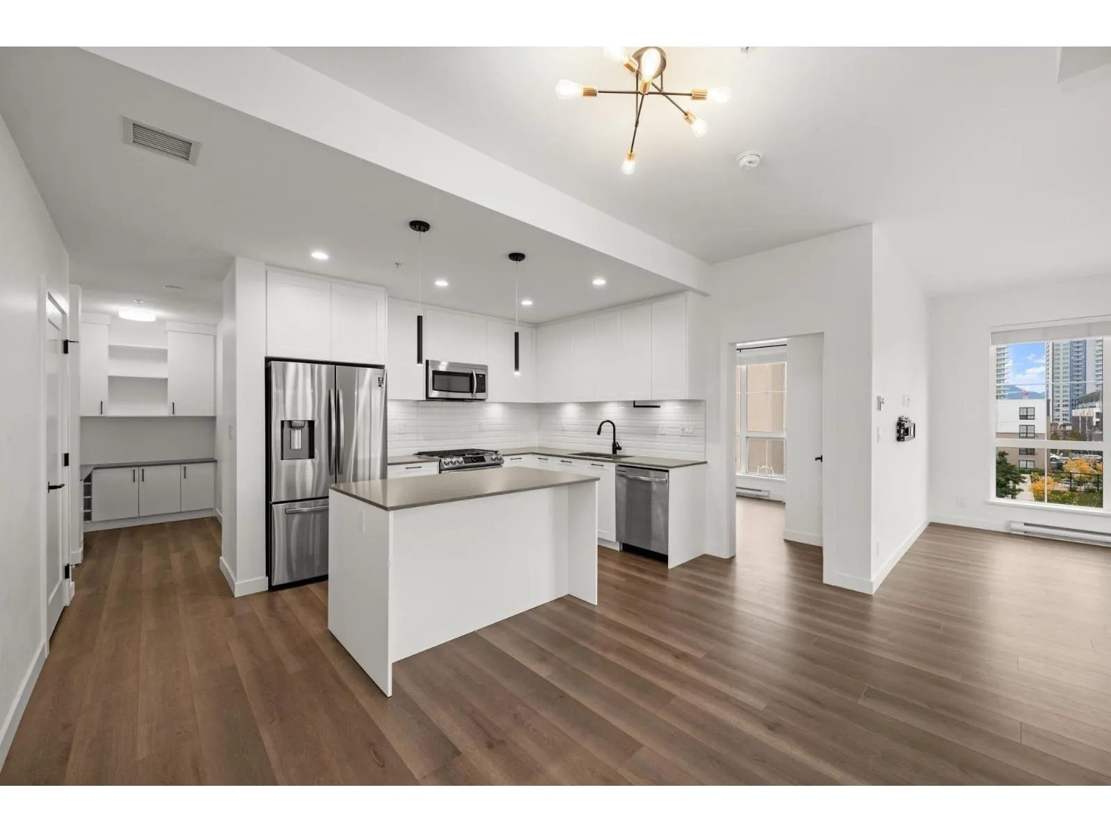 Welcome to this stunning 3-bedroom + den, 2-bath penthouse in the heart of Latimer Village. Offering approximately 1,300 sq ft of well-designed living space, this NE-facing corner home by award-winning Vesta Properties is filled with natural light and features 9' height ceilings throughout. The modern kitchen is designed for both everyday living and entertaining, complete with stainless steel appliances, gas stove, quartz countertops, and an oversized island. Durable laminate flooring runs throughout the home, while the den has been professionally customized into a functional home office. Close to Willowbrook Shopping Centre, Costco, Highway 1, parks, and schools. A rare penthouse opportunity offering space, comfort, and lifestyle in one of Langley's most desirable neighborhoods. (id:27476)