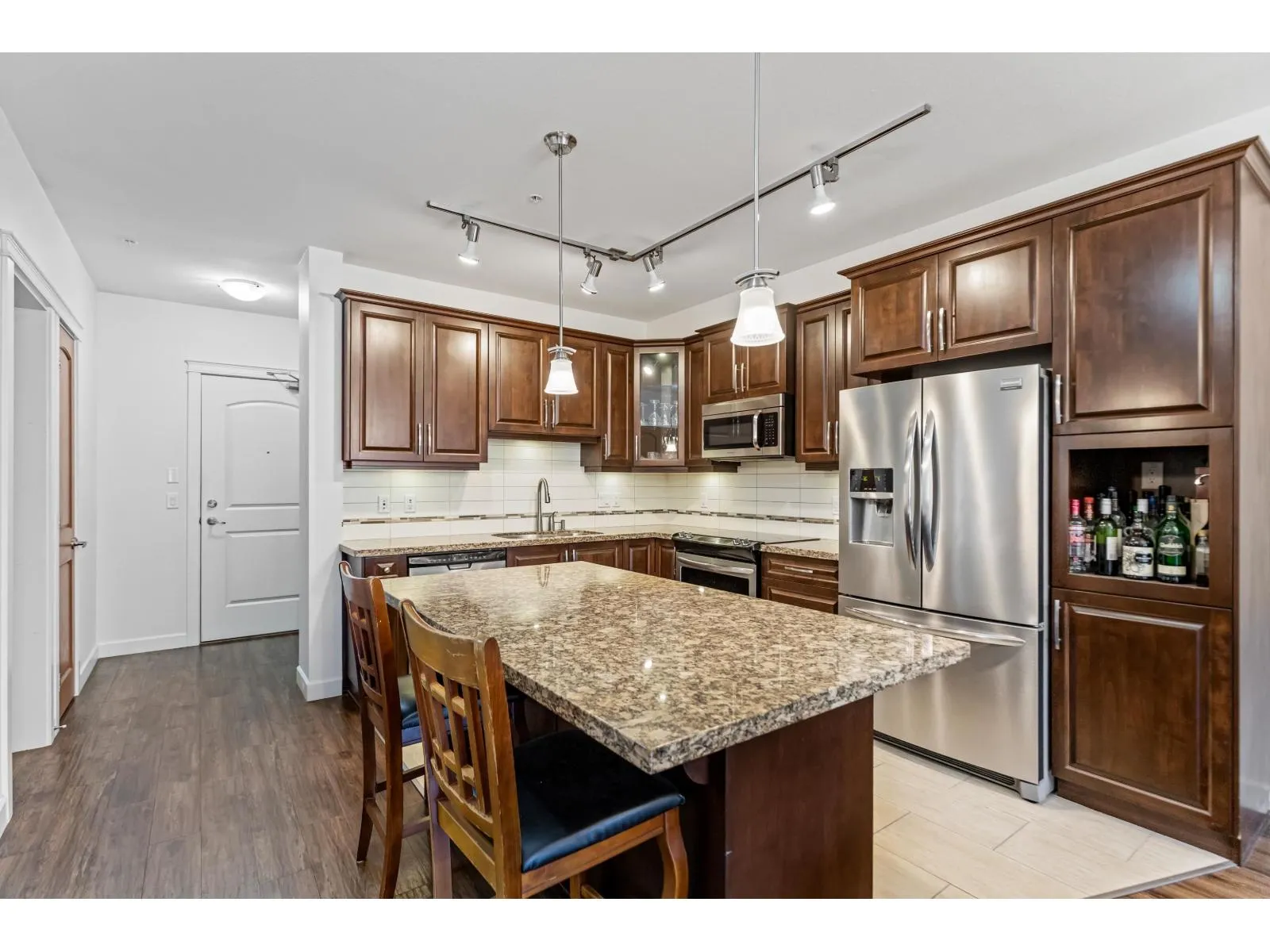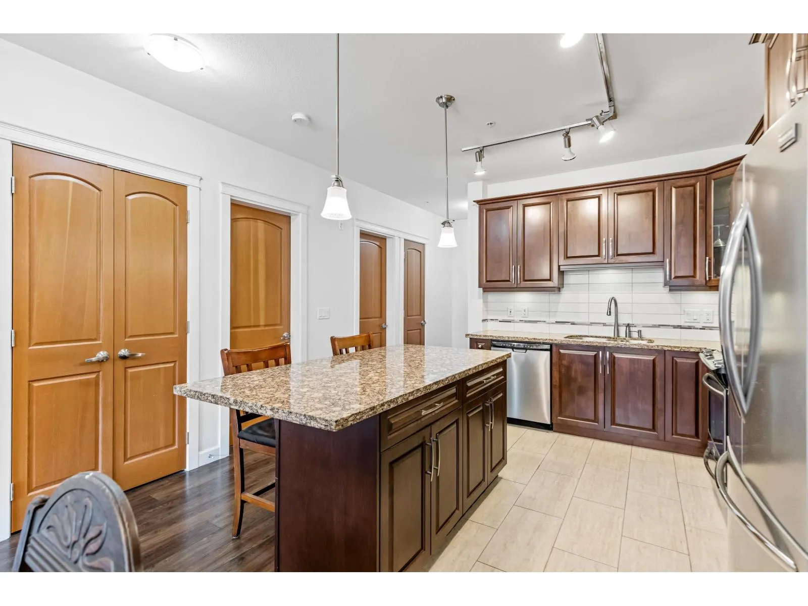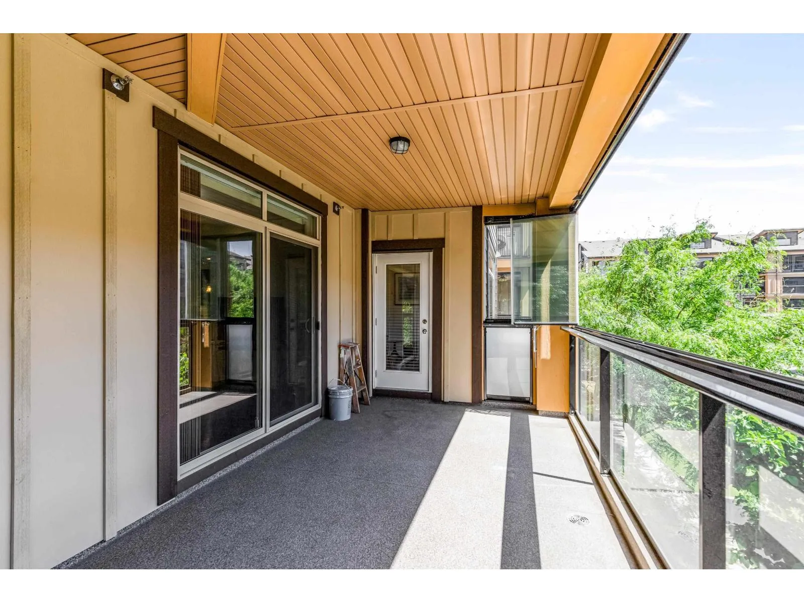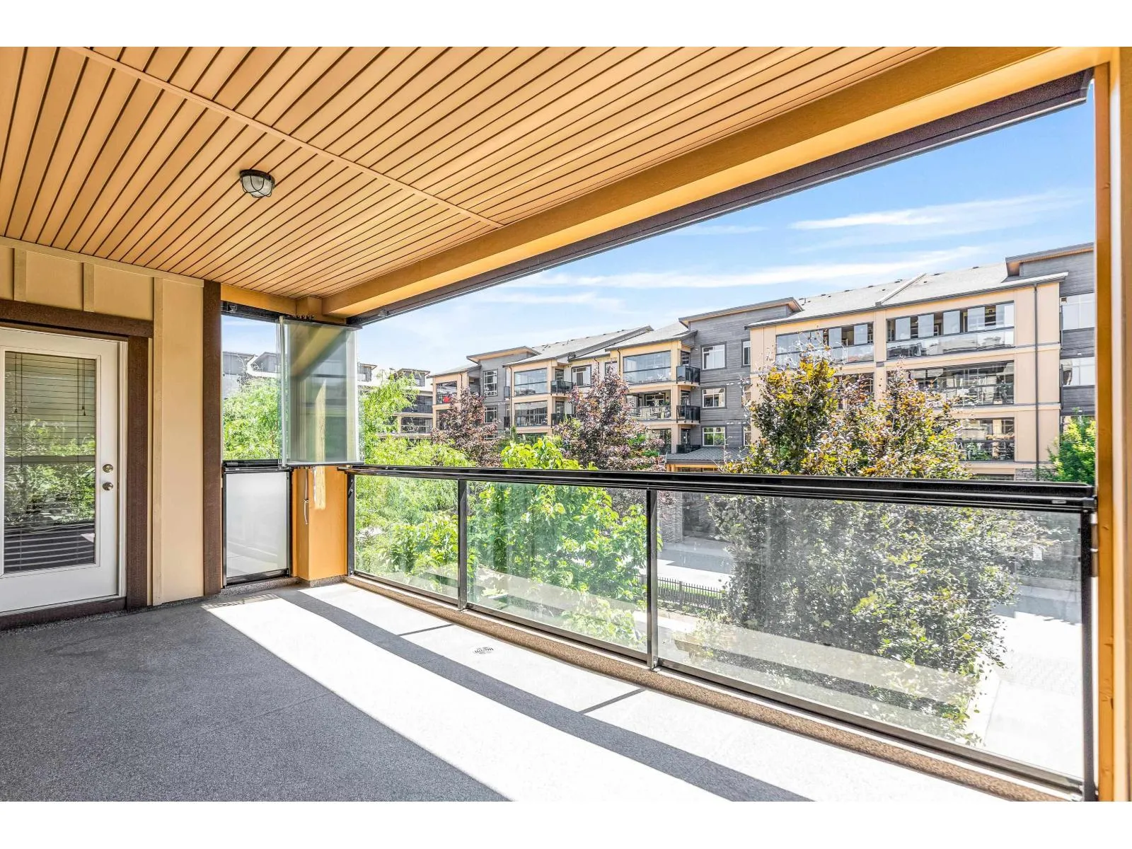 Stunning 2 bed, 2 bath + den (or 3rd bed) corner unit in sought after Walnut Ridge at Yorkson by Quadra Homes. This 1,035FT home features a spacious open layout w/ bedrooms on opposite sides of living for added privacy. Enjoy year round use of the 224FT covered, south facing, wrap around balcony, w/retractable glass, overlooking peaceful courtyard. Chef's kitchen boasts s/s appliances, granite countertops, quality cabinetry & large island. Primary suite inc/walk-in closet & spa like ensuite with large shower. Freshly painted with luxury touches like A/C, heated bathroom floors & anti-fog mirrors. Includes 2 parking stalls & oversized storage w/ electrical outlet & roll-up door. In the heart of Willoughby Heights close to schools, parks, transit, restaurants, shopping & Hwy1 access. (id:27476)