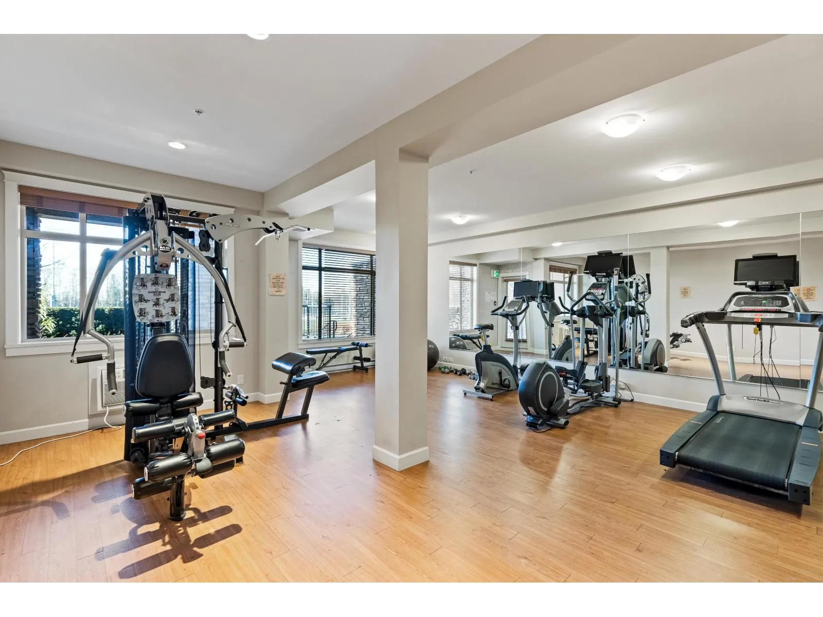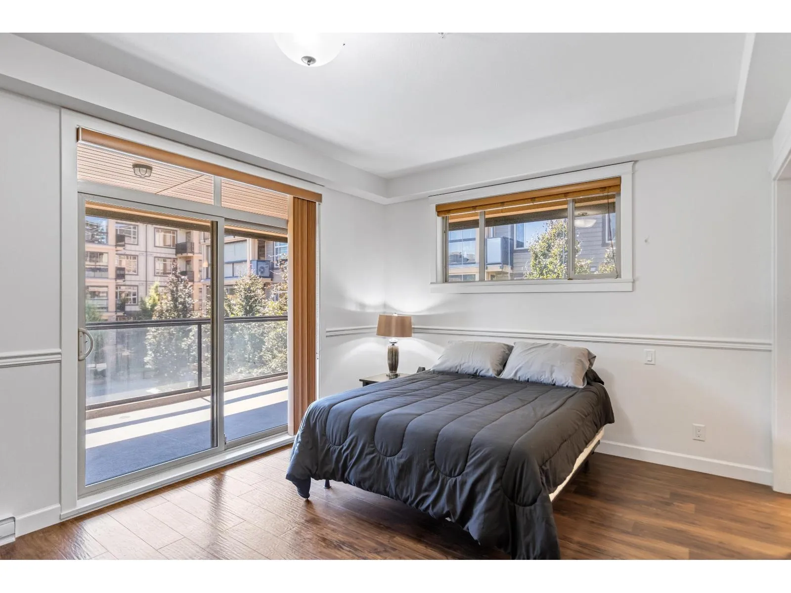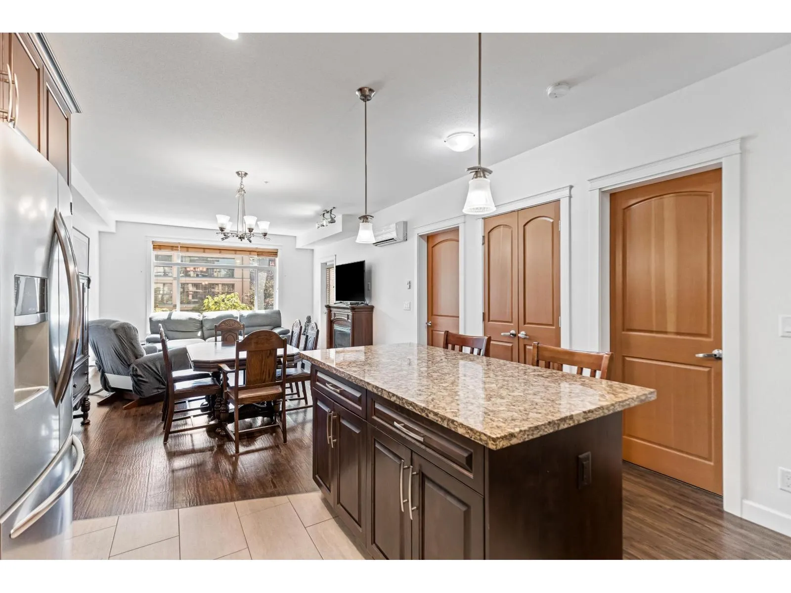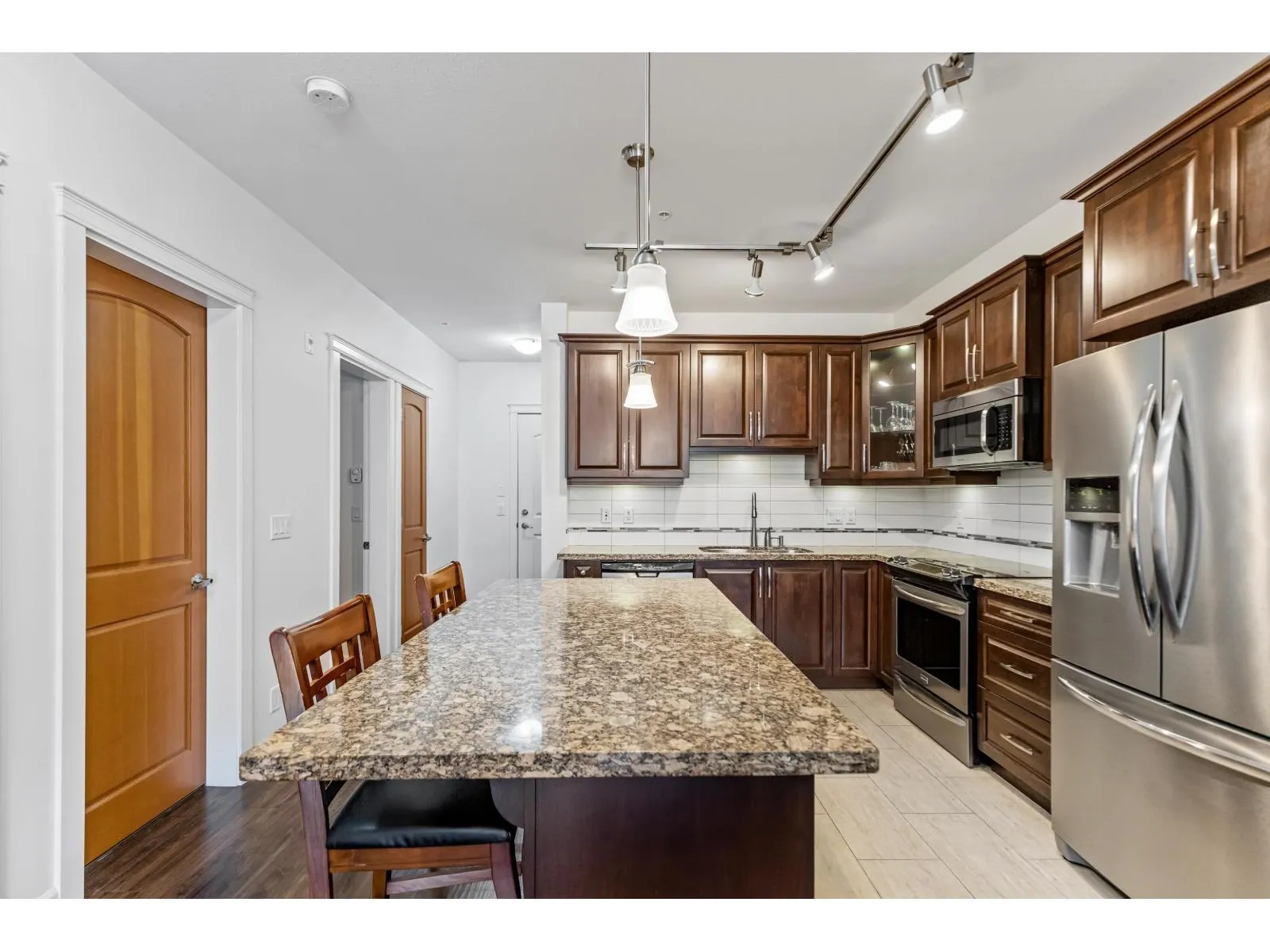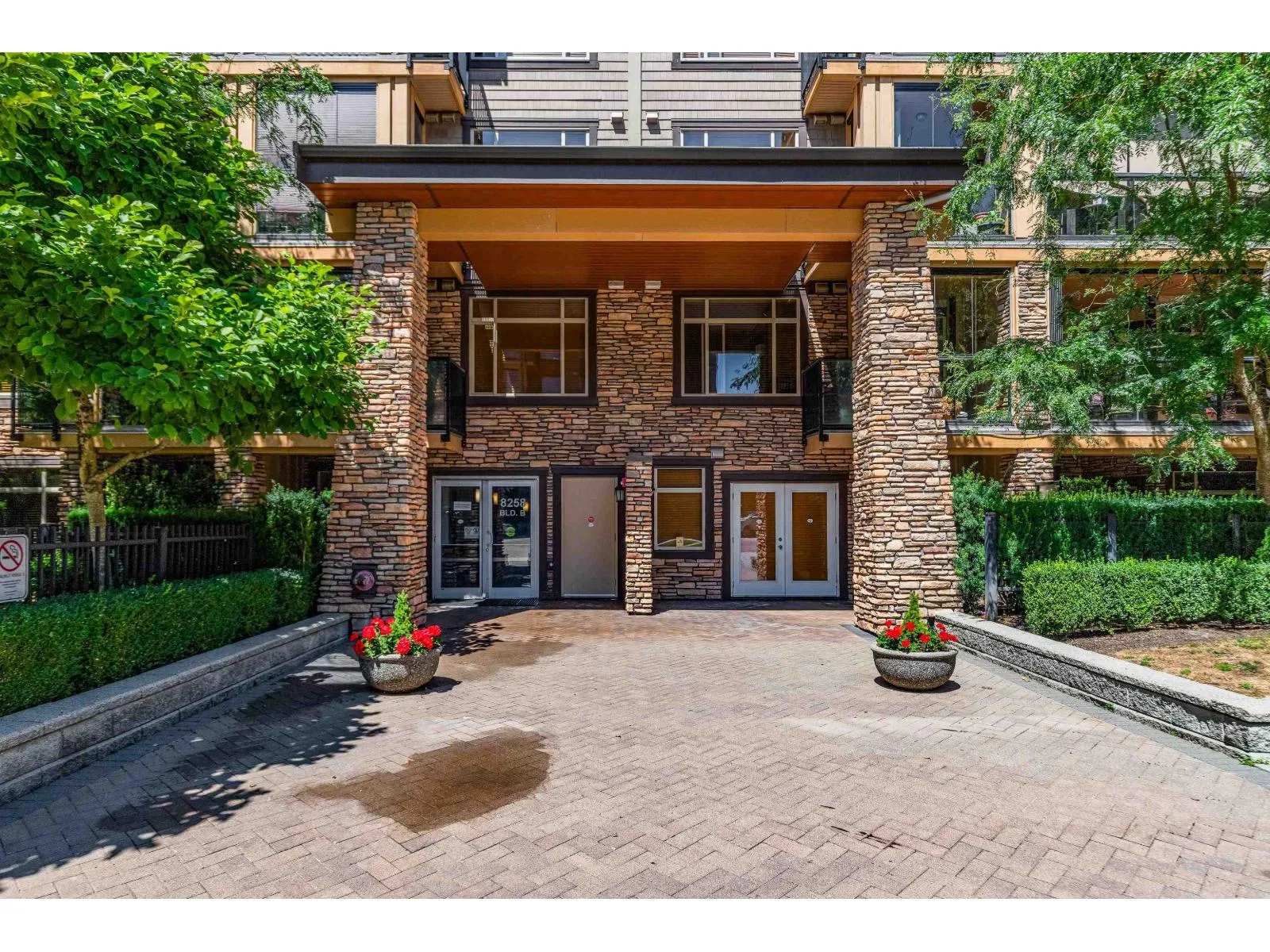 Stunning 2 bed, 2 bath + den (or 3rd bed) corner unit in sought after Walnut Ridge at Yorkson by Quadra Homes. This 1,035FT home features a spacious open layout w/ bedrooms on opposite sides of living for added privacy. Enjoy year round use of the 224FT covered, south facing, wrap around balcony, w/retractable glass, overlooking peaceful courtyard. Chef's kitchen boasts s/s appliances, granite countertops, quality cabinetry & large island. Primary suite inc/walk-in closet & spa like ensuite with large shower. Freshly painted with luxury touches like A/C, heated bathroom floors & anti-fog mirrors. Includes 2 parking stalls & oversized storage w/ electrical outlet & roll-up door. In the heart of Willoughby Heights close to schools, parks, transit, restaurants, shopping & Hwy1 access. (id:27476)