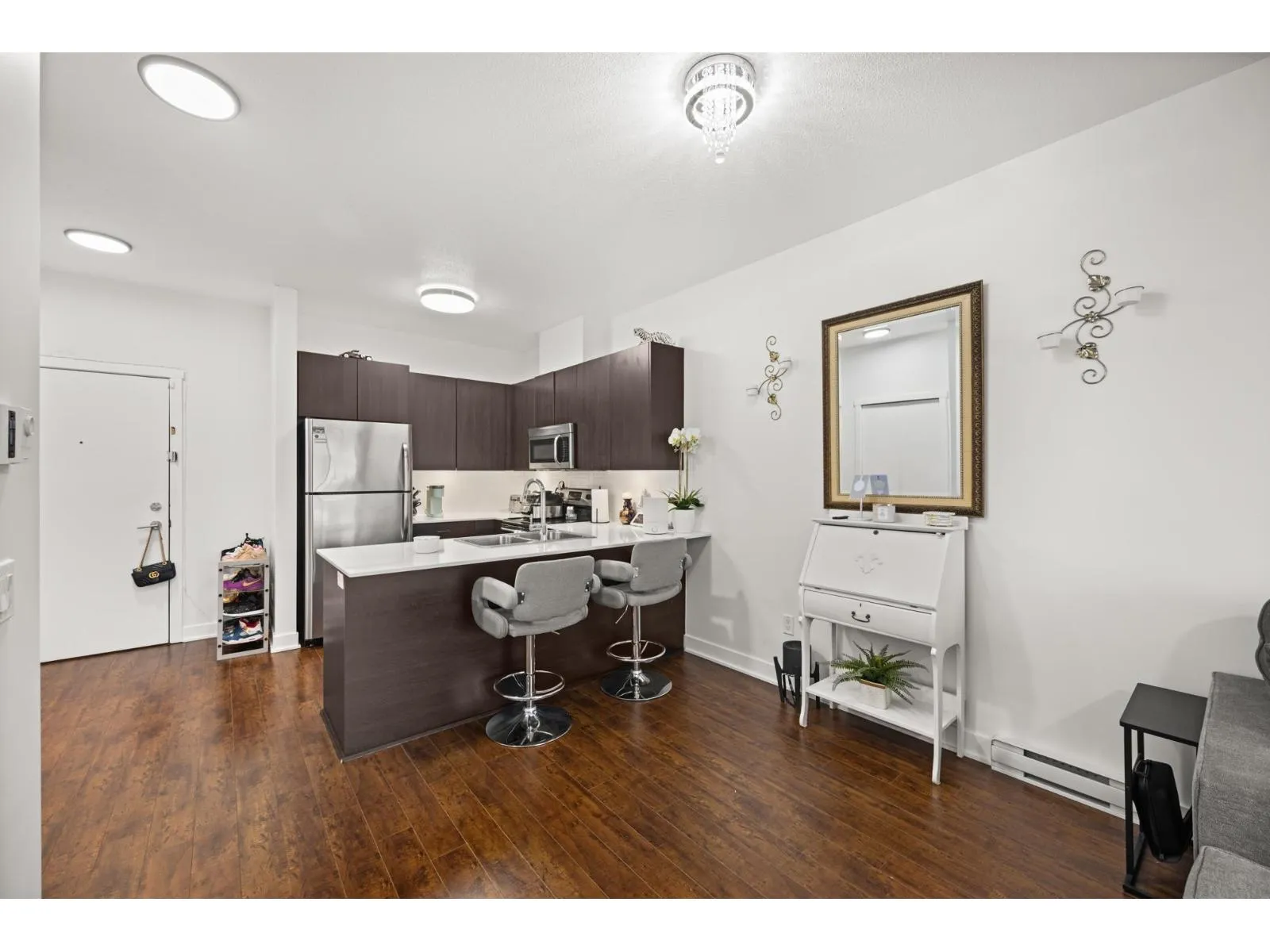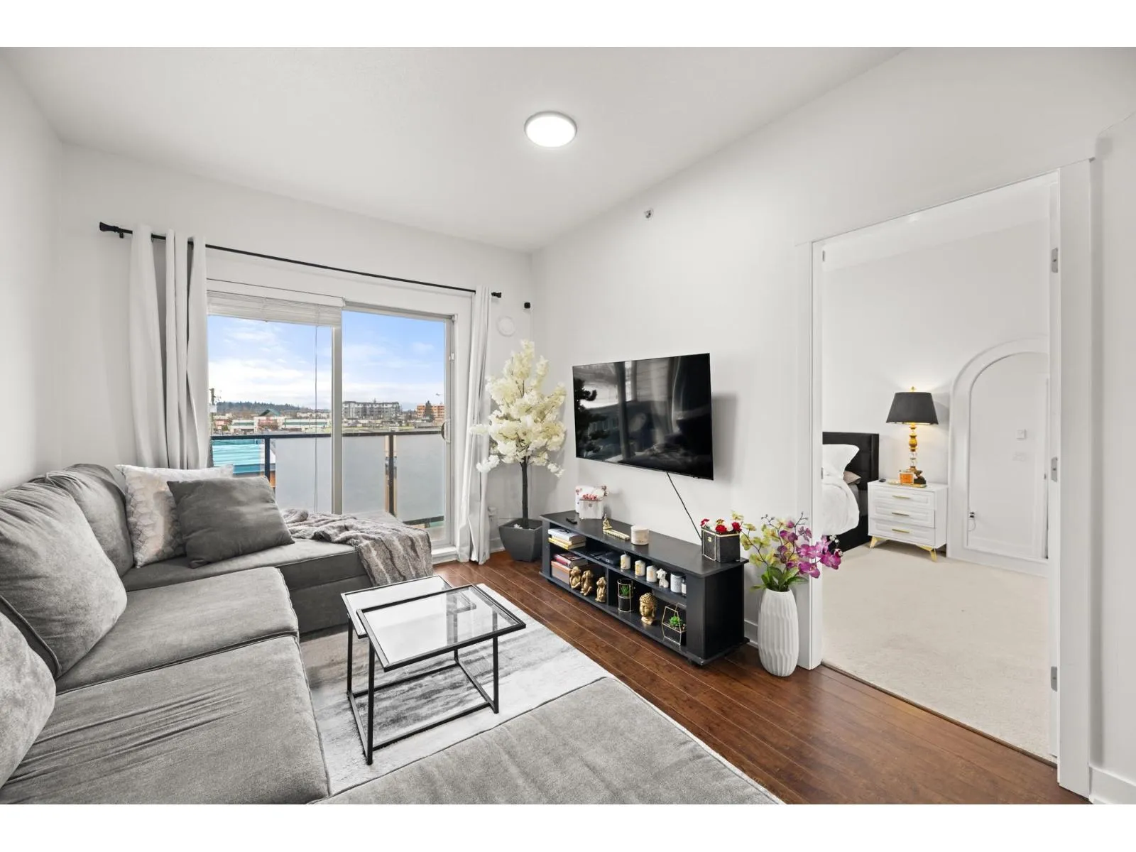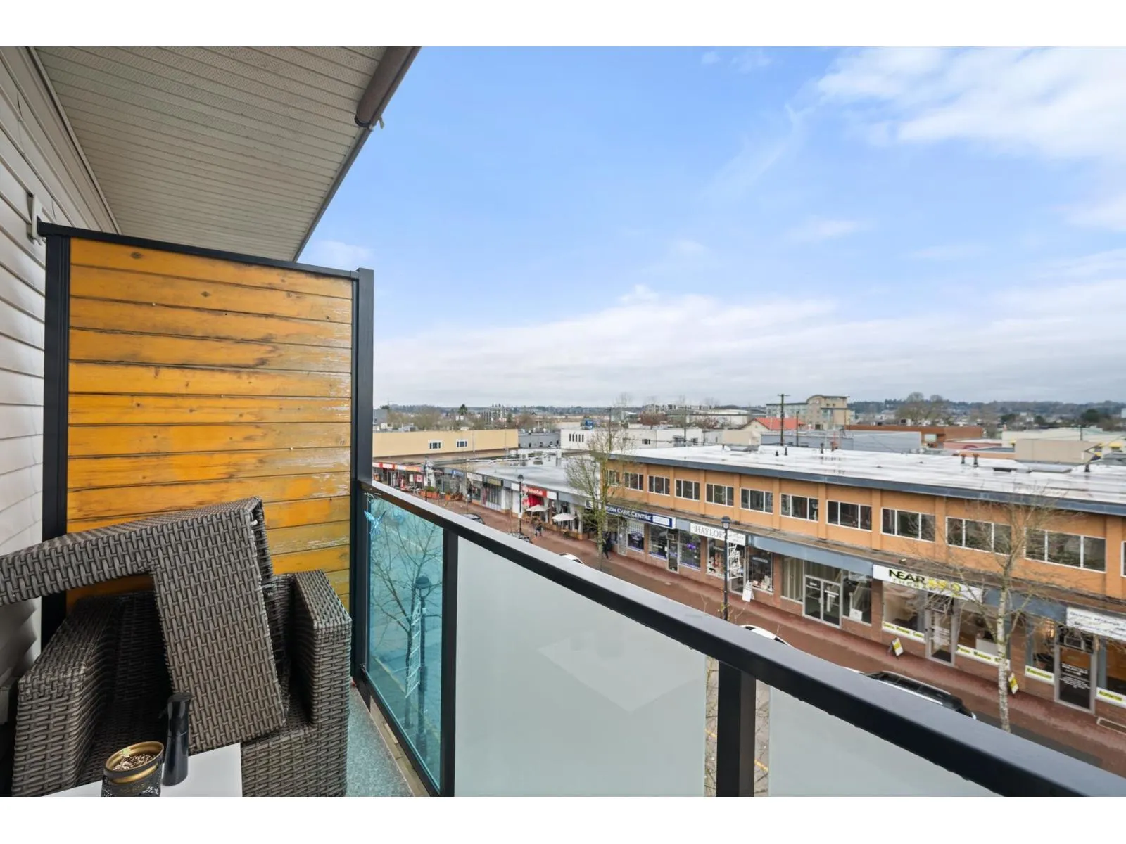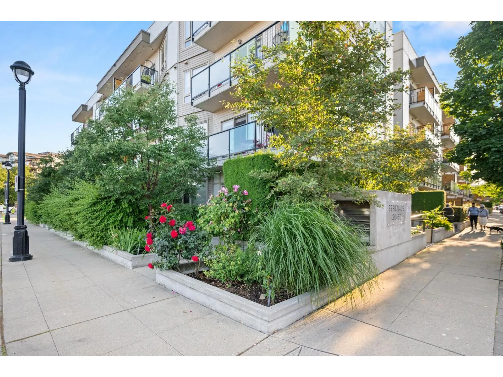 Welcome to Serenade - where downtown Langley living meets effortless style. This beautifully updated top-floor 1 bedroom, 1 bathroom home is filled with natural light and offers an open-concept layout perfect for modern living. The gourmet kitchen features quartz countertops, stainless steel appliances, and sleek laminate flooring, with cozy carpet in the bedroom for added comfort. Step out onto your generous balcony with city views - ideal for morning coffee or evening unwinding. Serenade offers a fitness centre and a clubhouse with full kitchen and patio, all set beside Douglas Park and just steps to shops, cafés, restaurants, transit, and everything downtown Langley has to offer. (id:27476)