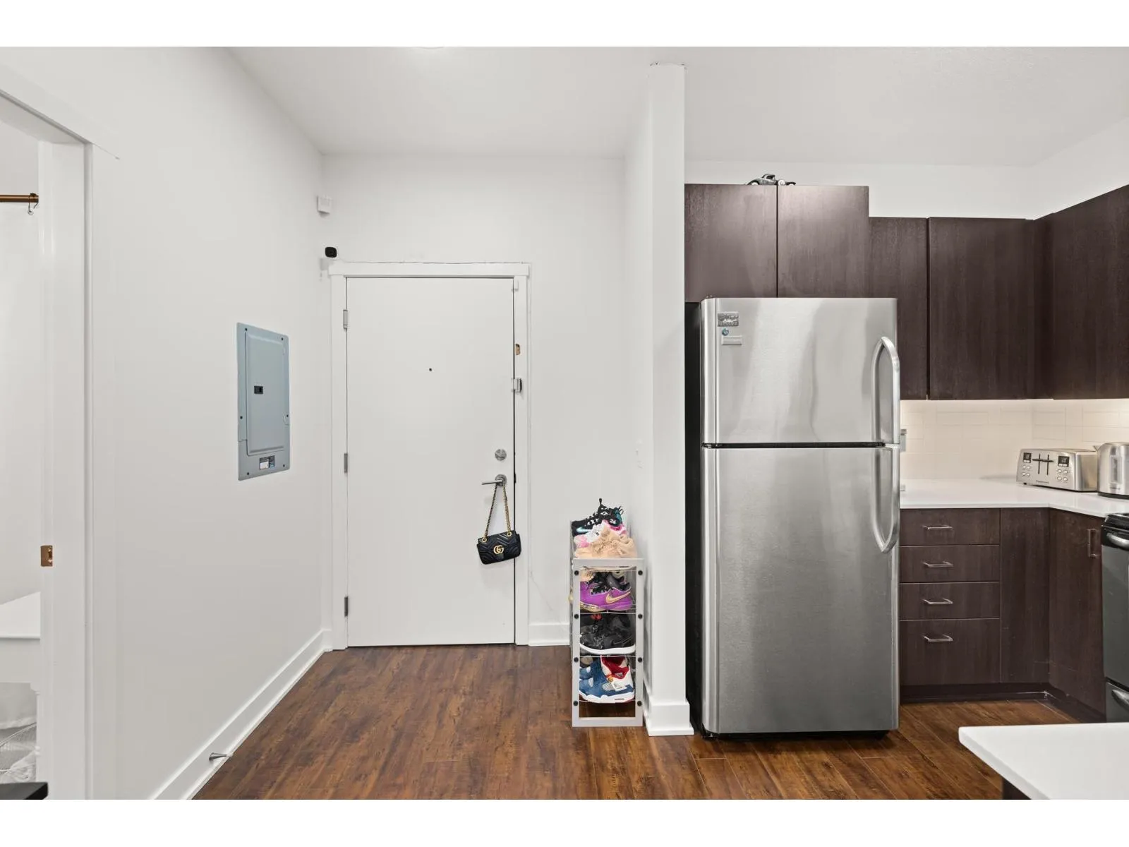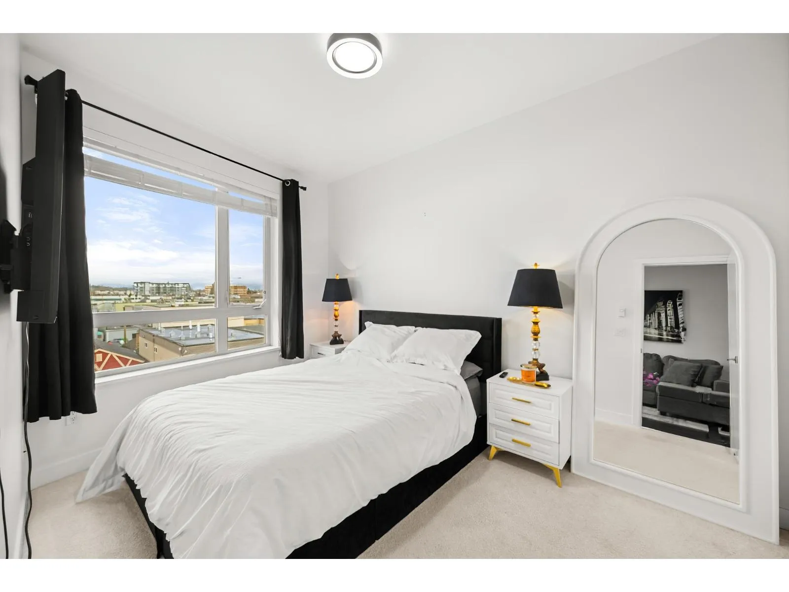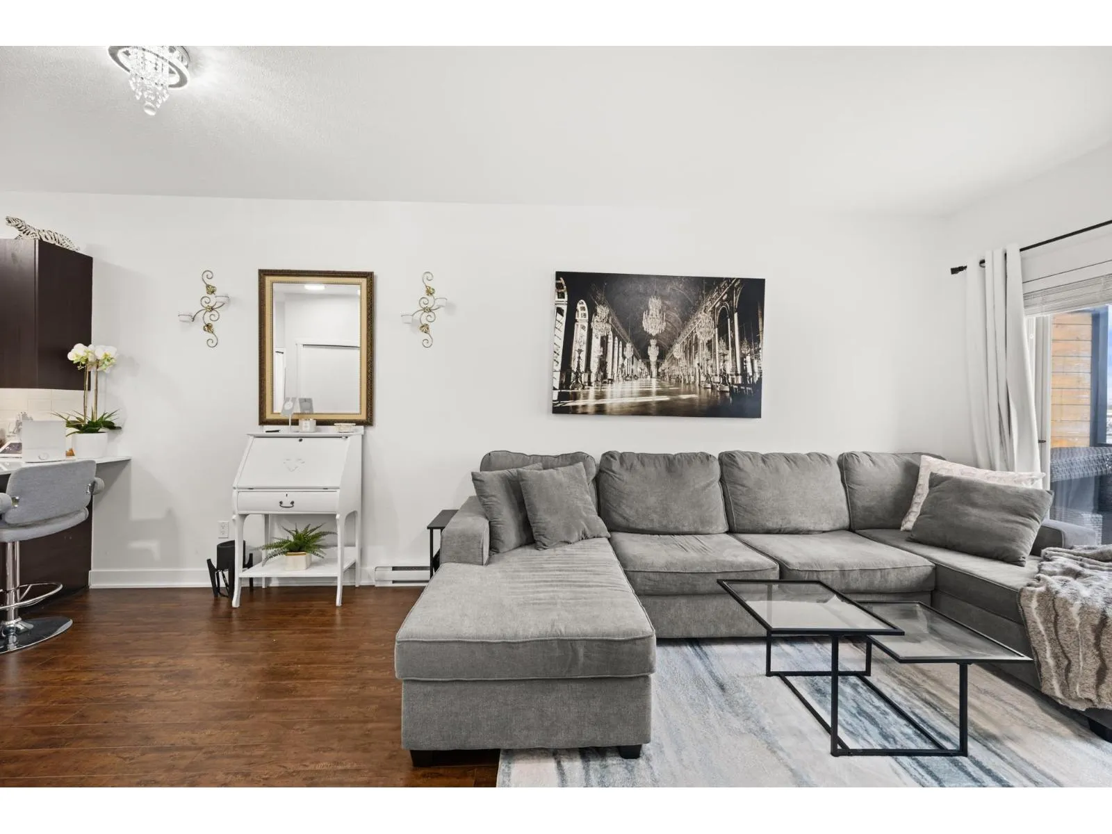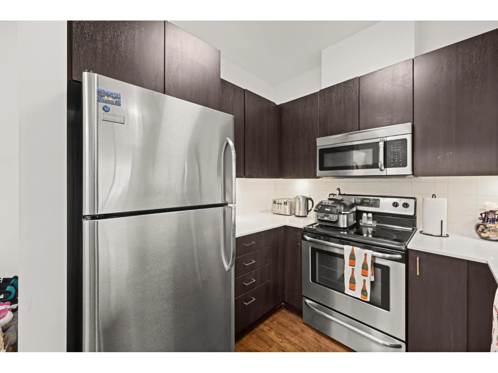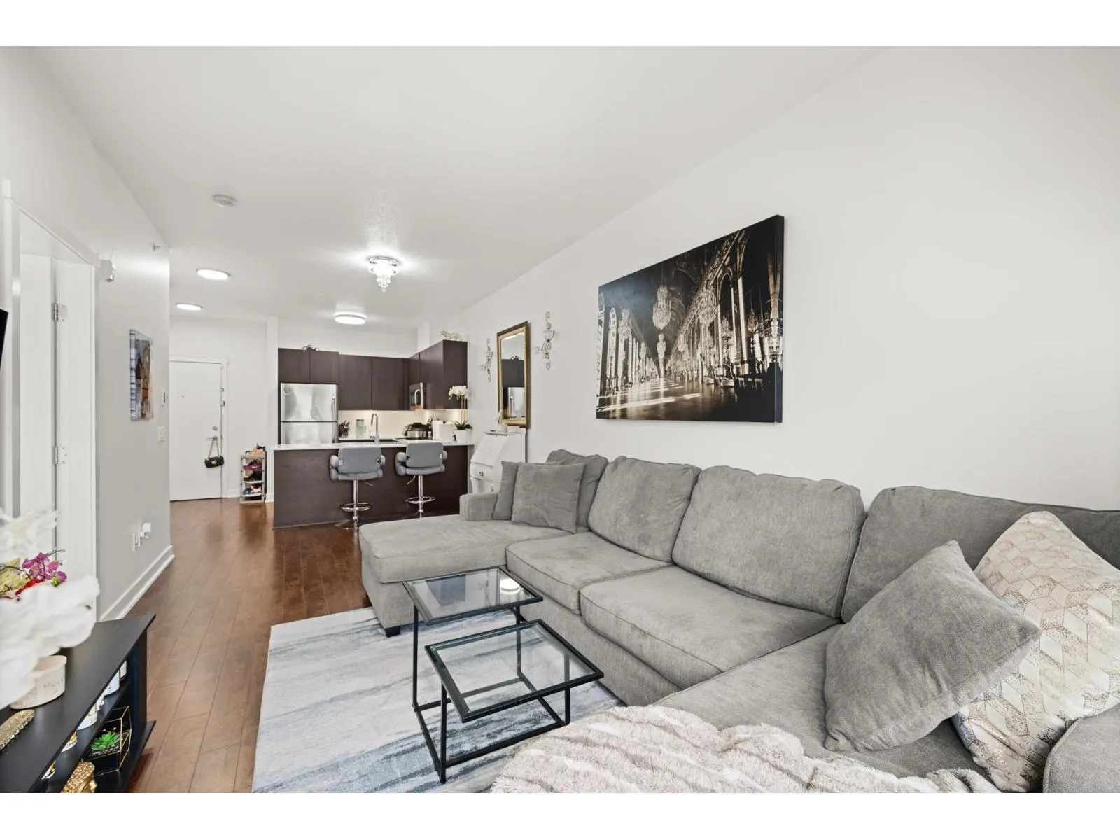 Welcome to Serenade - where downtown Langley living meets effortless style. This beautifully updated top-floor 1 bedroom, 1 bathroom home is filled with natural light and offers an open-concept layout perfect for modern living. The gourmet kitchen features quartz countertops, stainless steel appliances, and sleek laminate flooring, with cozy carpet in the bedroom for added comfort. Step out onto your generous balcony with city views - ideal for morning coffee or evening unwinding. Serenade offers a fitness centre and a clubhouse with full kitchen and patio, all set beside Douglas Park and just steps to shops, cafés, restaurants, transit, and everything downtown Langley has to offer. (id:27476)