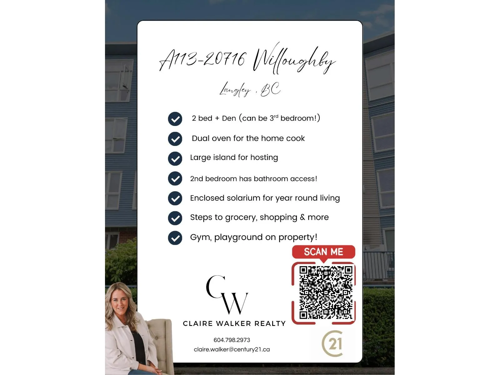 Location, location, location! Experience luxury living at Yorkson Downs in the heart of Willoughby Heights! This 2-bedroom + DEN, 2-bath condo offers a trendy layout, with the den spacious enough to serve as a 3rd bedroom. Perfectly situated just steps from shopping, cafes and more - with effortless access to Hwy 1. High-end finishes includes ss appliances, quartz countertops, dual oven, A/C, and a spacious laundry room. Enjoy 2 side-by-side underground parking stalls with TWO private roll-up storage rooms--one equipped with elec for potential EV charging. The glass-enclosed solarium extends your living space year-round, plus an additional outdoor area is included. Convenient amenities include a gym, playground, and amenities room. All ages/rentals welcome, pets w/ restrictions. Must see! (id:27476)