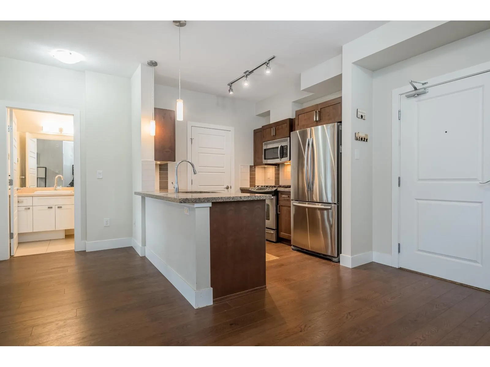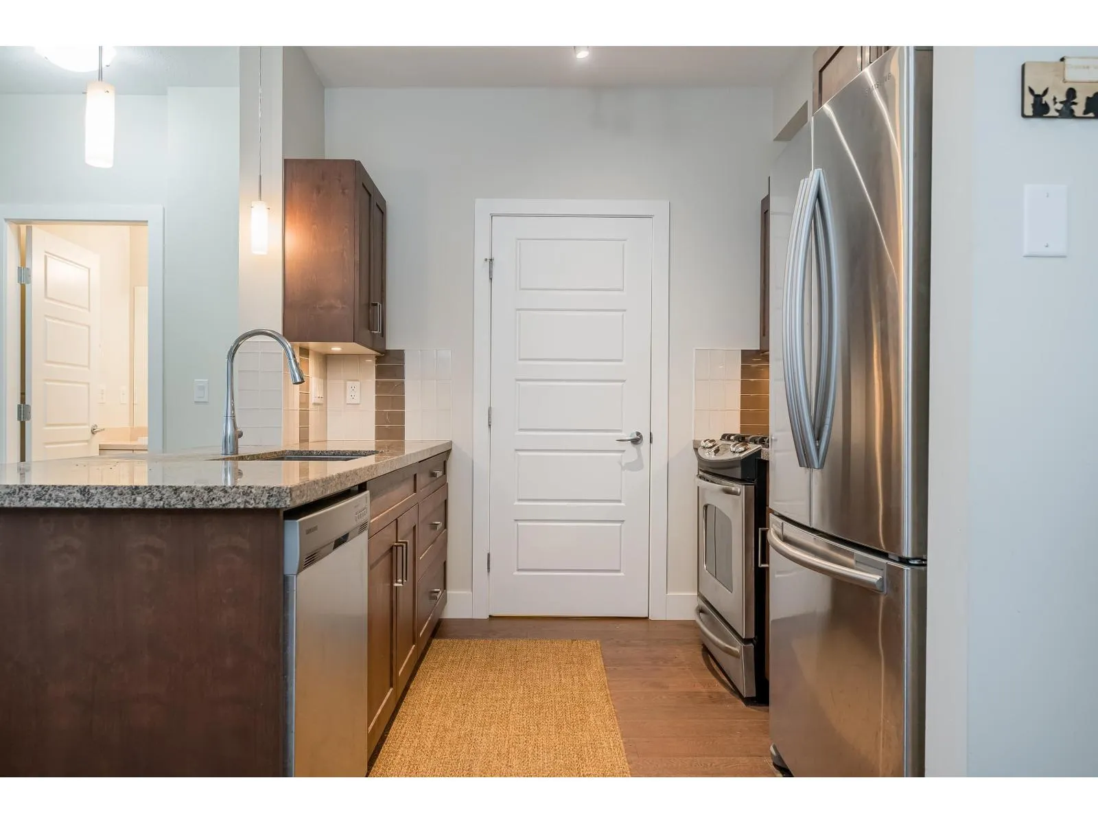 LIKE NEW! Bright & spacious 2-bedroom, 2-bath condo with an ideal split-bedroom layout for privacy-perfect for roommates, guests, or a home office setup. Bedrooms feature closet organizers with built-ins. Primary ensuite offers an oversized walk-in shower & soaker tub in the main bath. Large east-facing windows flood the home with morning light & sliding doors off the living room lead to generous covered deck with gas BBQ hookup (BBQ included)-perfect for year-round use. Well-appointed kitchen showcases granite countertops, stainless steel appliances, a gas range, & pendant lighting the over breakfast bar peninsula, flowing seamlessly into the open-concept living & dining areas. In-suite laundry/storage room. Secure underground parking & bike room. Pet-friendly building with no size restrictions. Incredible location - walk to everything - future SkyTrain, rec centres, nature trails, parks, everyday amenities, transit at your door step -an excellent choice for commuters, investors, or future-focused buyers. (id:27476)