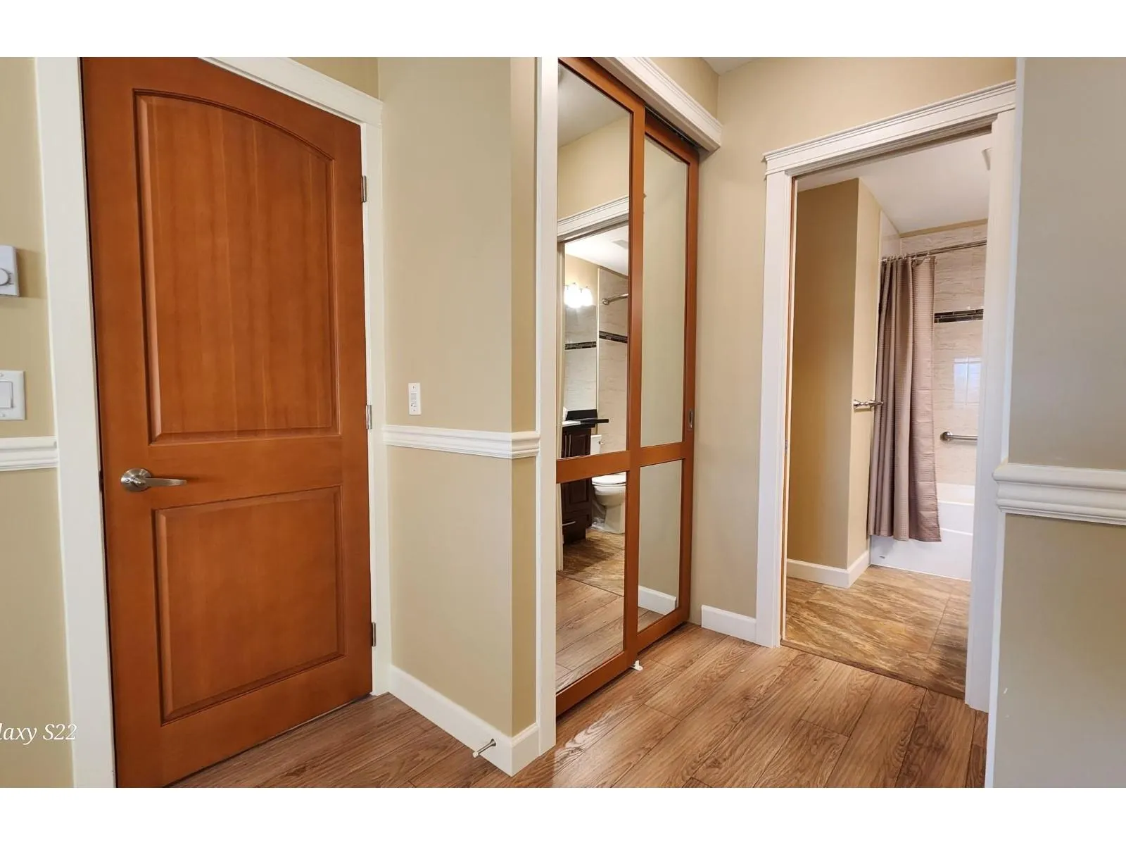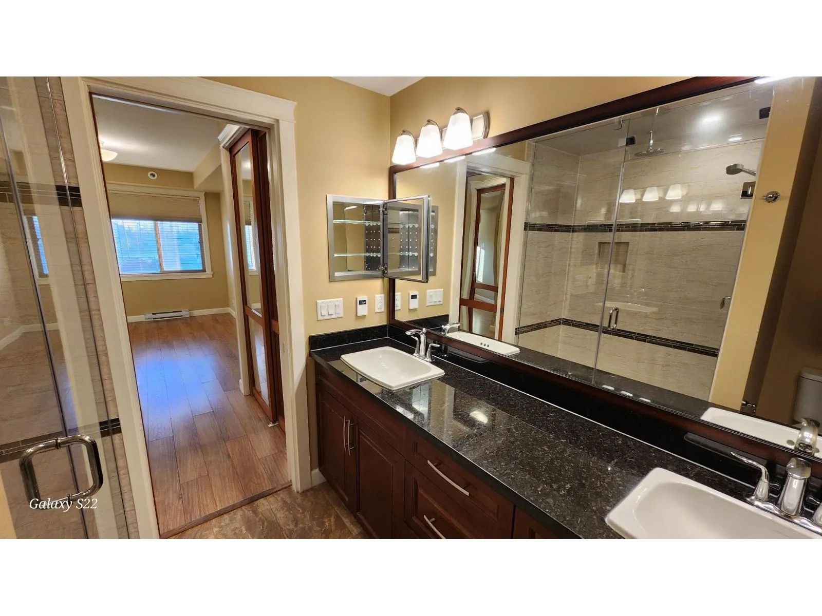 Welcome to this luxury spacious home featuring 9' ceilings, 2 bedrooms & den w/closet plus storage room. 2 full baths w/heated tile floors, heated fog free mirrors, built-in medicine cabinet & LED nightlight .All acoustic wood grained plank floors thru-out & Gourmet hardwood raised cabinets kitchen, granite counters, high end S/S appliances, gas stove. A/C-heat pump. Walls, ceilings & floors are acoustic quality. 2 underground parking stalls(7' high access) w/secured concrete walled mini garage(9'8"x8') having a plug for your EV car. Good visitor parking. Easy Hwy 1 access. Transit close, walk to nearby Willoughby Town shopping center and parks right outside your door. (id:27476)