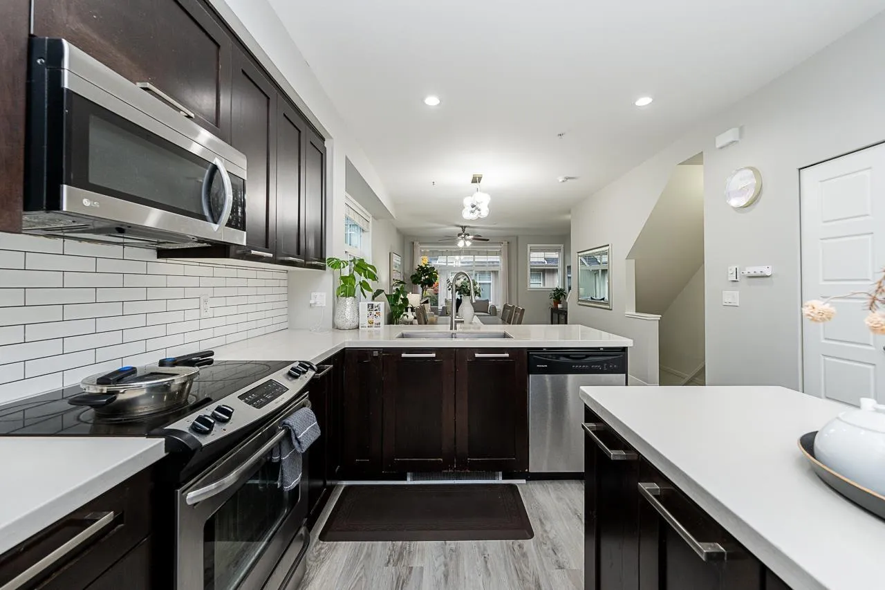 Welcome to Nature's Walk, an award-winning corner unit townhome in the heart of Willoughby! This bright and well-kept 3-bedroom home features newly updated flooring (2024) on the upper two levels, an open layout with extra windows for natural light, and a spacious kitchen with an oversized island, quartz countertops, stainless steel appliances, and maple shaker cabinets. Enjoy a sunny deck off the kitchen-perfect for BBQs or morning coffee. 3 bedrooms including a vaulted-ceiling primary with double closets and an ensuite featuring a large double shower. The tandem double garage provides extra storage and access to a fully fenced backyard. Pet-friendly complex, clubhouse, steps to Richard Bulpitt Elementary, parks, shops. Open house : Feb 01, Sunday 12pm~2pm (id:27476)