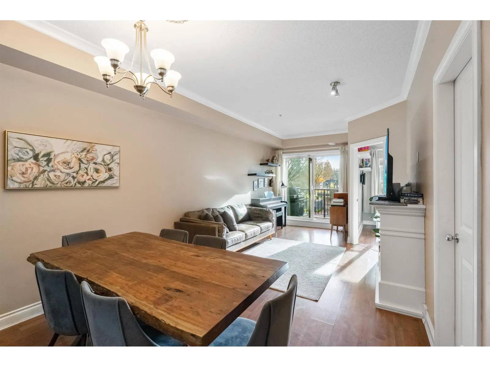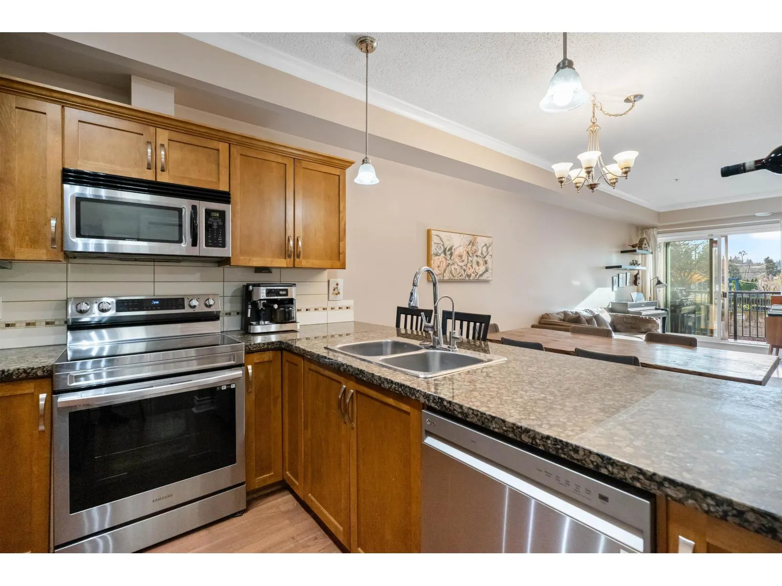 Your search is over! Welcome to this bright, beautifully maintained 2-bedroom 2 full bathroom + office + walk-in laundry room condo! The open-concept layout brings in tons of natural light, creating a warm and spacious feel. Enjoy a stylish kitchen with upgraded appliances, shaker cabinets, granite counters, and breakfast bar. Treat yourself to a large primary bedroom with tons of natural light and ensuite. Missing a walk-in laundry space? Look no further! large walk-in laundry room with sleek custom shelving/storage. The den is ideal as an office or flex room. Located in a well-built building on the quiet side of Langley City-close to parks, shops, recreation, and transit. (id:27476)