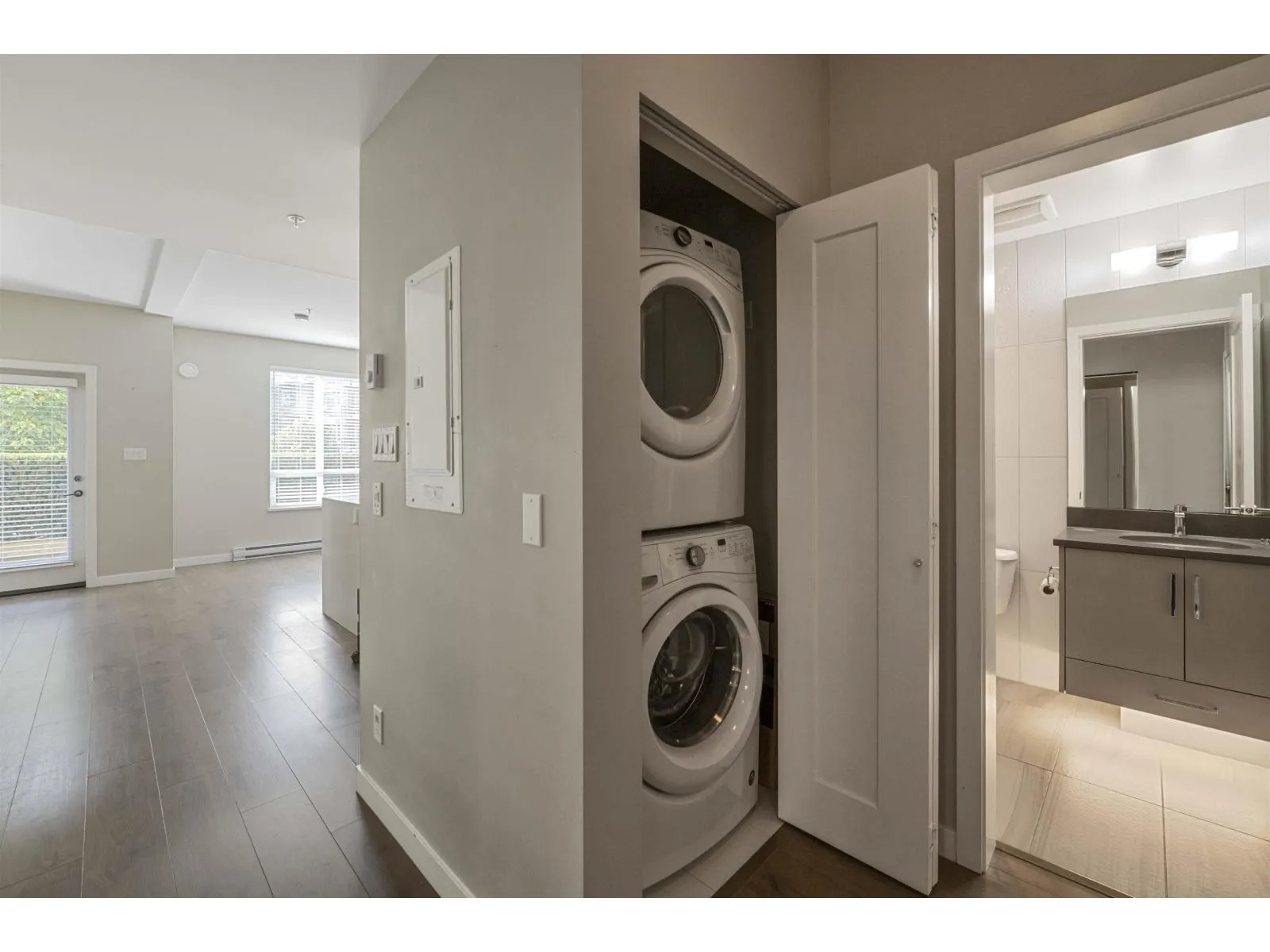 Welcome to Elements in the heart of Willoughby! This 1 bed, 1 bath condo on the first floor offers a bright, open layout with 9-ft ceilings, large windows, and a modern kitchen with quartz counters and stainless steel appliances. Enjoy in-suite laundry, a private balcony, and 1 parking stall (#347) plus a storage locker (#C-7). Steps to shops, transit, and schools with access to a top-tier clubhouse. (id:27476)