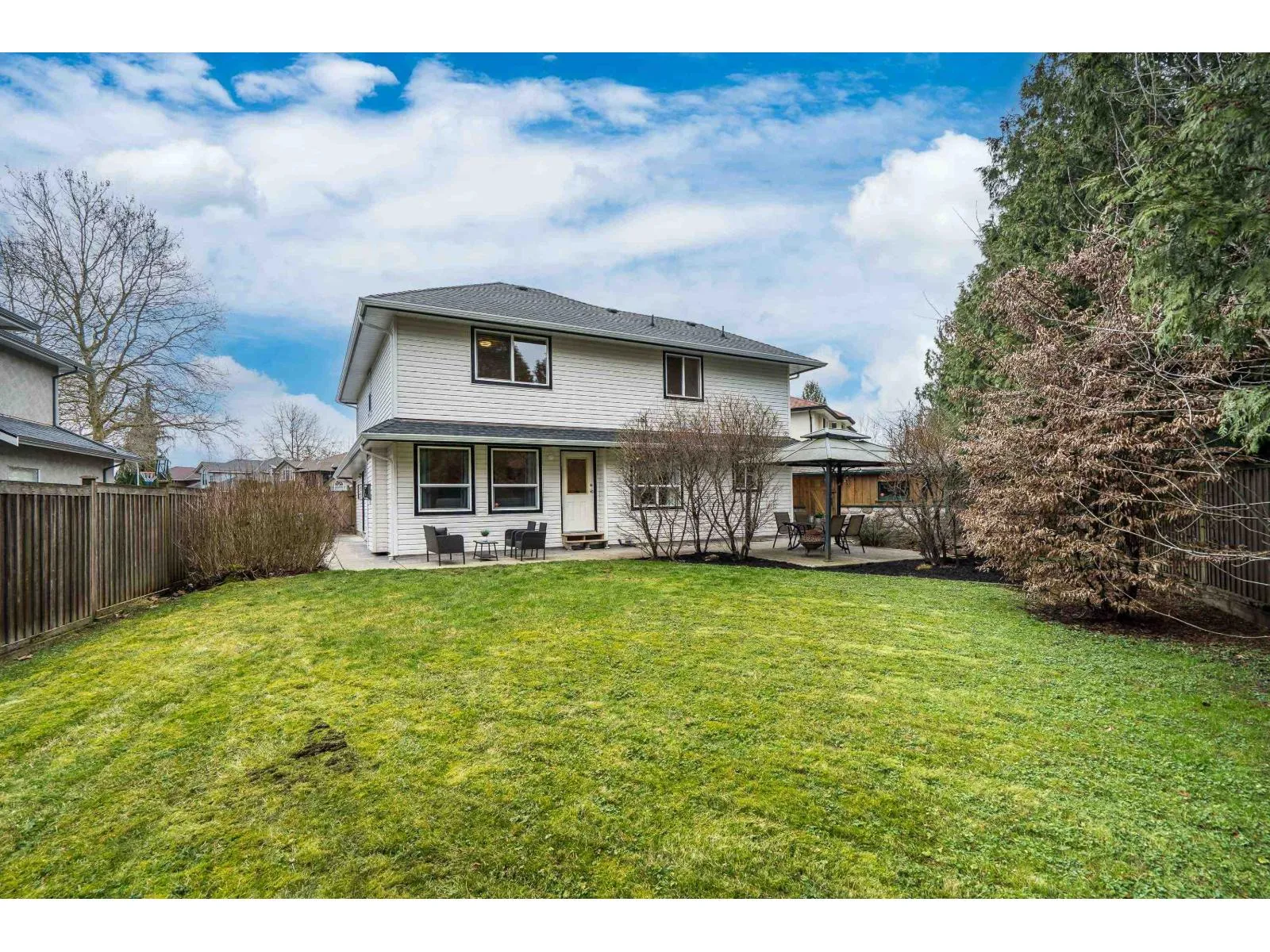 Attractive 2-storey home on a quiet, tree-lined street in upper Murrayville. Main floor features a welcoming living room w/ hardwood floors, gas fireplace, vaulted ceilings, & an adjacent dining area w/ crown molding. Kitchen w/ white cabinets, stainless appliances, tile backsplash, pot lights, & open eating area. Family room w/ gas fireplace & access to fenced rear yard w/ stamped concrete patios, gazebo, & large storage shed/shop w/ home office/flex space possibilities. Main floor bedroom/den, powder room, & laundry. Upstairs offers a generously sized primary bedroom w/ 5 pc ensuite, 3 additional bedrooms, & a full 4-pc bathroom. Central air-conditioning & crawl space storage. Great family neighbourhood close to parks, dog park, cafes, shops, schools, hospital, & WC Blair Rec. Centre. (id:27476)