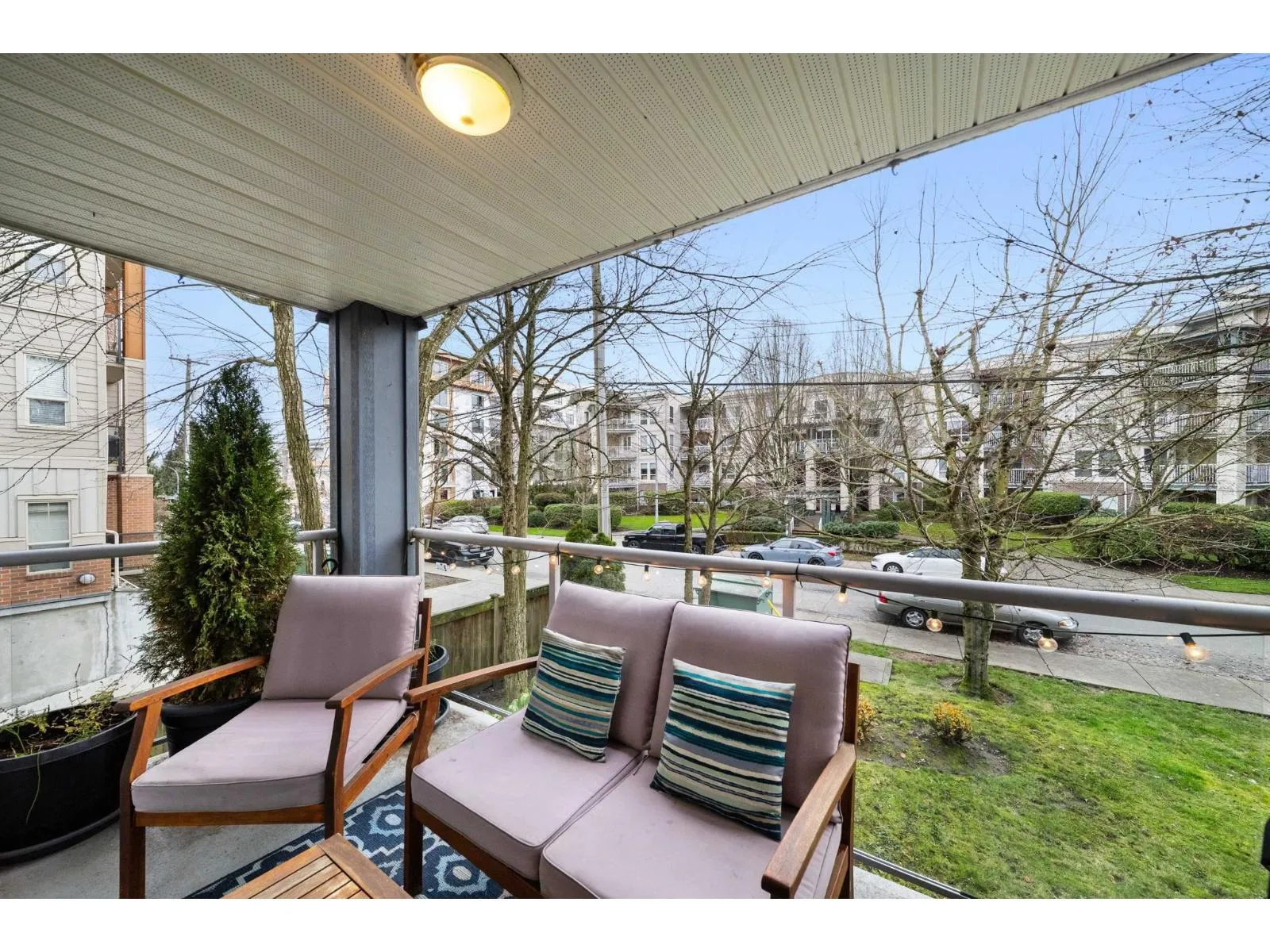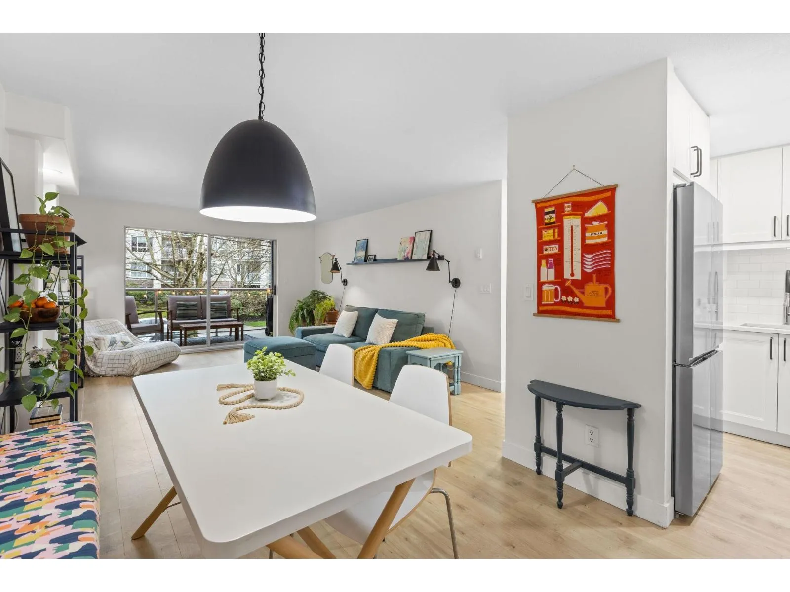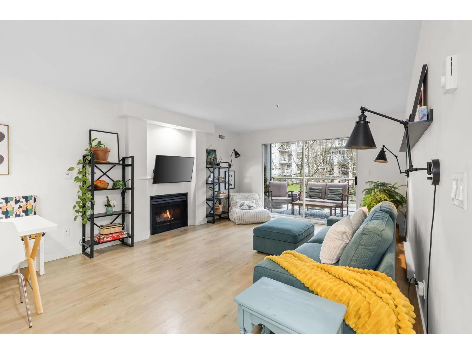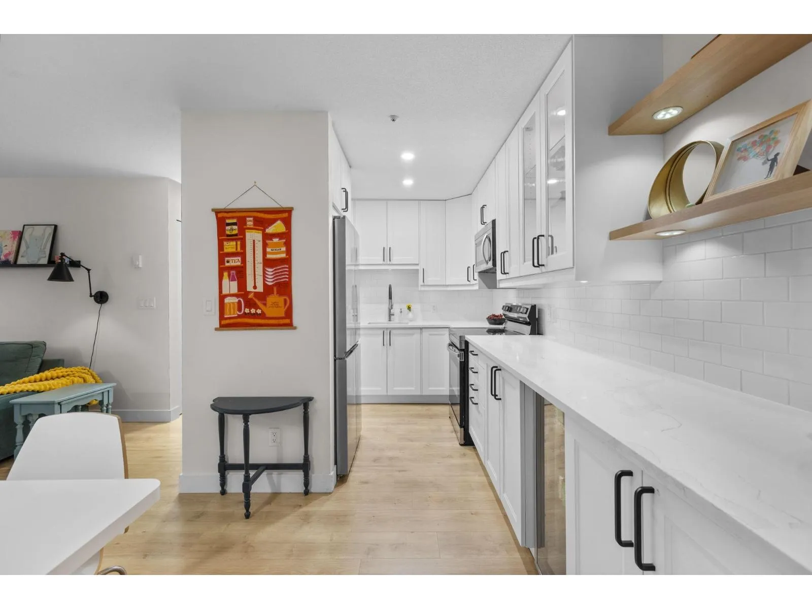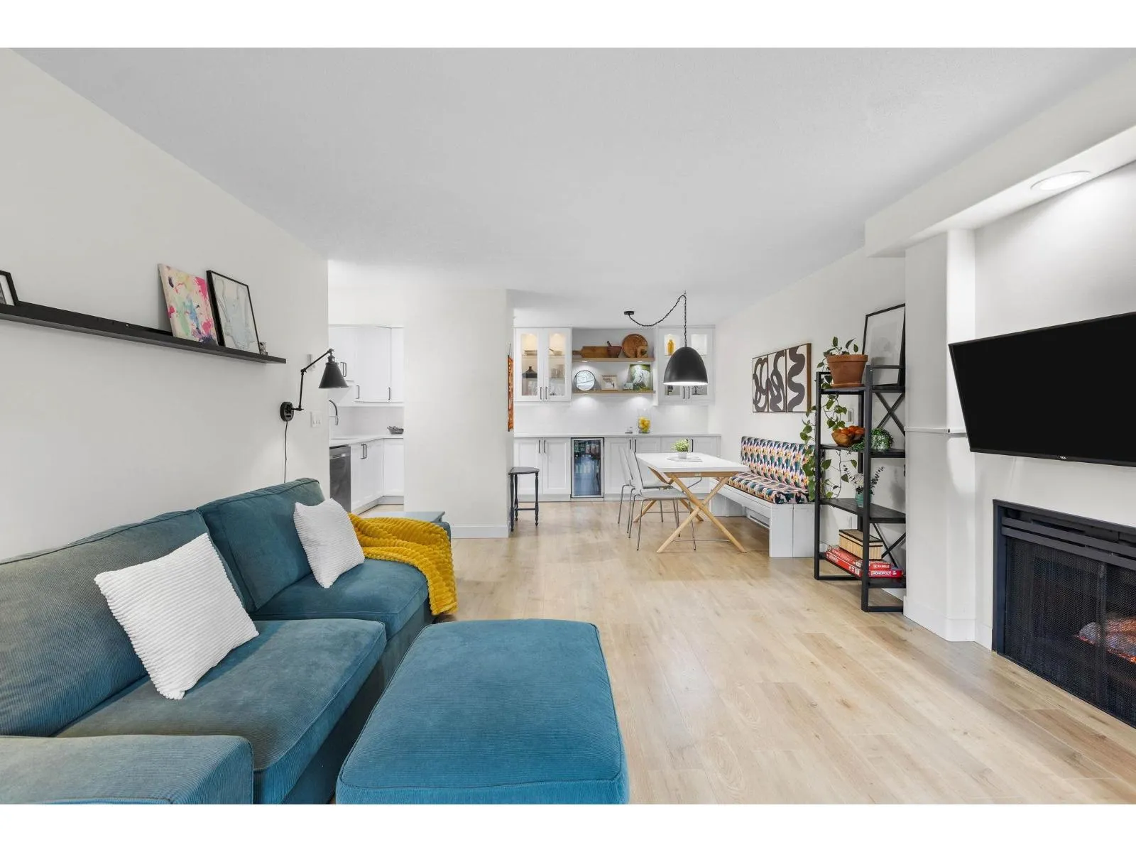 Step inside and fall in love. This bright 2 bed, 2 bath corner suite has been thoughtfully upgraded. The kitchen shines with expansive quartz counters, a custom coffee bar with floating shelves and bar fridge, sleek white shaker cabinets with soft close doors and under mount lighting, plus stainless appliances including a 4 door fridge. Oak laminate flooring and custom lighting carries through the home for a warm, elevated feel. The open living and dining space is perfect for relaxing by the gas fireplace or stepping onto your sunny south facing balcony. Enjoy views of mature trees from every room. Both bathrooms feature quartz counters and deep soaker tubs. Full size laundry adds convenience. Bonus extra street parking for your second car and a short distance to the future SkyTrain. (id:27476)