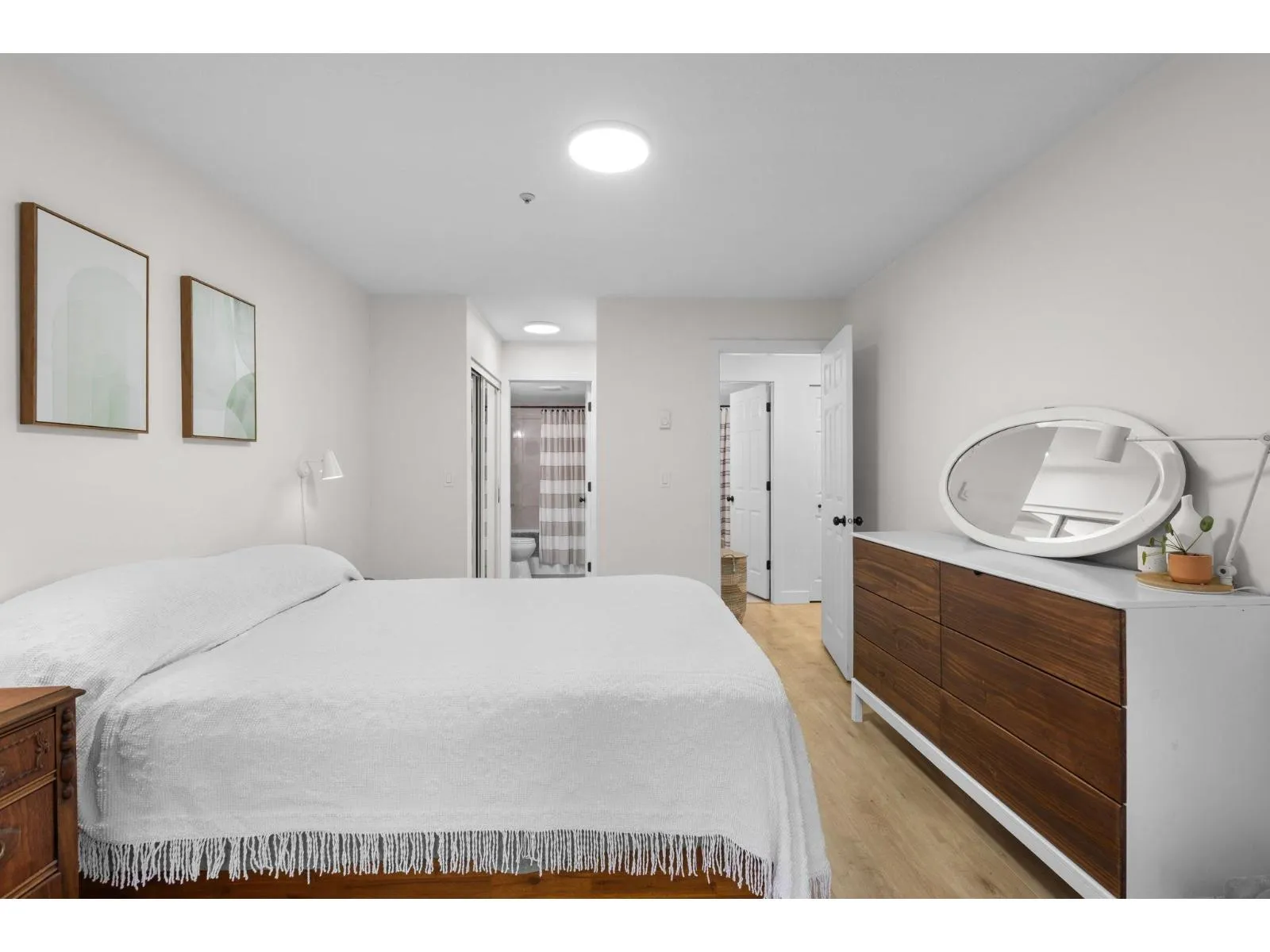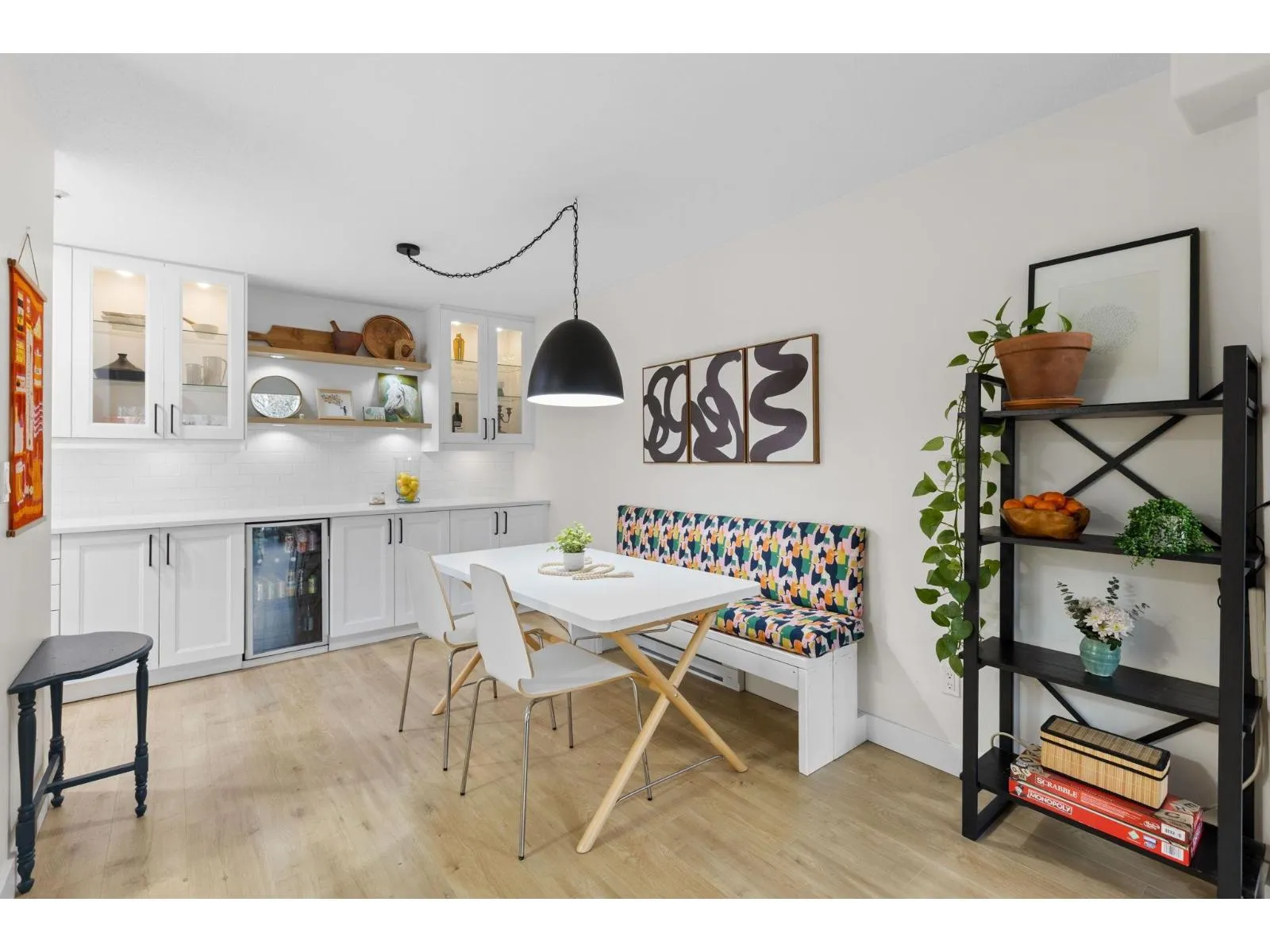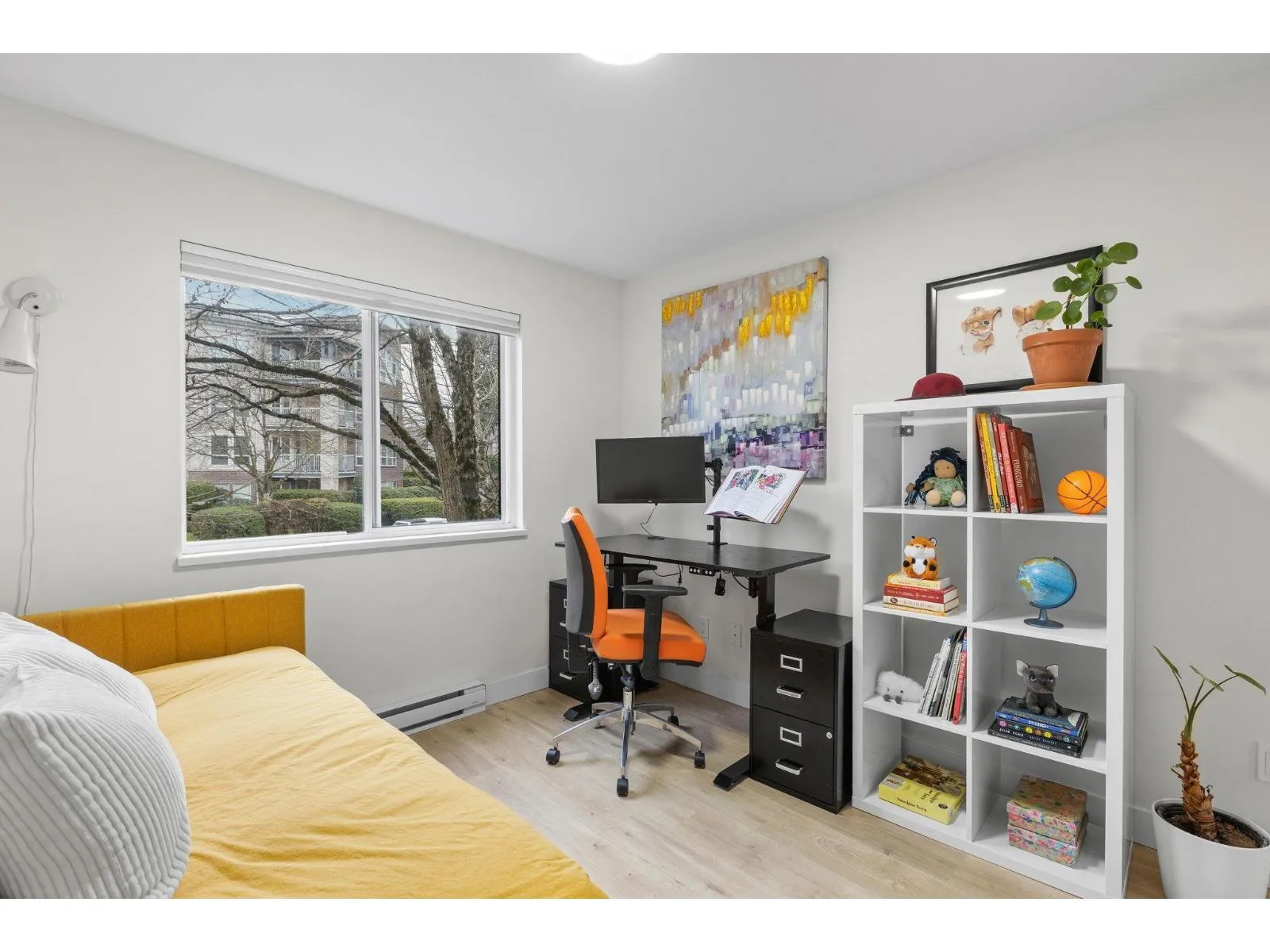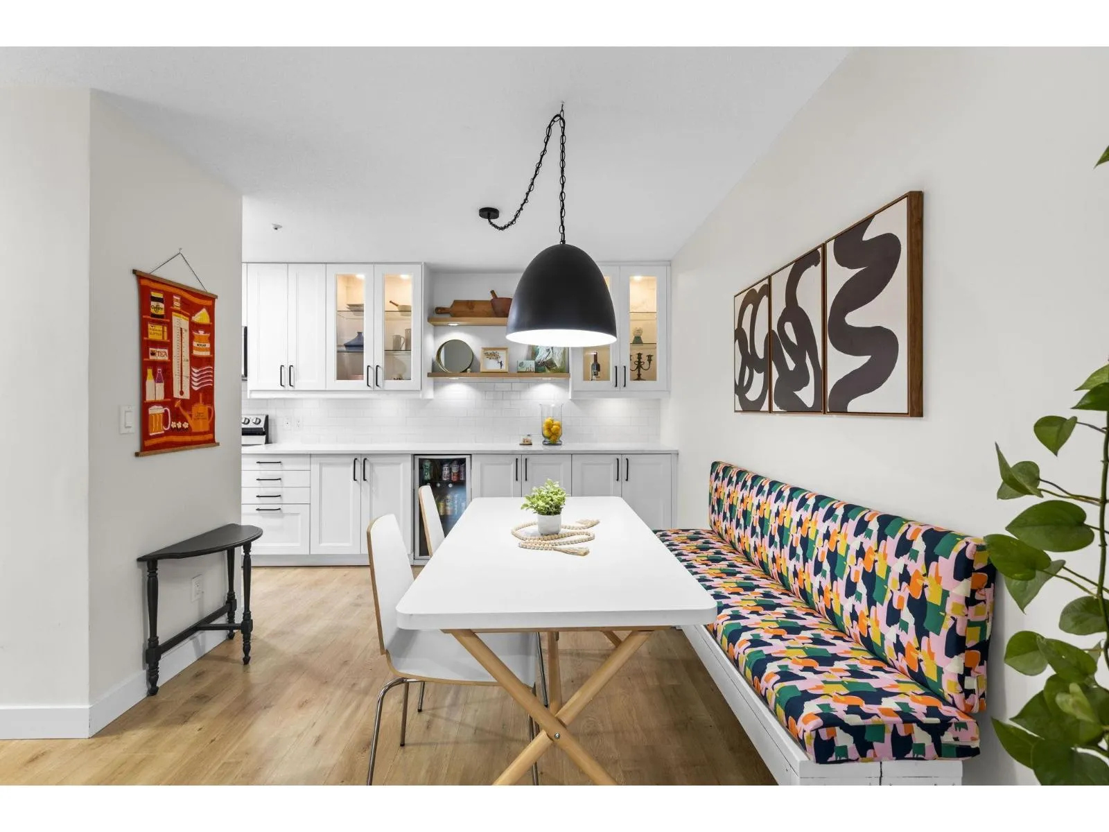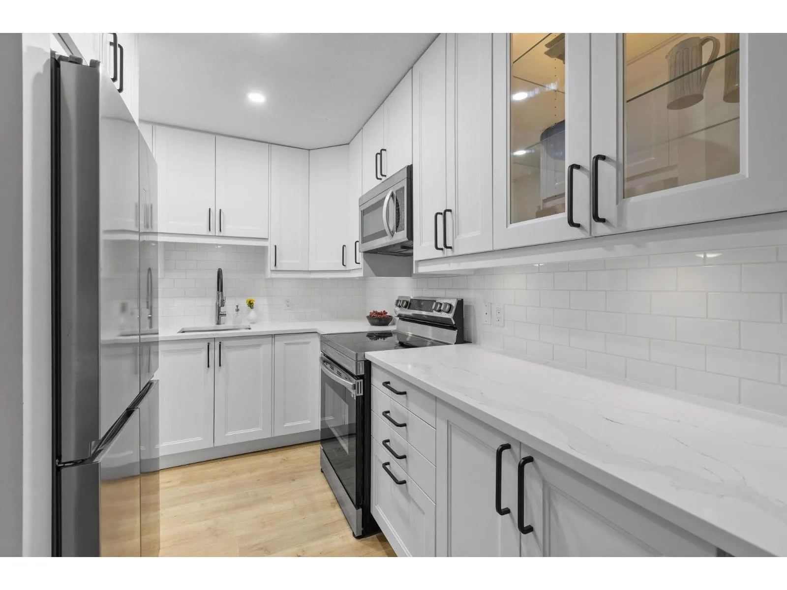 Step inside and fall in love. This bright 2 bed, 2 bath corner suite has been thoughtfully upgraded. The kitchen shines with expansive quartz counters, a custom coffee bar with floating shelves and bar fridge, sleek white shaker cabinets with soft close doors and under mount lighting, plus stainless appliances including a 4 door fridge. Oak laminate flooring and custom lighting carries through the home for a warm, elevated feel. The open living and dining space is perfect for relaxing by the gas fireplace or stepping onto your sunny south facing balcony. Enjoy views of mature trees from every room. Both bathrooms feature quartz counters and deep soaker tubs. Full size laundry adds convenience. Bonus extra street parking for your second car and a short distance to the future SkyTrain. (id:27476)