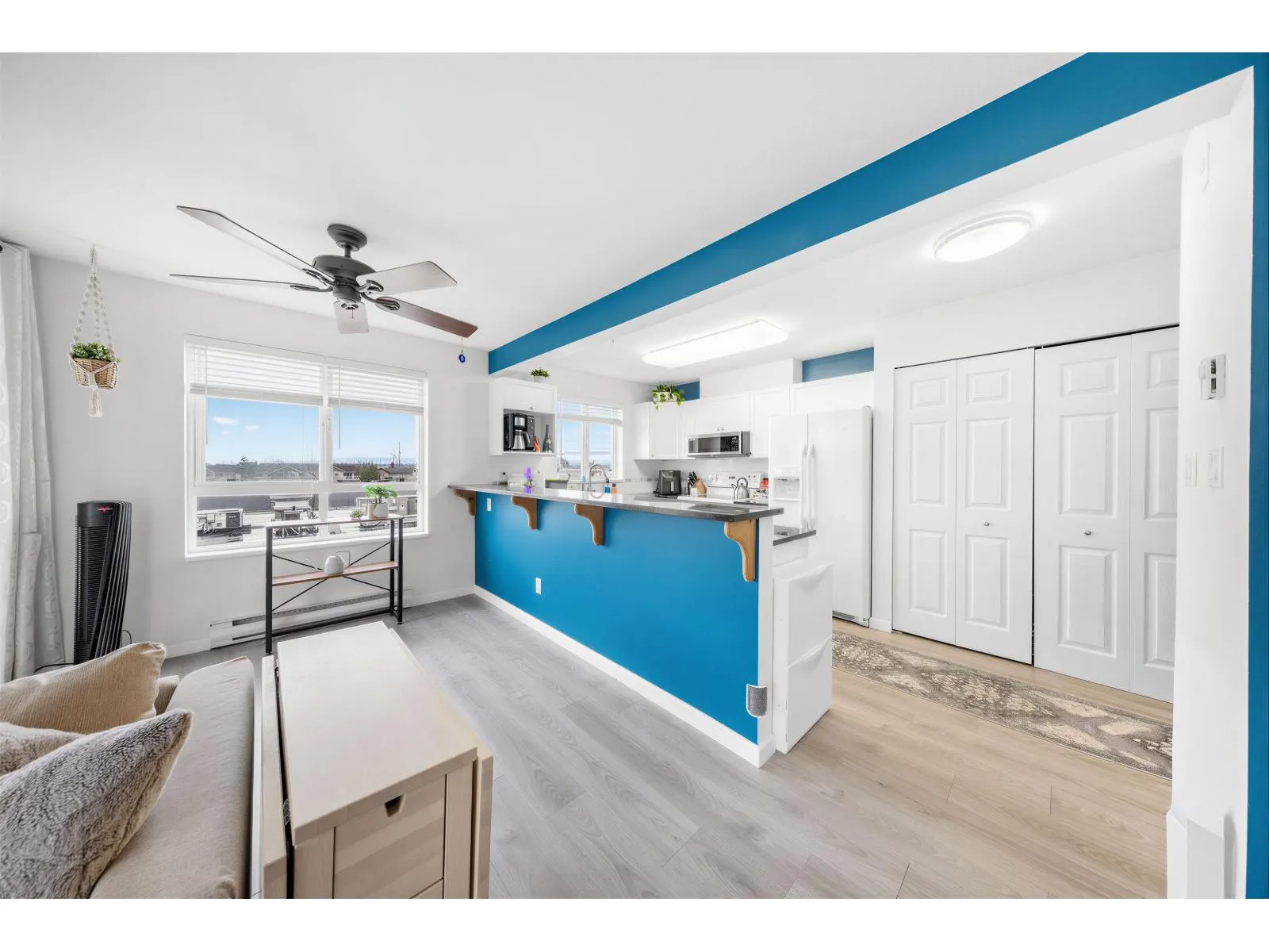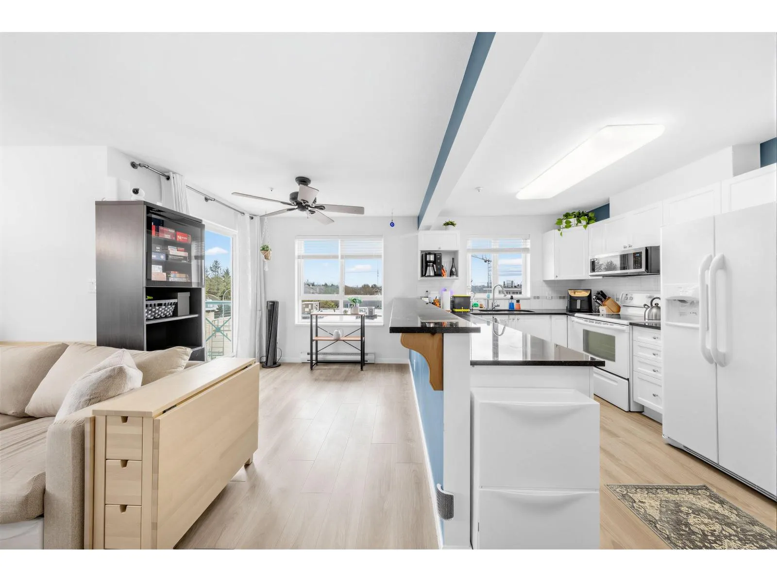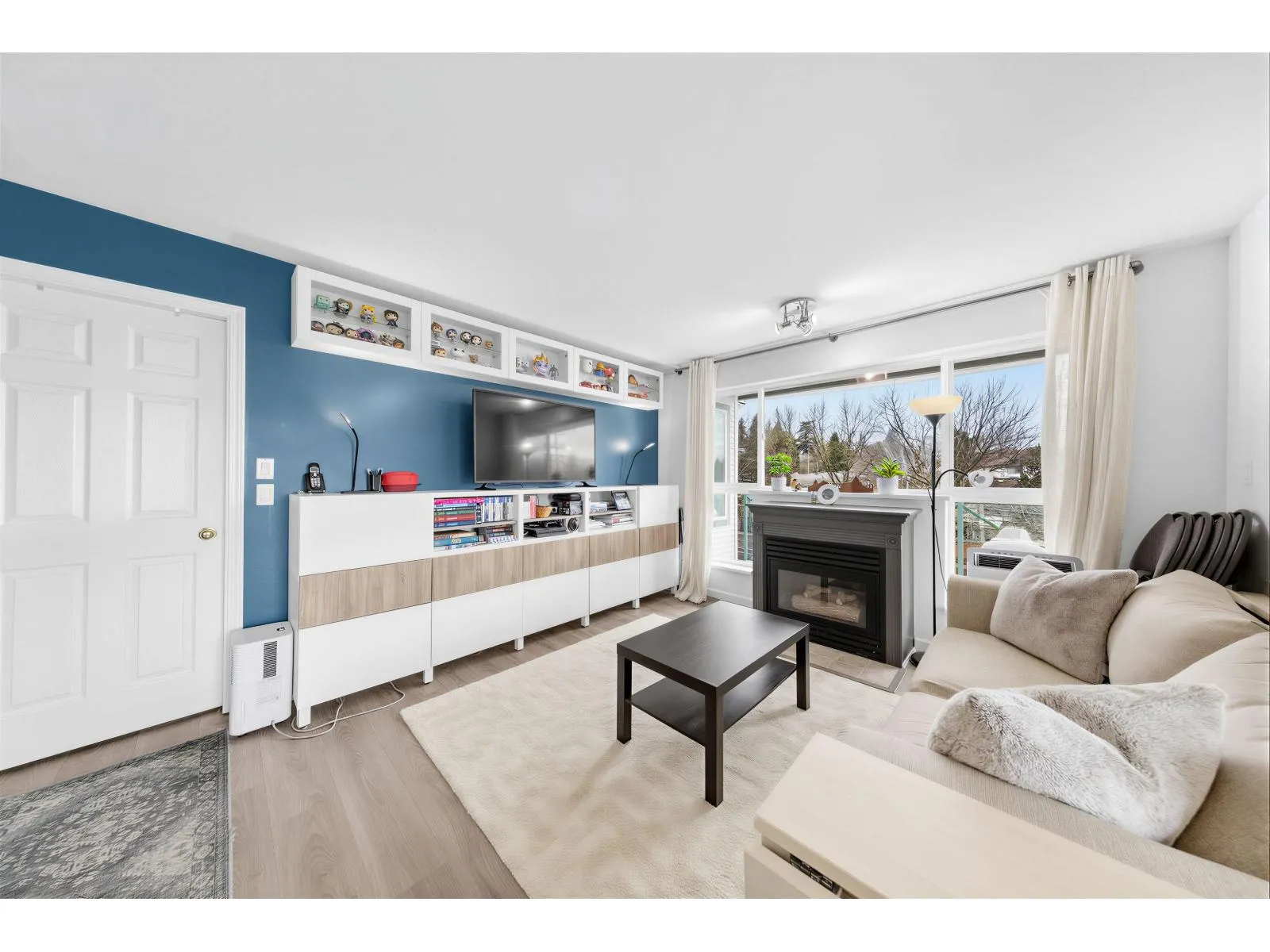 A fantastic opportunity for first-time buyers or investors alike! Welcome to Willowgate-a bright and beautifully 1-bedroom, 744 sq ft home offering comfortable and functional living. This unit features northeast exposure, mountain views, and a spacious L-shaped balcony perfect for relaxing or entertaining. The open-concept kitchen flows seamlessly into the living area, complete with a cozy gas fireplace (gas included in strata fees) and a generously sized bedroom. Includes 1 parking stall. Located in an unbeatable, walkable neighbourhood-just steps to Willowbrook Mall, Superstore, restaurants, and transit, and only a few blocks from the future SkyTrain. (id:27476)