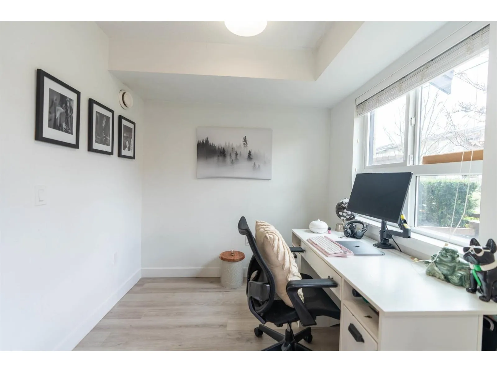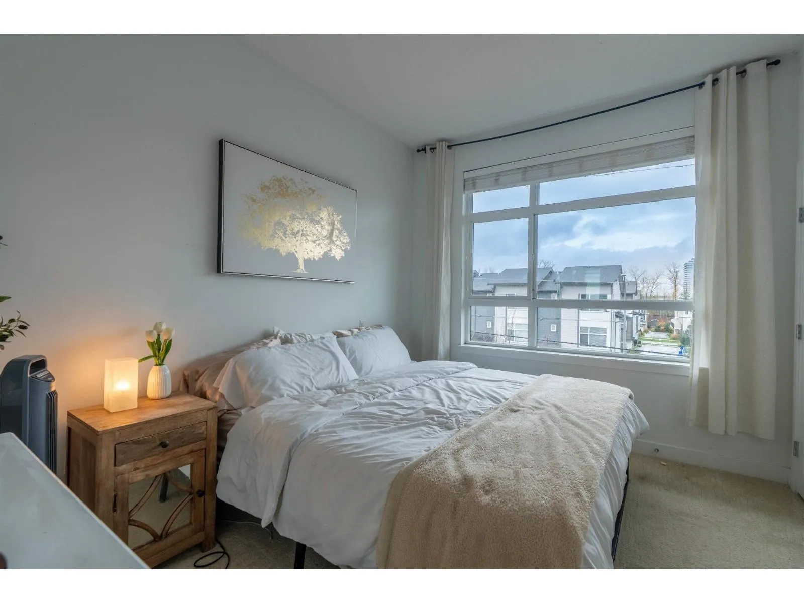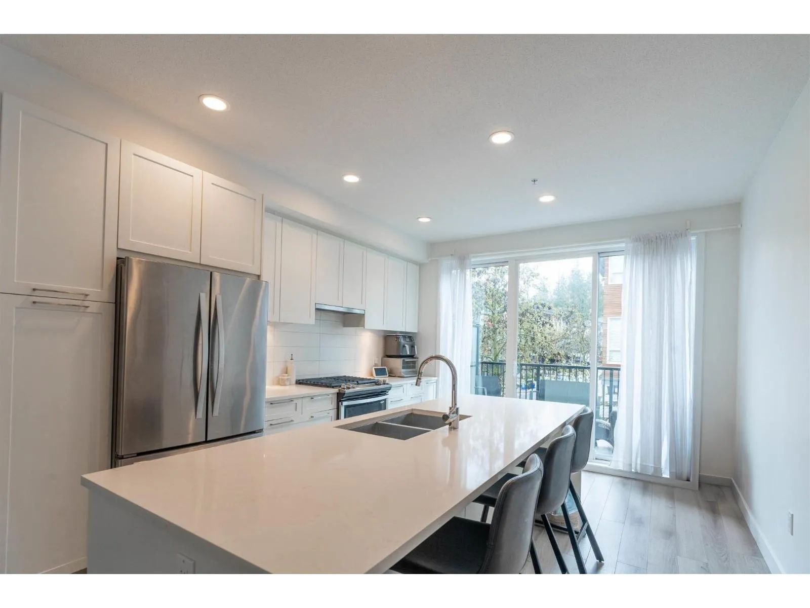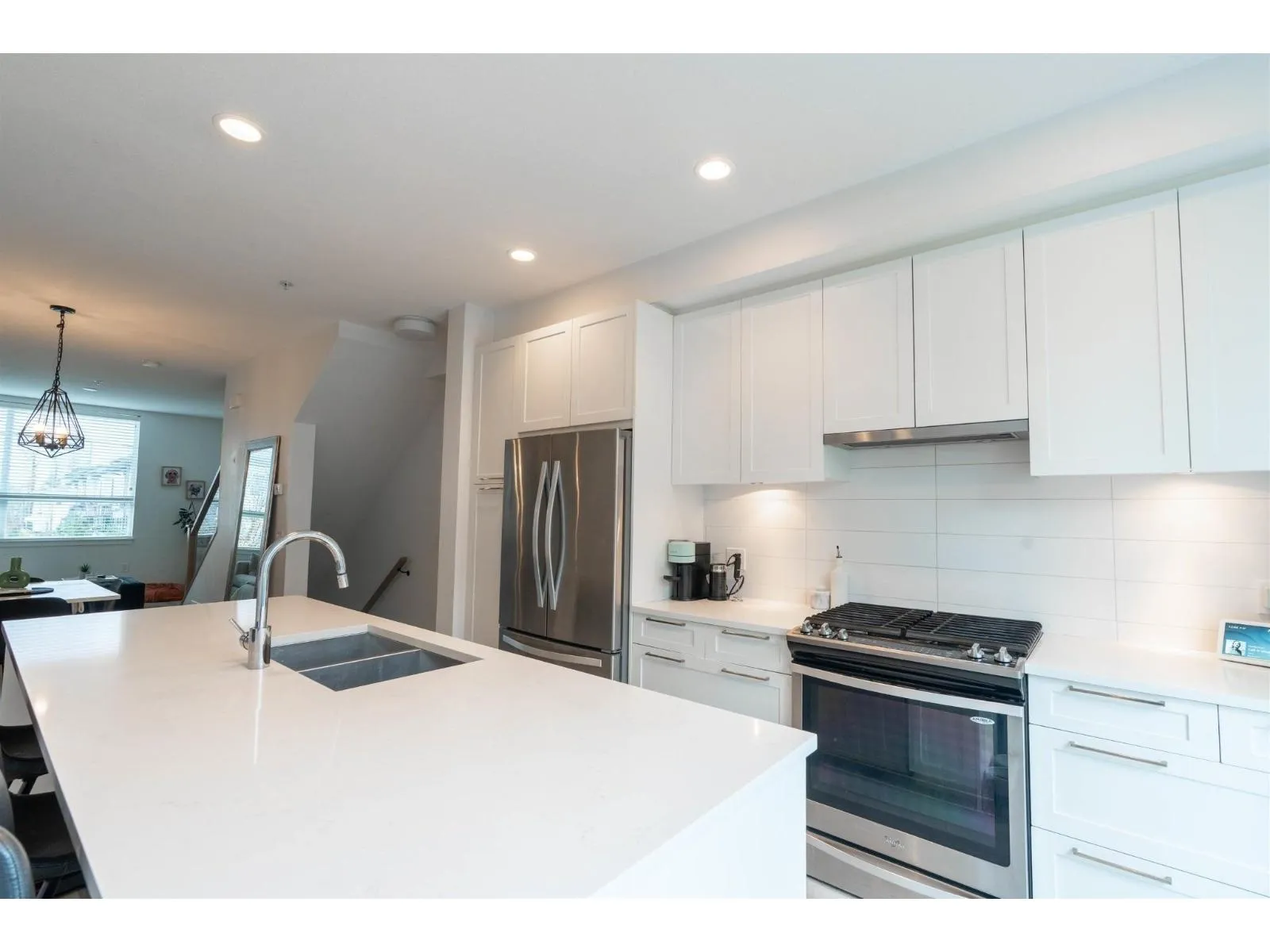 Welcome to this Bright and modern 1,232 sq. ft. 2-bed + den townhome featuring 9 ft ceilings, open-concept living, and a quality kitchen with SS appliances, 5-burner gas range, hidden hood fan, French door fridge, quartz counters, and a large island. Enjoy comfortable main-floor living with forced-air heating, laminate/tile flooring, and plush carpeting upstairs. Two spacious bedrooms plus a flexible den-perfect for an office or nursery. West Coast exterior with hardy plank siding and cedar accents. Parking for two, easy street parking, low strata fees, and a prime Willoughby location near parks, schools, shopping, and transit. A stylish, well-maintained home in a sought-after community. Open house 2-4pm Feb7/8. (id:27476)