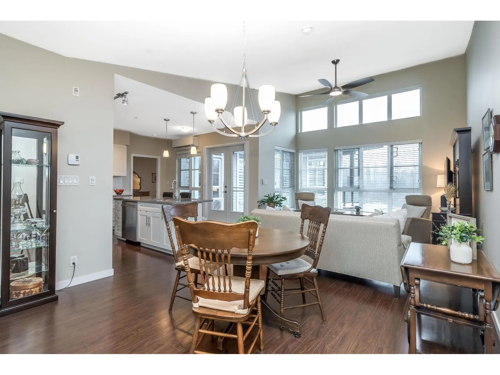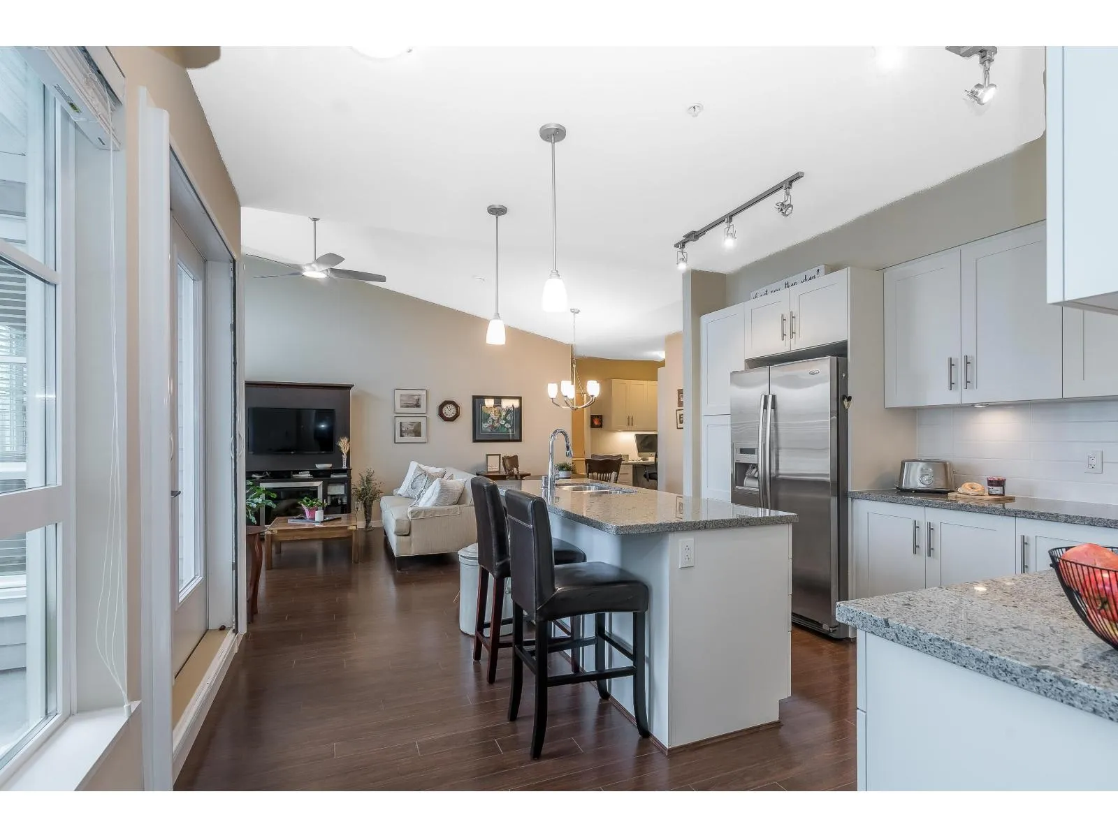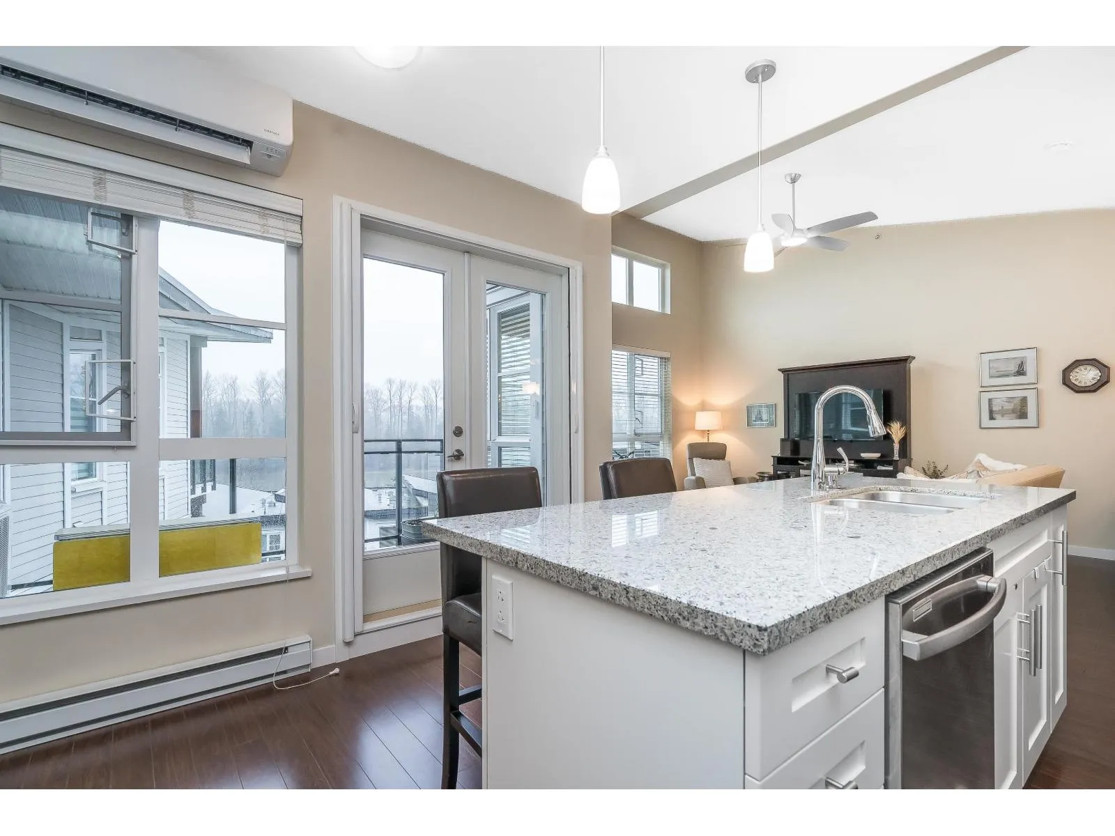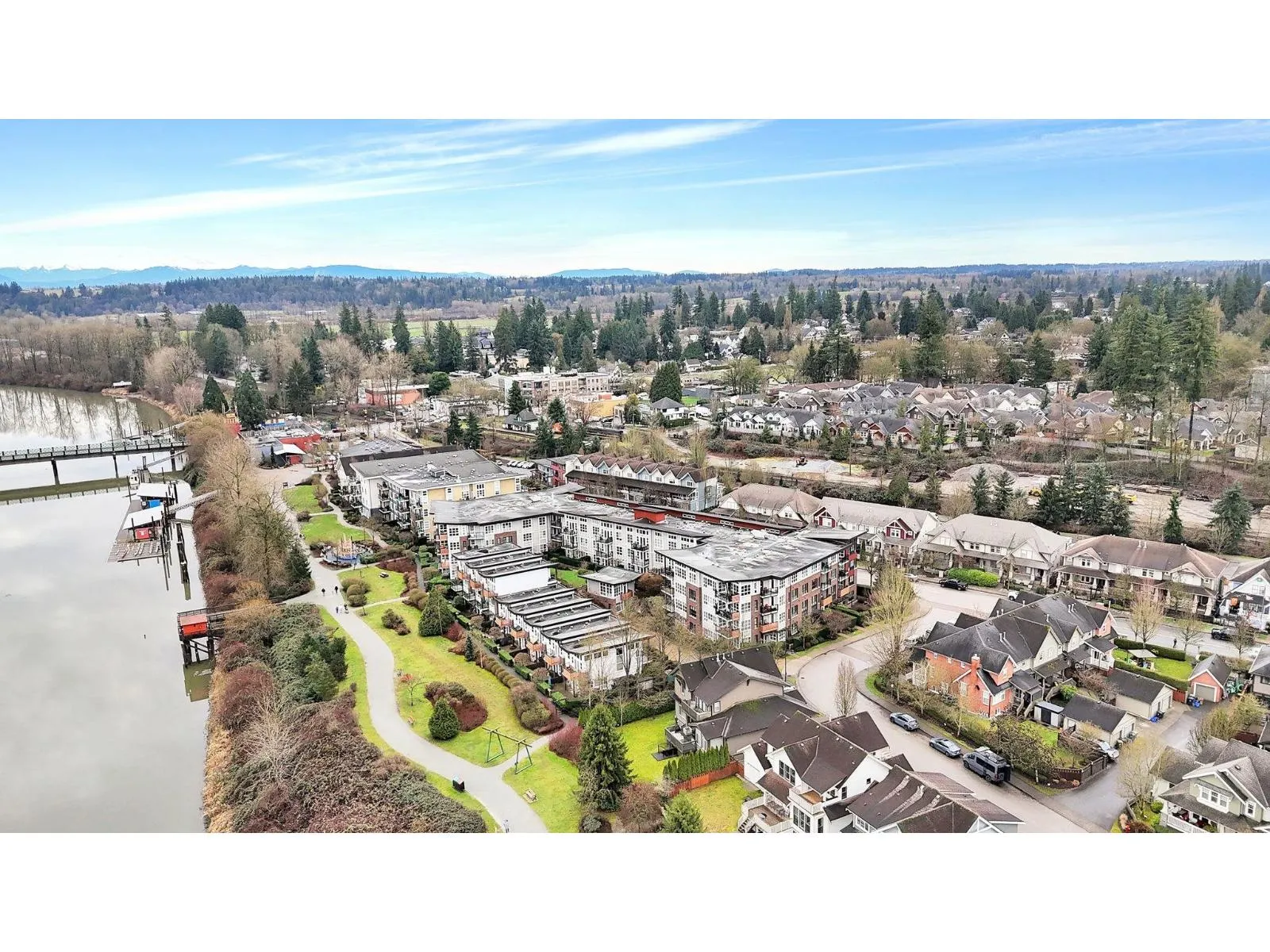 WATERFRONT LIVING AT ITS BEST! Rarely available, spacious 1,300+ SF 2-bdrm & den home located in the highly sought-after Waterfront at Bedford Landing in Fort Langley. Enjoy soaring vaulted ceilings in the living room & 2nd bdrm, flooding the space with natural light & stunning river views. The well-appointed kitchen features ample cabinetry & counter space, plus an oversized island. The generous primary bedroom offers a large W/I closet & a spa-inspired ensuite w/ soaker tub & walk-in shower. Additional highlights include side-by-side parking conveniently located near the elevator, a mini-split A/C system added in 2023, and custom built-in cabinetry and desk in the den-ideal for a home office. Set within a vibrant, community just steps to restaurants, shopping, scenic trails & more ! (id:27476)
