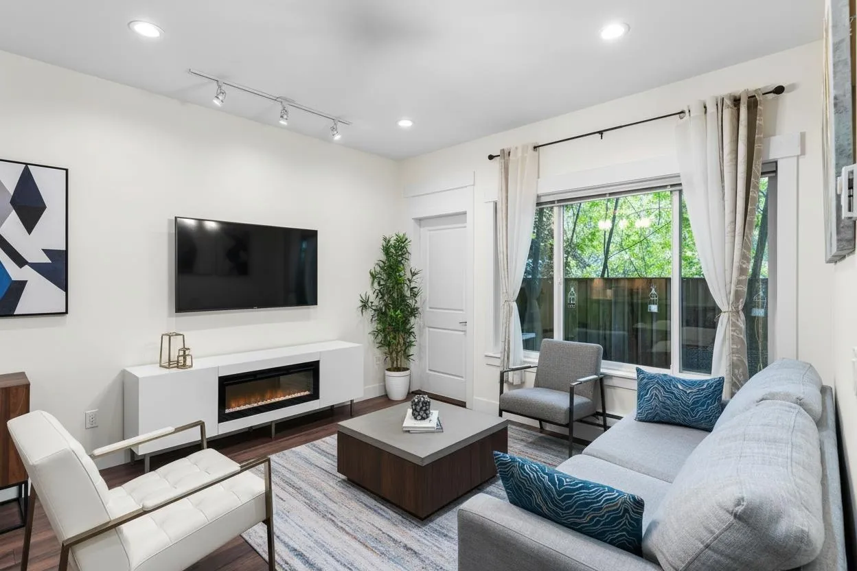 YORK Living craftsman-style townhome offering over 1,800 sq.ft. of modern, functional living. Main floor features a stylish kitchen, spacious living & dining areas, and a powder room. Upper level offers 3 bedrooms including primary with 4-pce ensuite, open den, laundry, and full bath. Top floor boasts a 25' x 14' attic room with full bath-ideal for media room, games room, or extra bedroom. Bright interiors with 9' ceilings and stone fireplace. Well maintained with recent upgrades incl. new washer, bathroom sink, toilet seat & additional plumbing improvements. **Photos are virtually staged** (id:27476)