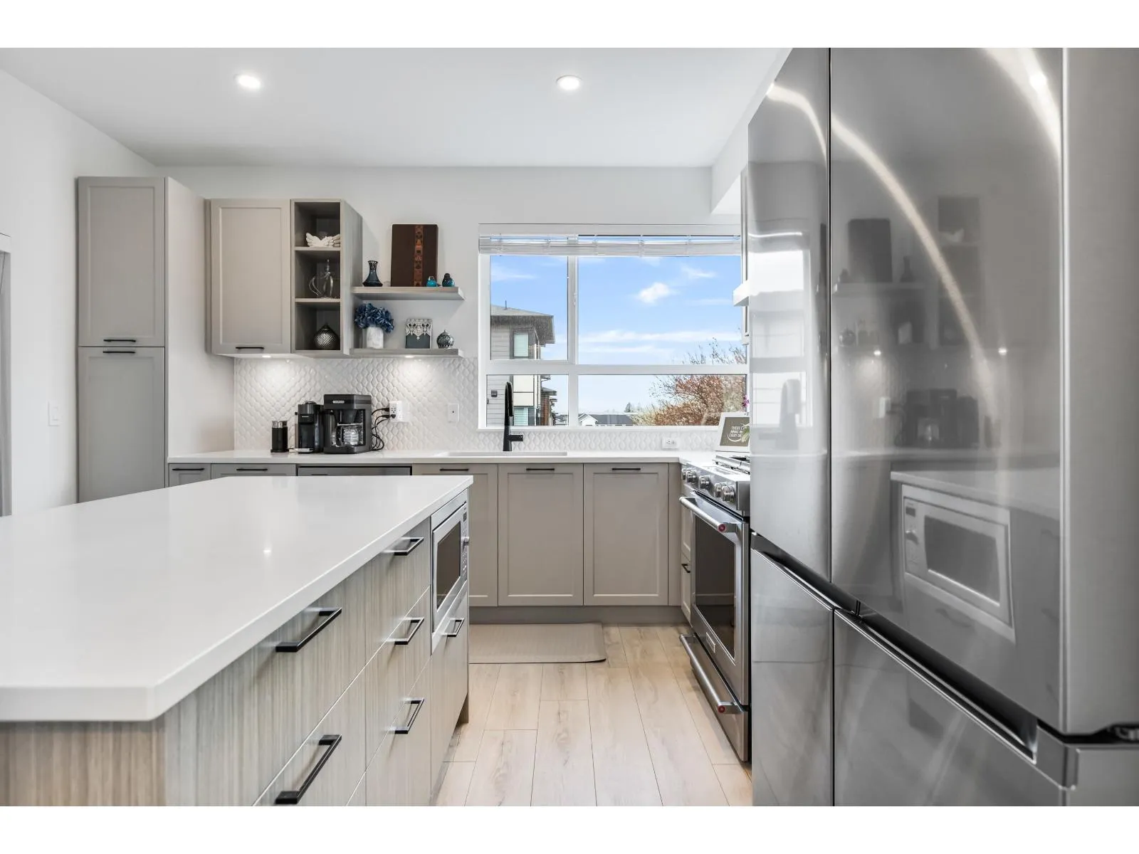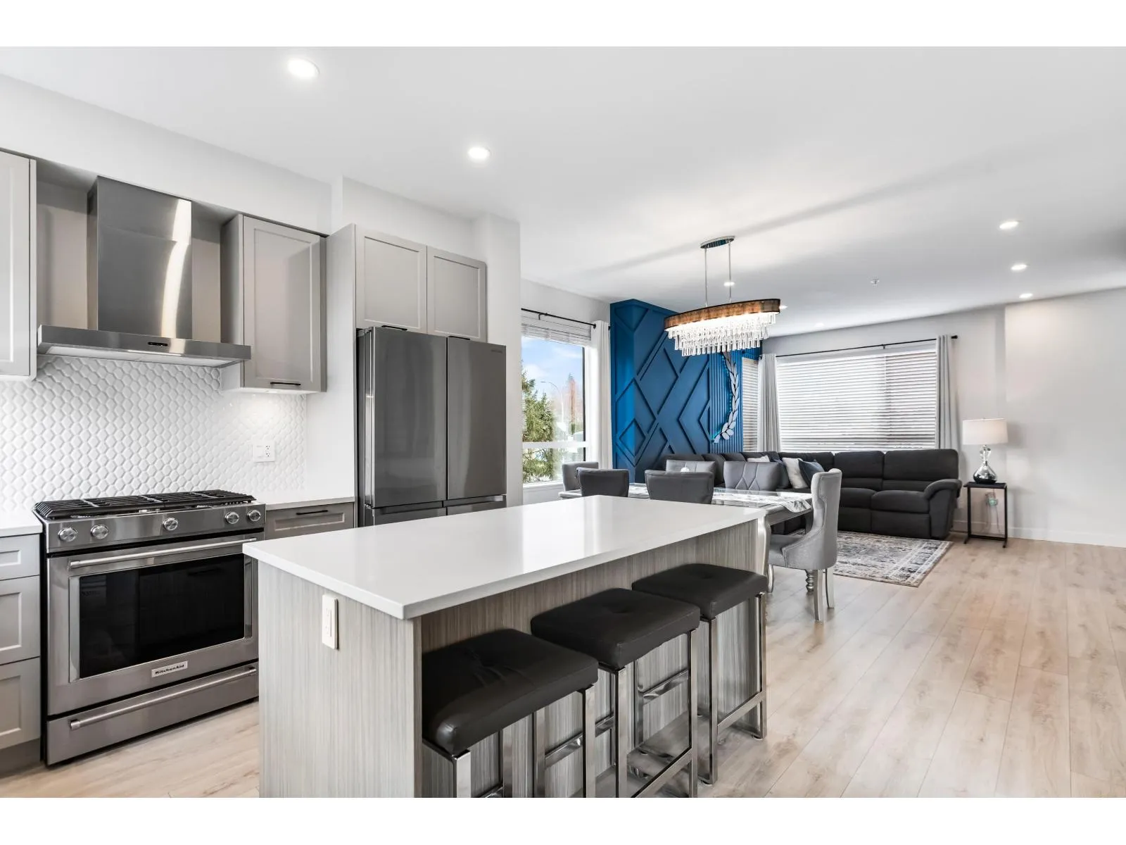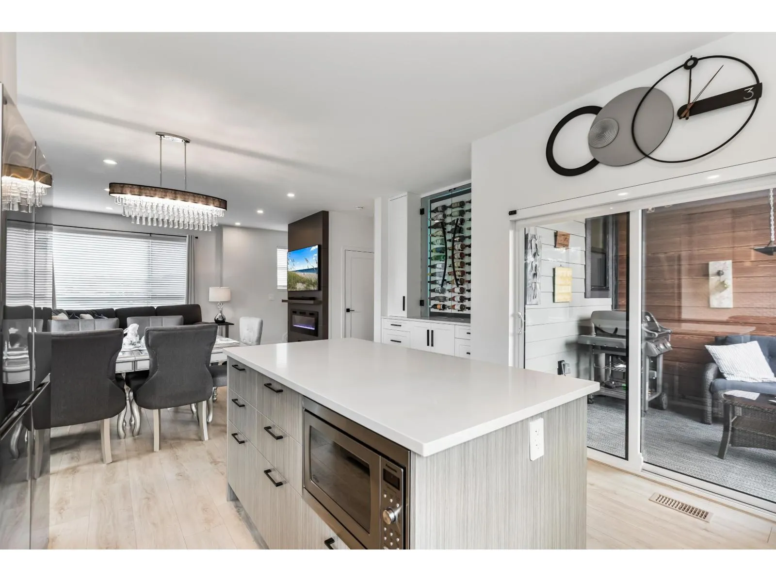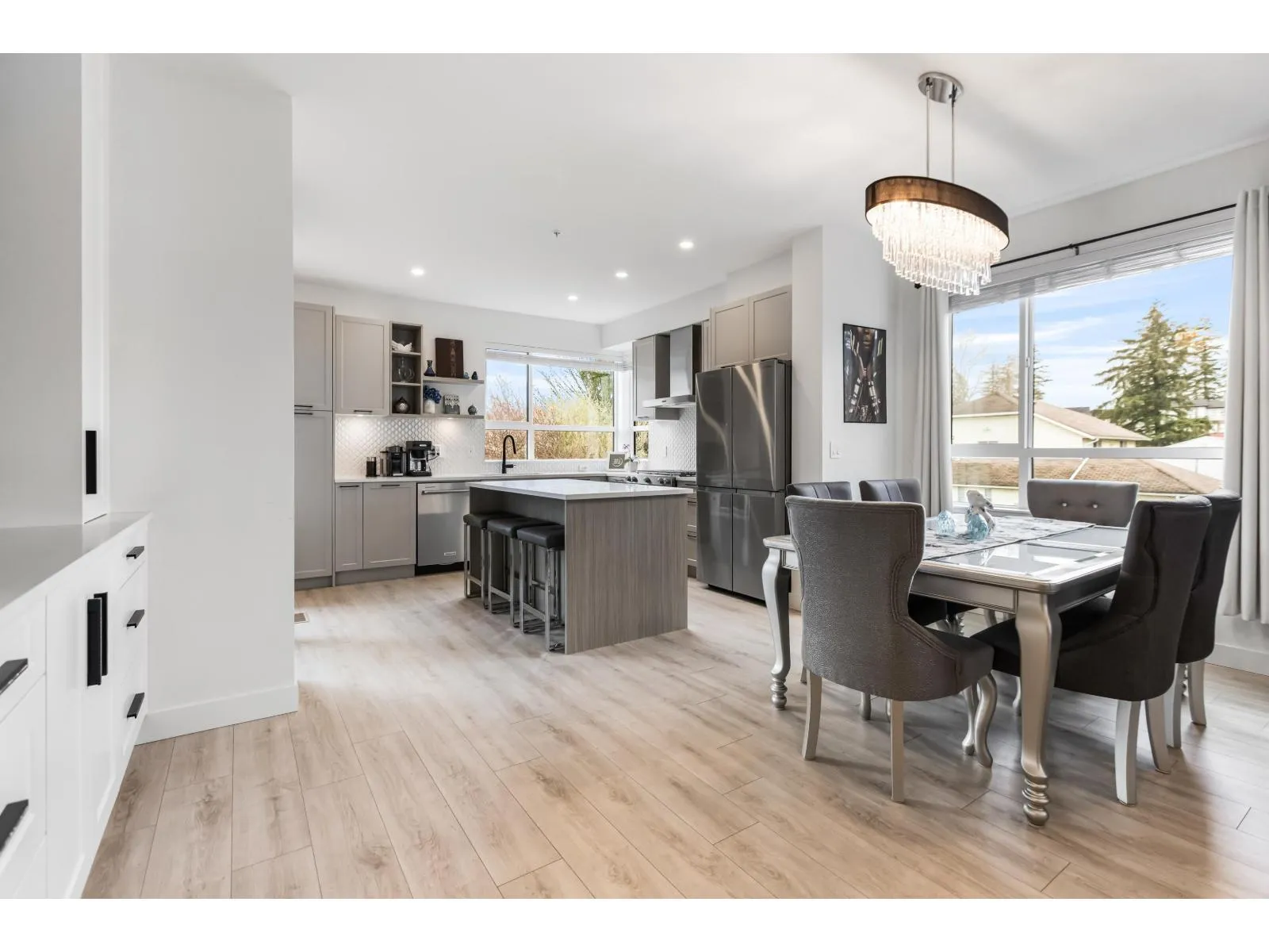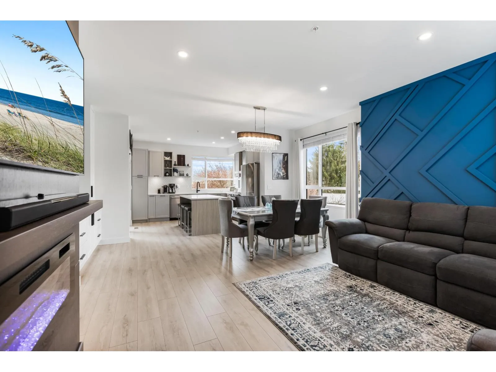 Welcome to Verge, a stunning end-unit townhouse built in 2023 with show-home quality finishes. This 3 bdrm home offers A/C & lower-floor office with built-in desk. The open-concept main floor features a gourmet kitchen with large island, gas stove, S/S appliances, built-in microwave & ample cabinetry & counter space. Built-in dining cabinetry with light-up wine display complements the living room with feature wall & electric F/P. Upstairs, the primary bdrm features a coffered ceiling, wall paneling, chandelier, electric fireplace & walk-in closet with full cabinetry + a luxurious 4 pc ensuite with double sinks & stand-up shower. 2 additional bdrms, 4 pc bath & large double garage with textured floor, cabinets & shelves complete the home. Ideally located in Langley, close to all amenities. (id:27476)