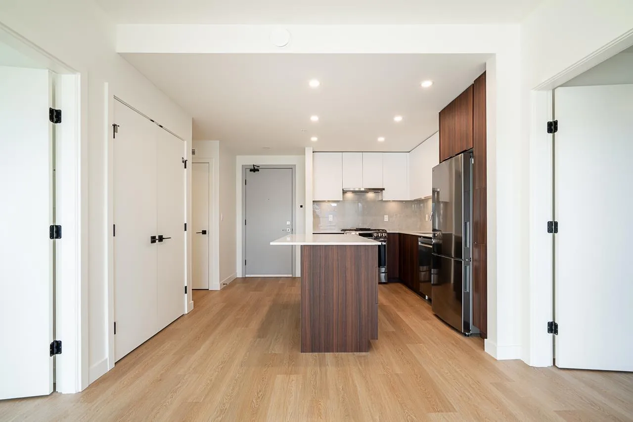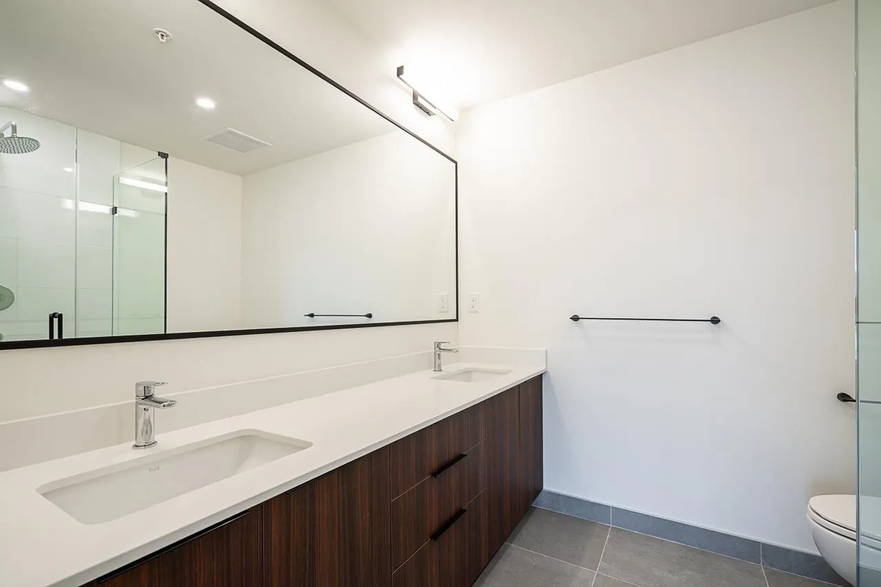 Great location and layout! This corner 2 bedroom, 2 bathroom home is located in the heart of Willoughby Town Centre and checks every box. Thoughtfully designed with bedrooms on opposite sides for maximum privacy, two ensuites, and walk-in closets. Bright south-facing exposure, 2 parking stalls, and a large patio perfect for entertaining. Enjoy added privacy with no neighbour on the left side. Open-concept living with laminate flooring, expansive windows, and a modern kitchen featuring two-tone cabinetry, quartz countertops, stainless steel appliances, and pull-out pantry. Quiet side of the building, roughed-in for portable A/C, in-suite laundry included. Walk to shops, restaurants, and all amenities. great value, move in anytime! (id:27476)